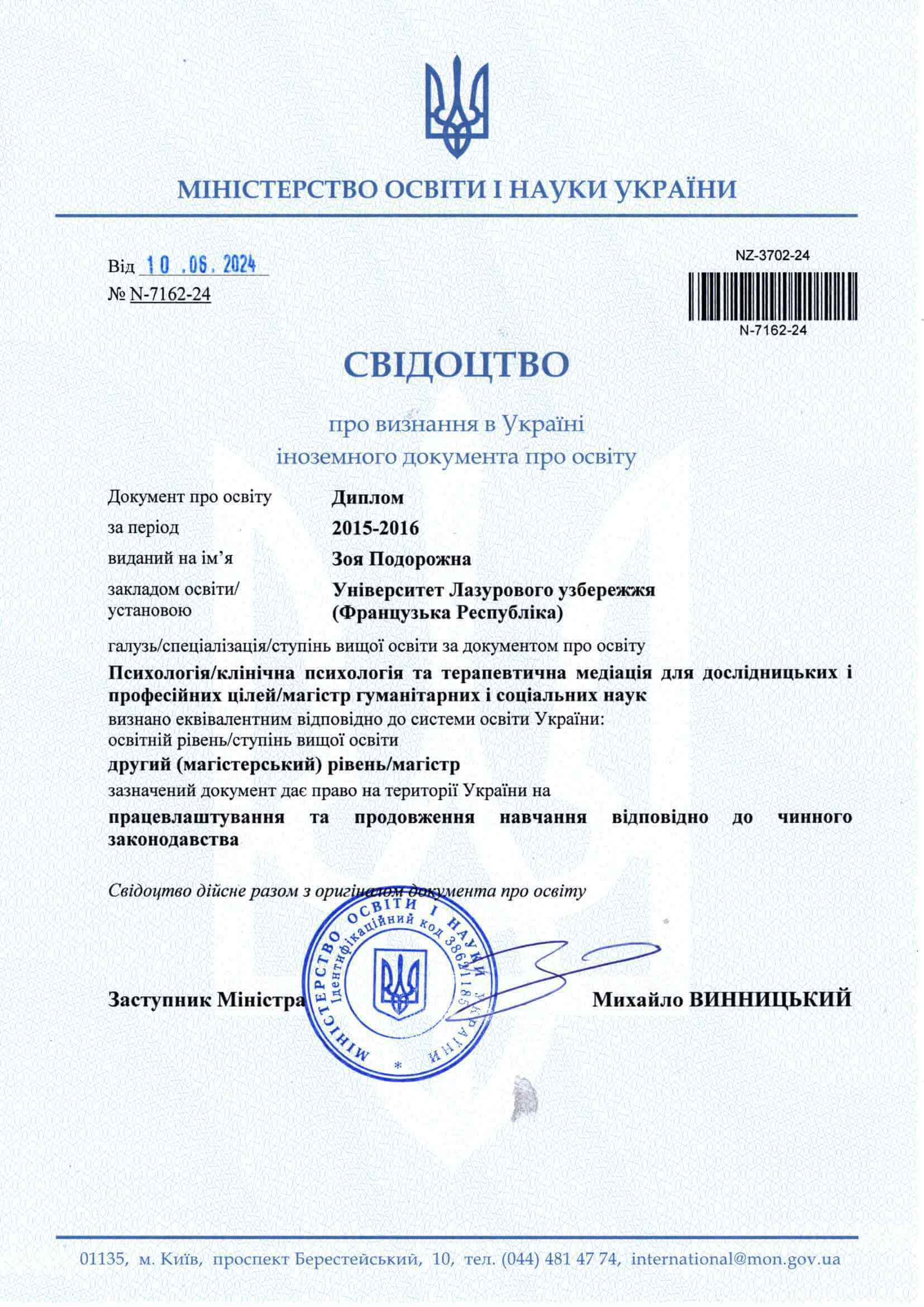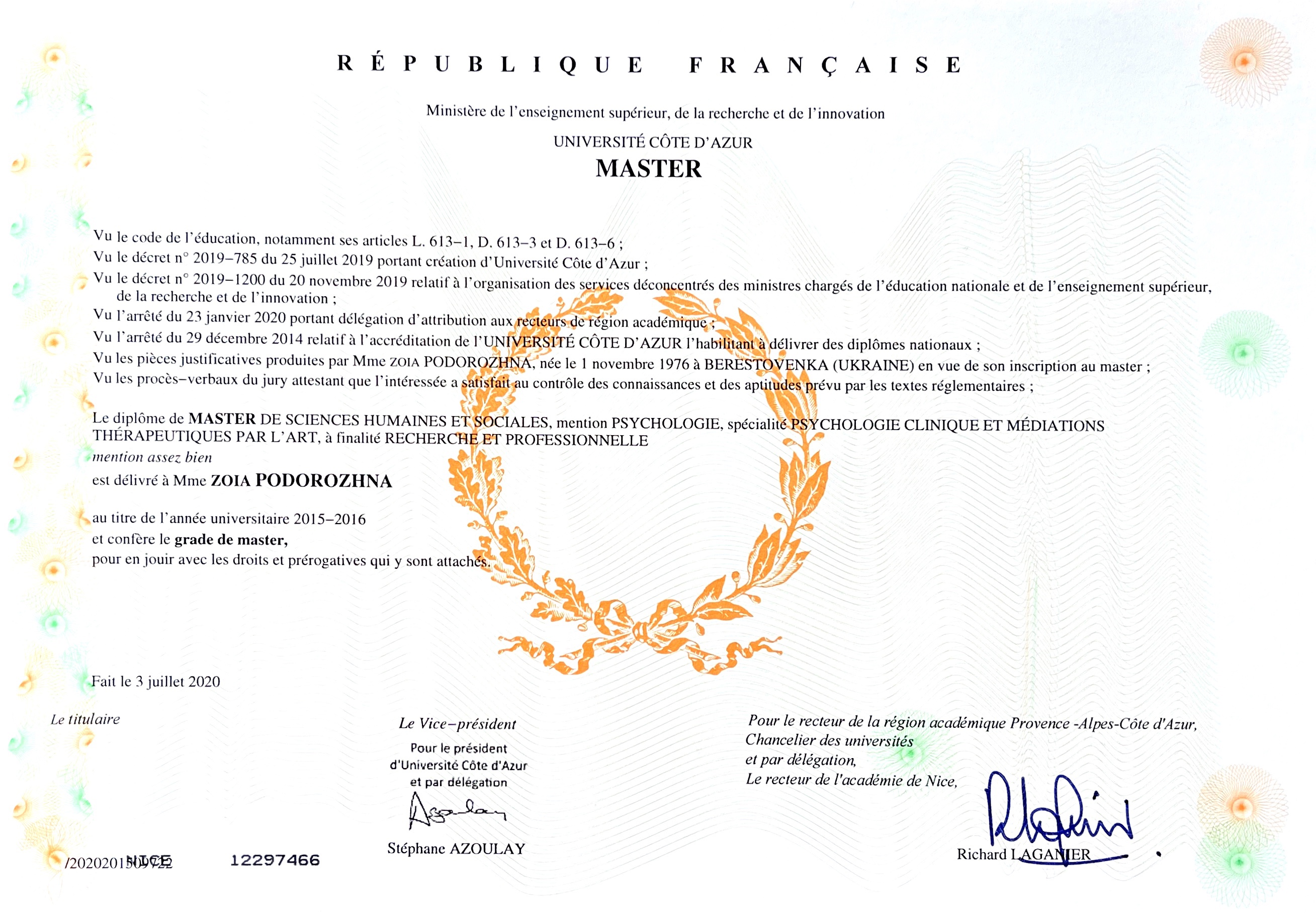 – Магистр клинической психологии (Université Côte d’Azur, Франция)