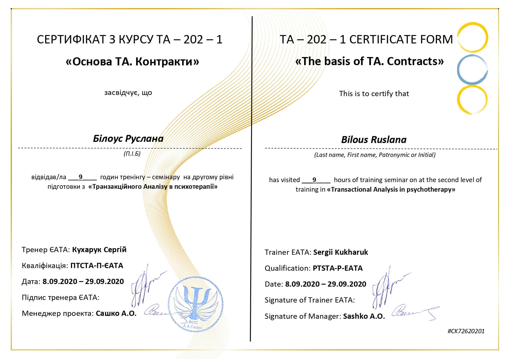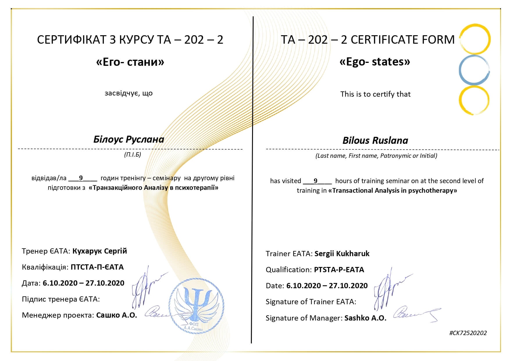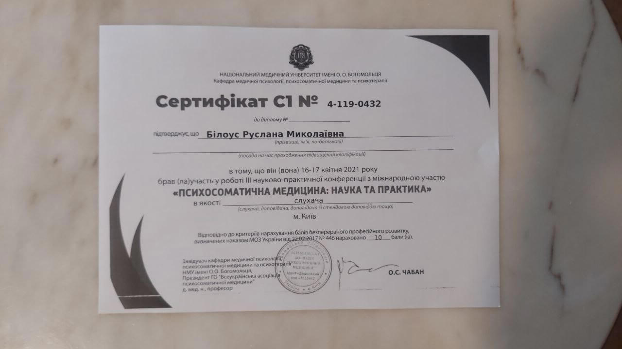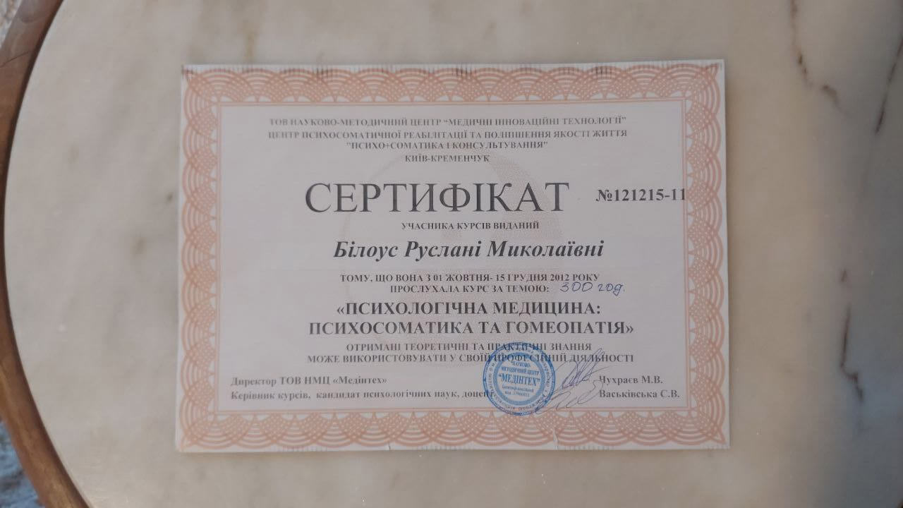 09.2020 – метод біосугестивної терапії для корекції та лікування психосоматичних розладів, сертифікат Міжнародного центру гуманістичних технологій та альтернативної терапії ASTRALITUS/