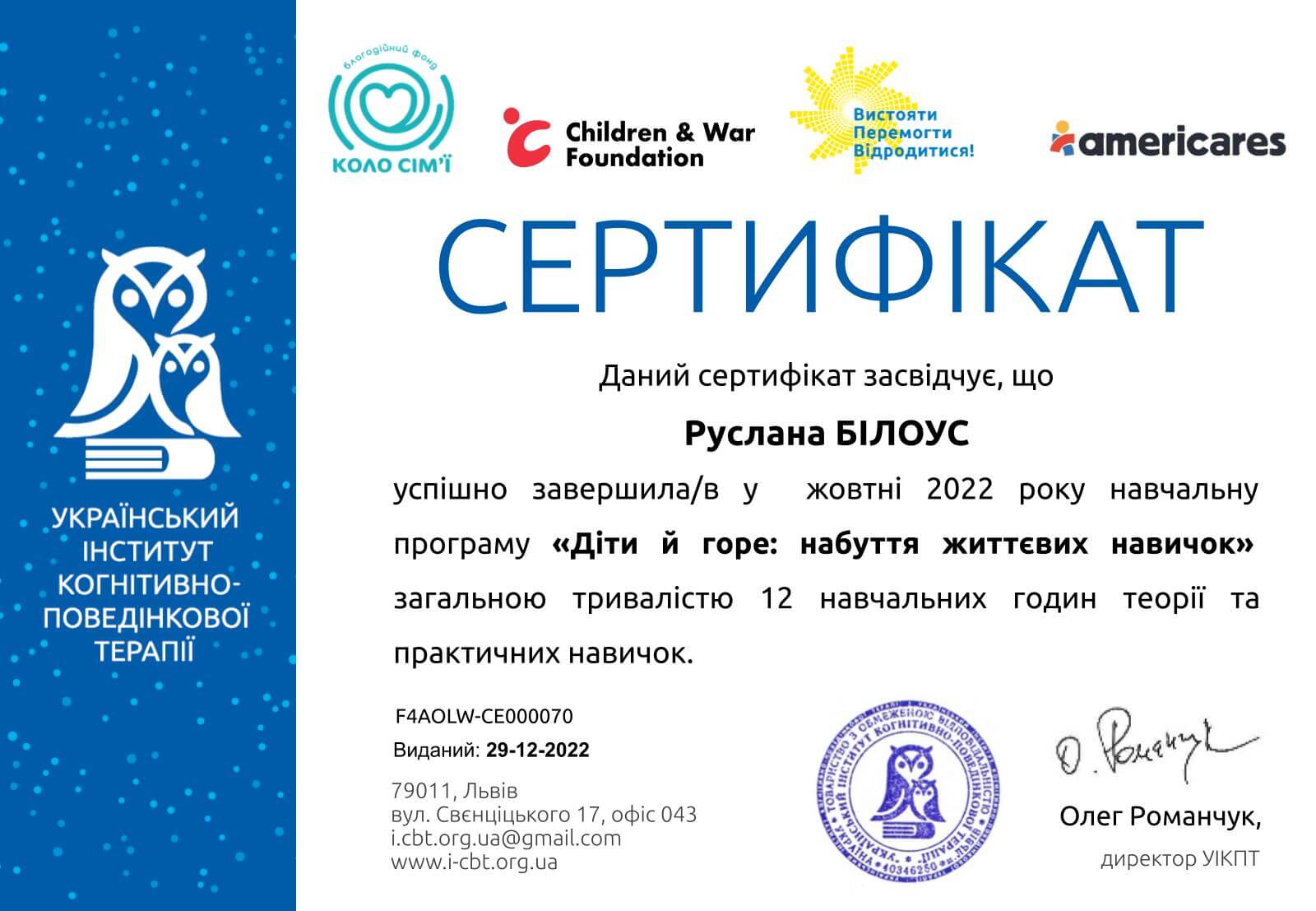 Сертифікат Українського інституту когнітивно-поведінкової терапії F4AOLW-CE000070 від 29.12.2022 р. Навчальна програма «Діти й горе; набуття життєвих навичок».