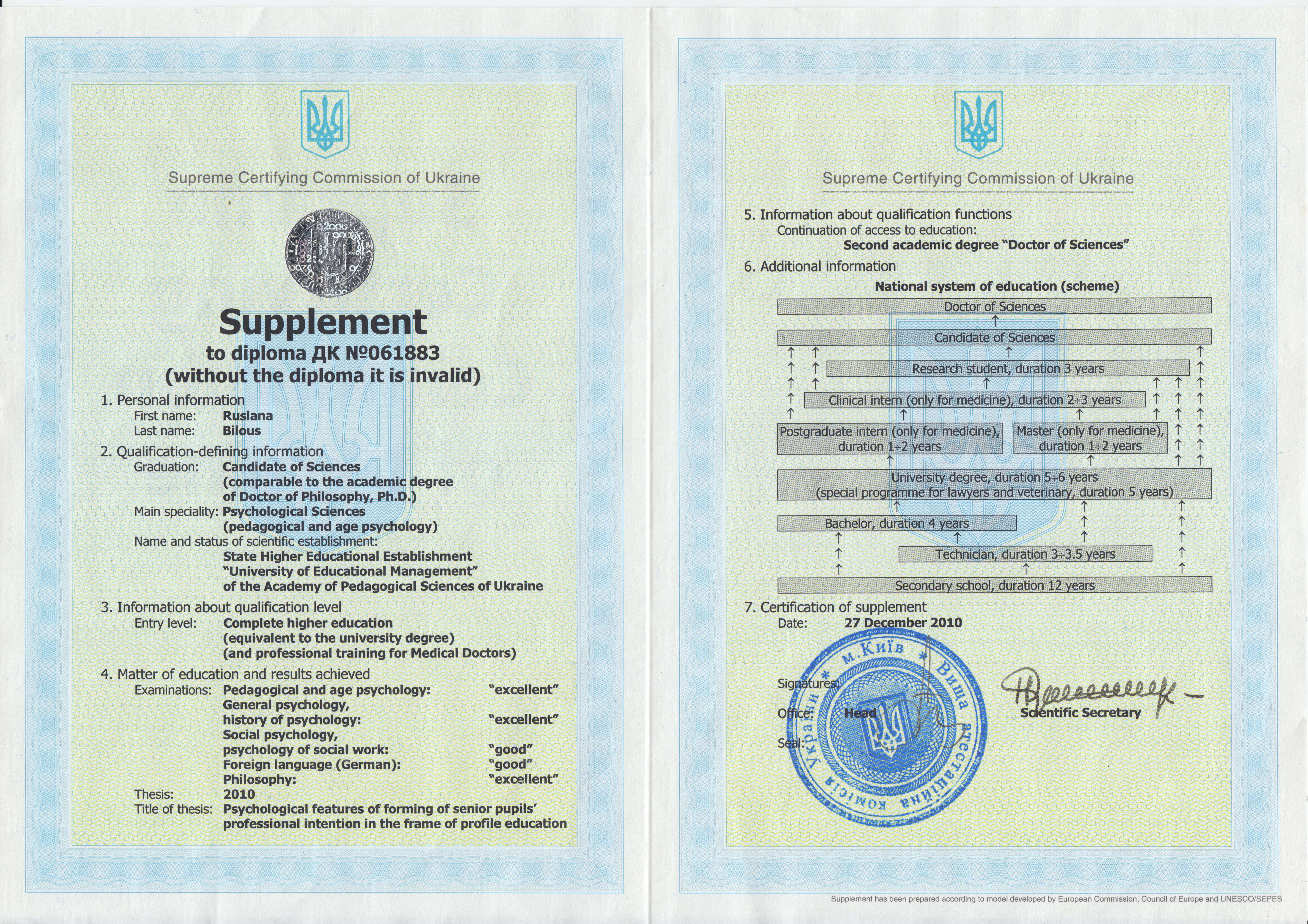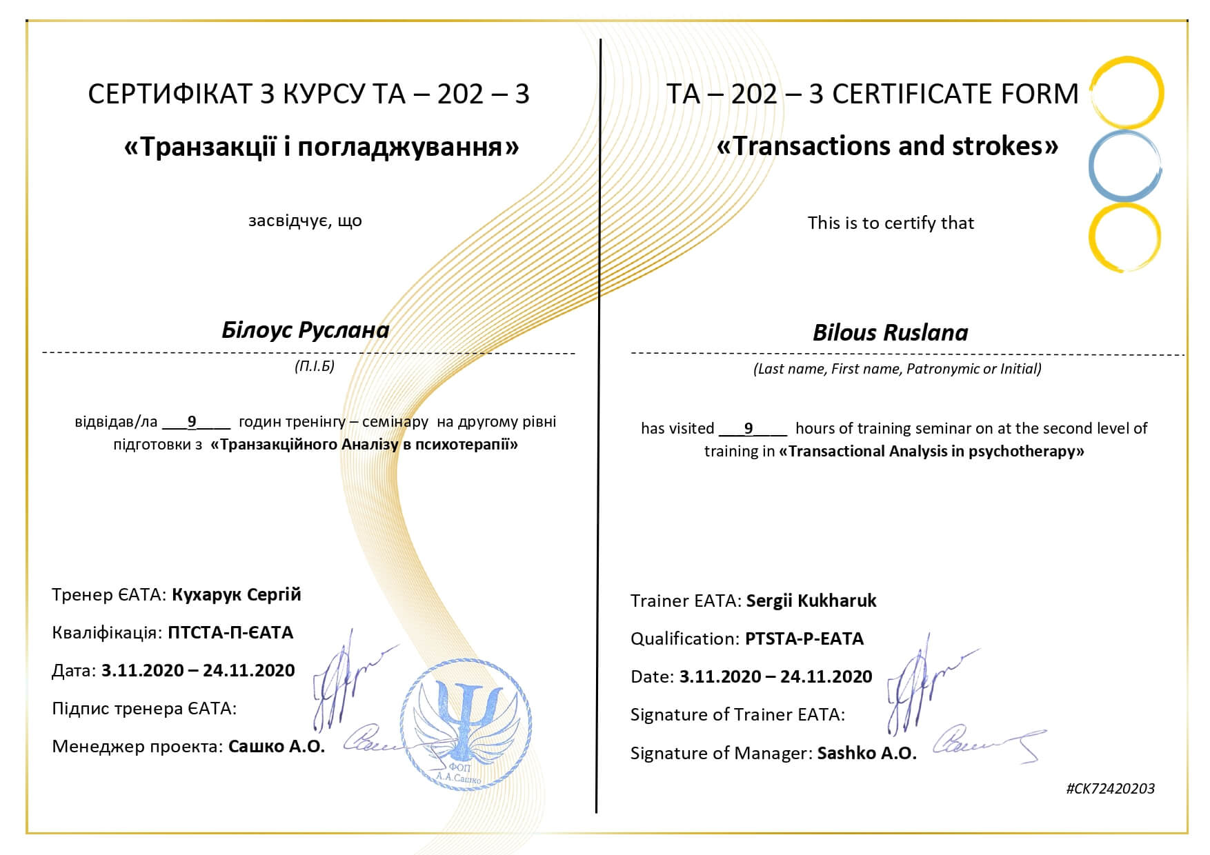2022 – Всесвітня асоціація позитивної і транскультурної психотерапії (WAPP) (Київський центр позитивної психотерапії «Позитум»), Сертифікат № UKR-323-2022 від 16.12.2022 р.