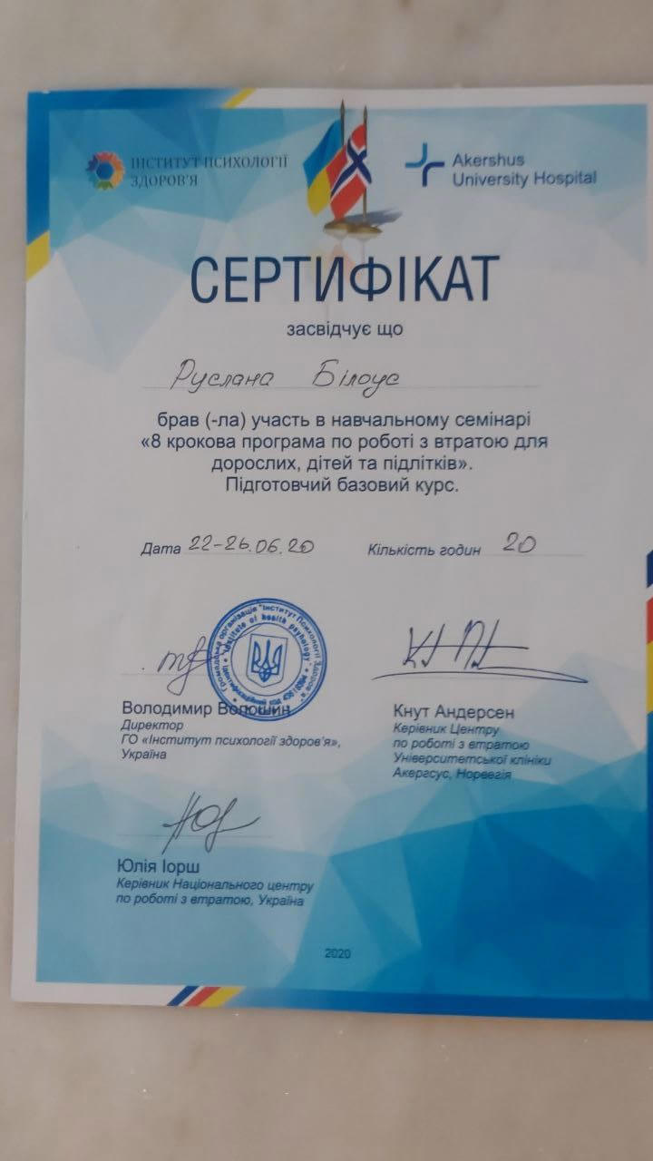 10.2020 – «8-крокова програма роботи з втратою для дорослих, дітей та підлітків», Інститут психології здоров’я, Київ, Україна.