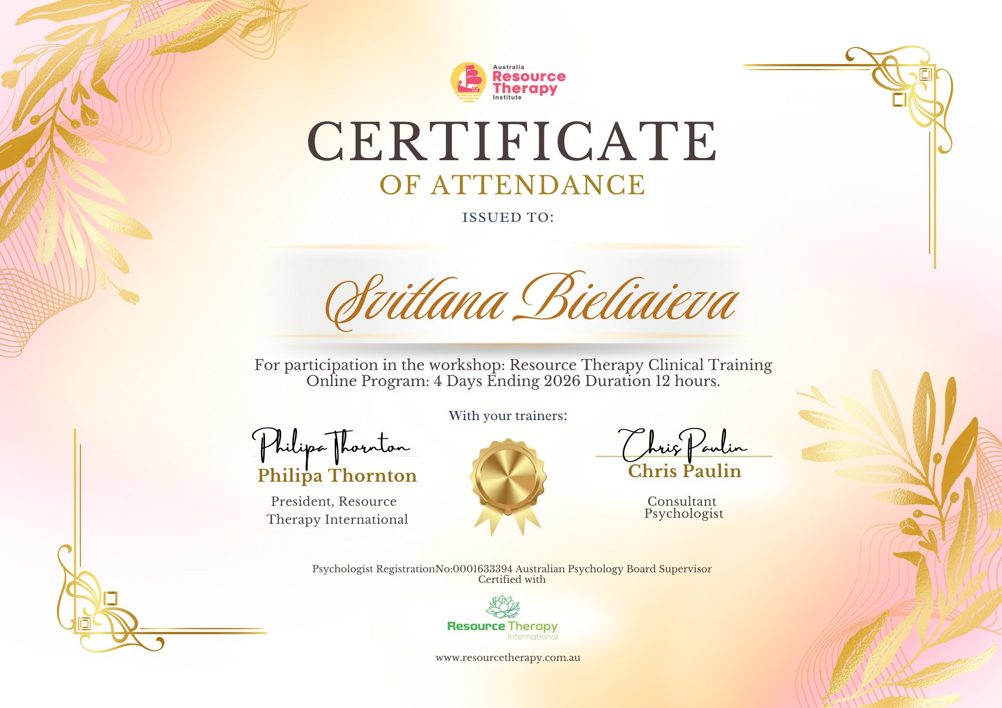 Міжнародний інститут післядипломної освіти, післядипломна програма "Травматерапія" (студентка), Миколаївський державний педагогічний інститут (психологія, базова освіта); Асоціація професійного розвитку психологів та терапевтів в Україні (основи кризового консультування, основи нейропсихології); ГО "Сімейний простір" (Теорія та практика системної сімейної психотерапії); Українська спілка психотерапевтів (Кататимно-імагінативна психотерапія. Основний ступінь); Інститут психології та здоров'я (8 крокова програма роботи з втратою); Ізраїль. Травмацентр (Тілесно орієнтована терапія); Київський інститут раціонально-інтуїтивної терапії "Я" (Психотерапія травматичного досвіду та особистісних розладів)