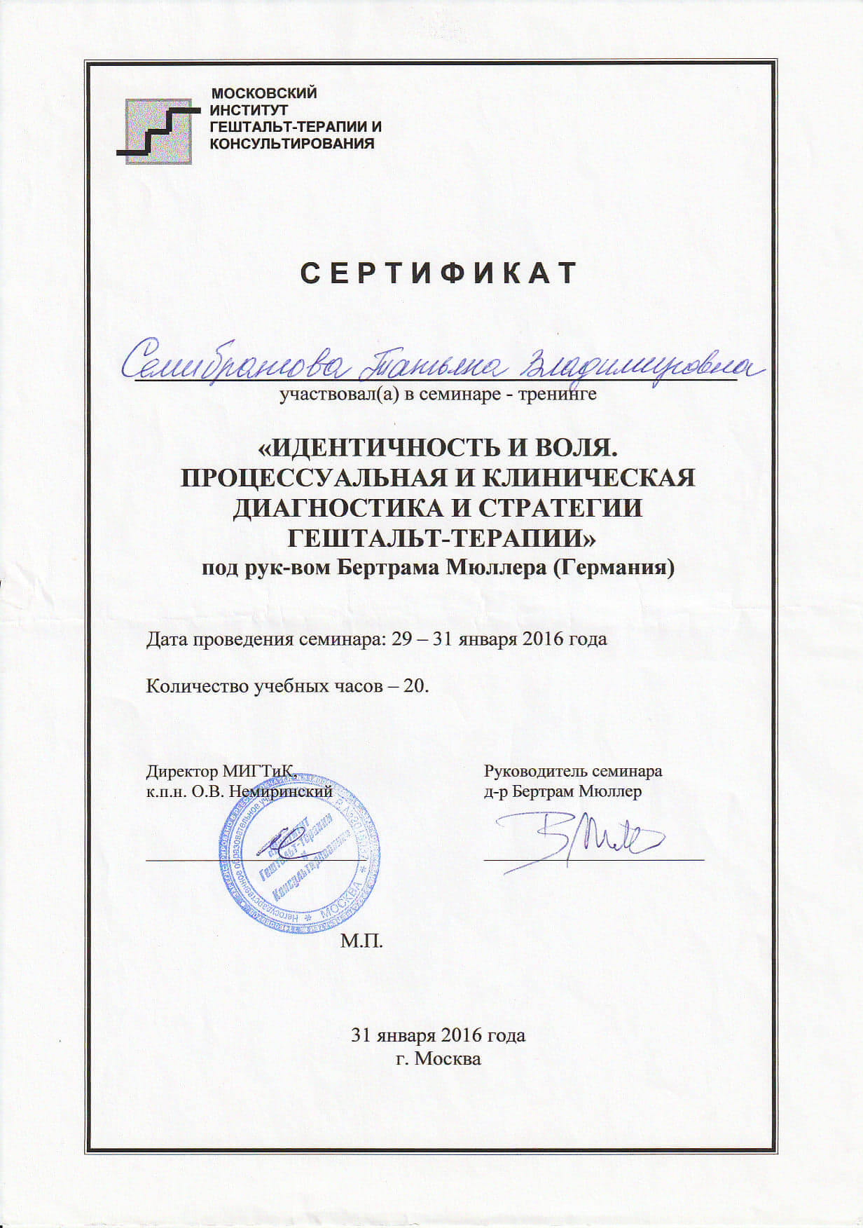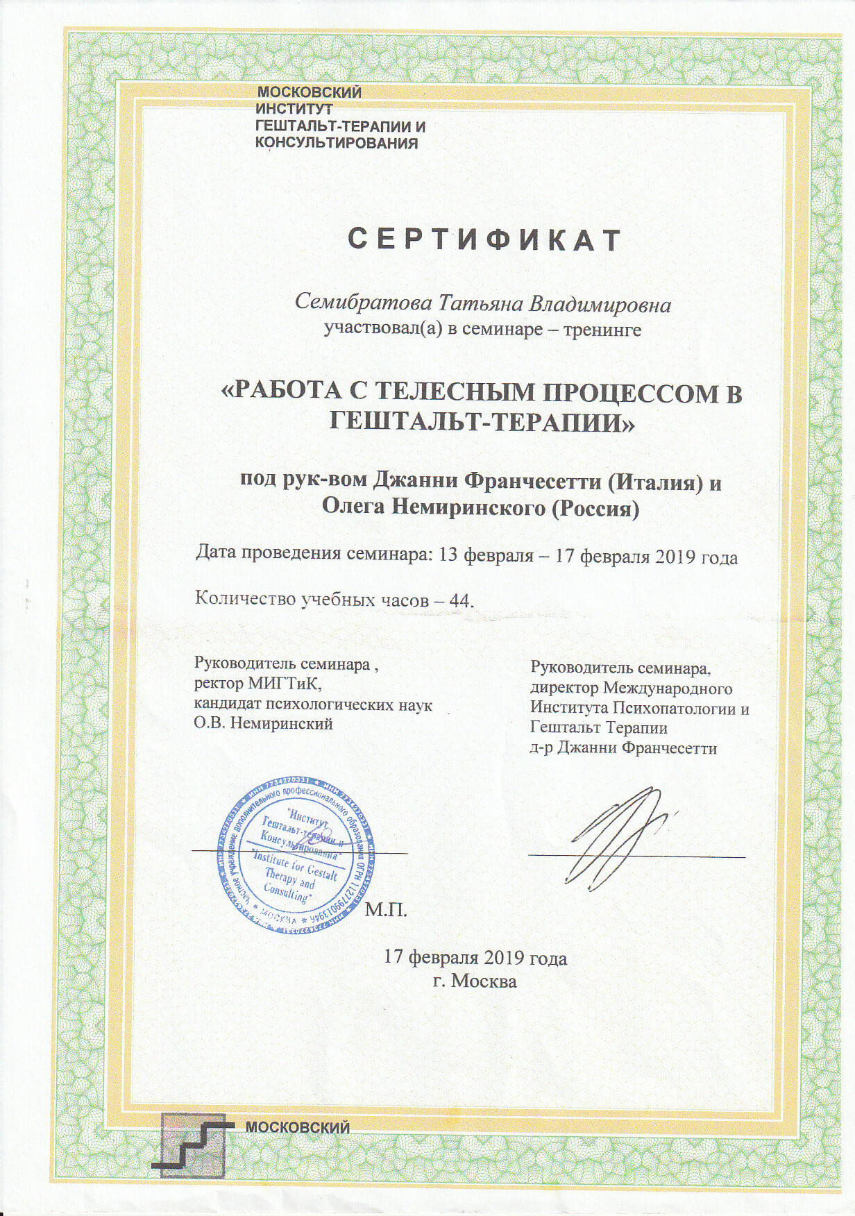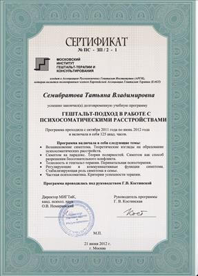 Моє освоєння гештальт-терапії стало не просто навчанням – це був шлях до себе. Я шукала відповіді на запитання: Хто Я? Яка я? Чого я хочу?" Начебто прості питання - ну хто не знає на них відповіді? А виявилося, що багато я про себе не знала, а те, що думала про життя, про себе, про відповідальність – зрозуміла, що не моє, а нав'язане соціумом. За роки навчання і після мого життя відбулося багато змін. Мої мрії, які здавались уже нездійсненними, стали збуватися. Я усвідомила головне, що сама відповідальна за своє життя, а це і є свобода. Найбільша цінність, яку я отримала в гештальт-терапії – це знання про себе, розуміння та усвідомлення того, хто Я поряд з Іншою людиною. Так мій людський шлях, мій шлях навчання, в якому були біль, і втрати, і страх, і сором, і вина, і радість стали моїм досвідом. Досвідом, який допомагає мені бути стійкою, чесною, яка приймає у роботі з клієнтами. Вже закохана у гештальт-терапію, поїхала вчитися до Москви на кваліфікації тренера та супервізора. Сьогодні я буду сертифікованим гештальт-терапевтом, тренером, супервізором МІГІСу і МІГТіКу. Своє професійне зростання підвищую участю у конференціях, семінарах, тренінгах, лекціях.
