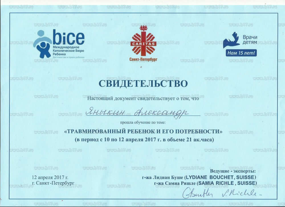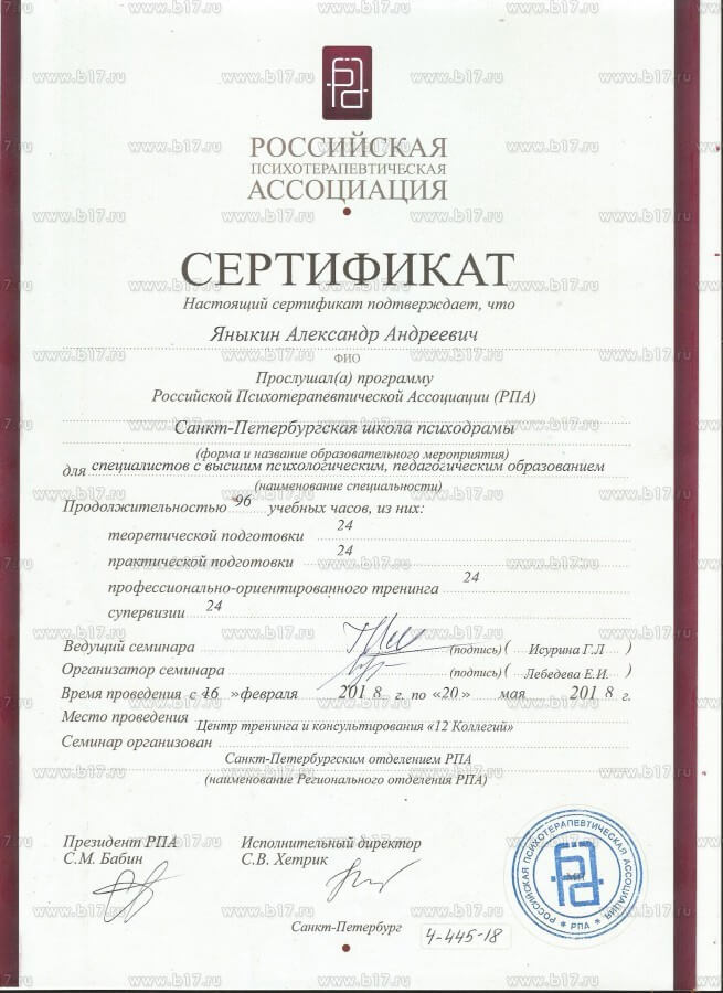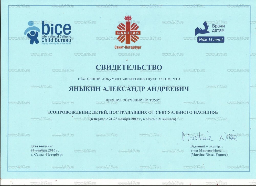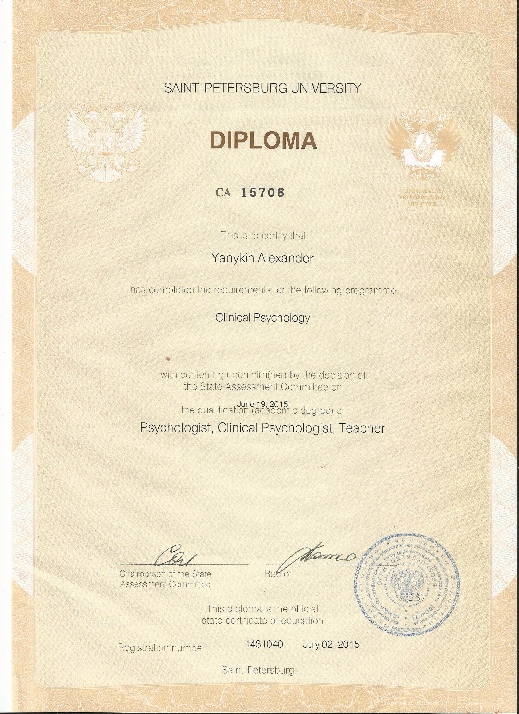 Закінчив Санкт-Петербурзький державний університет, а також маю понад 530 годин додаткової освіти з психоаналітичної терапії, когнітивної терапії, особистісно-центрованої терапії, сімейної терапії, психодрами та додаткових курсів щодо підтримки дітей, які постраждали від сексуального насильства.