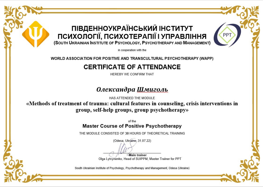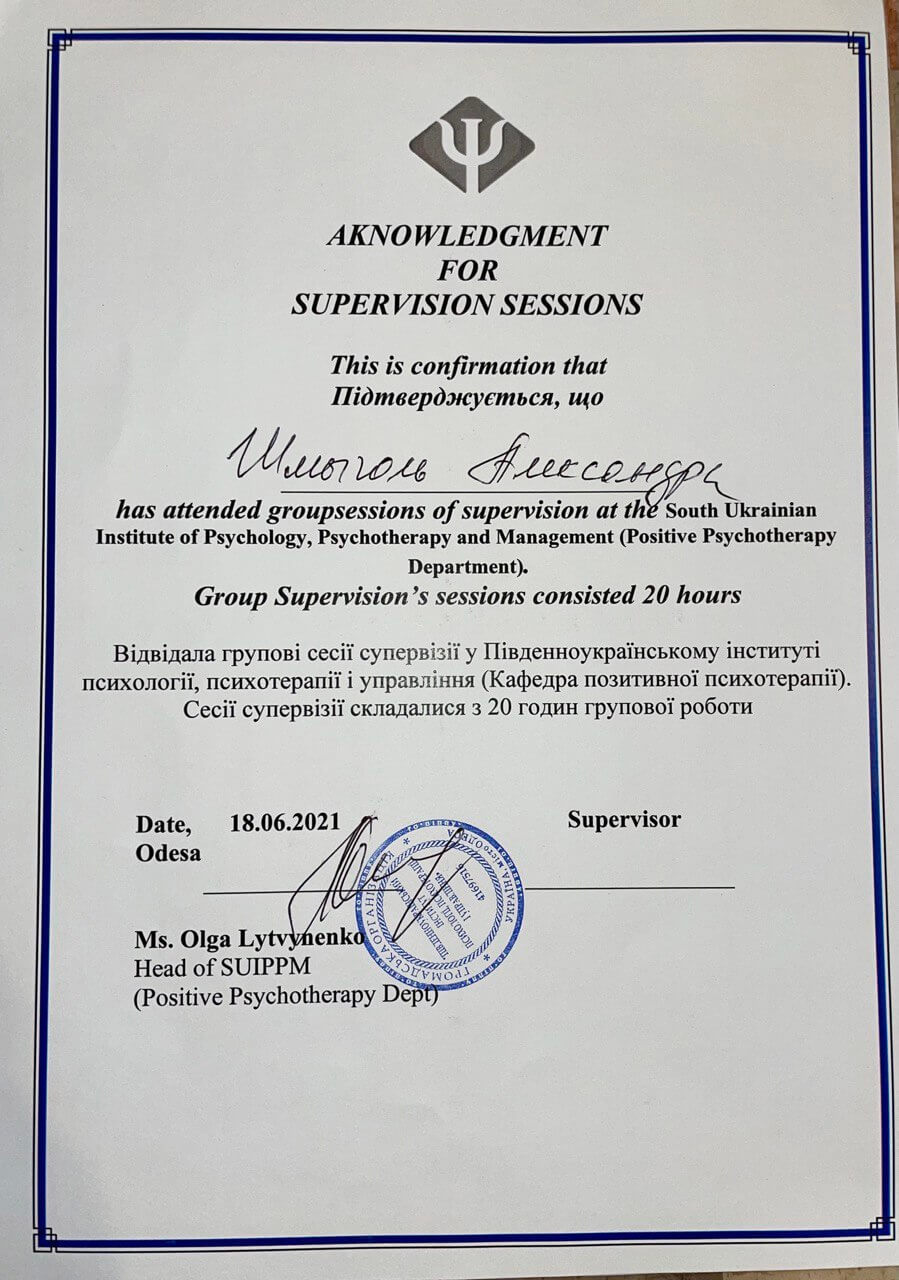 Сертифікат участі у групових та супервізійних сессіях, Одеса.