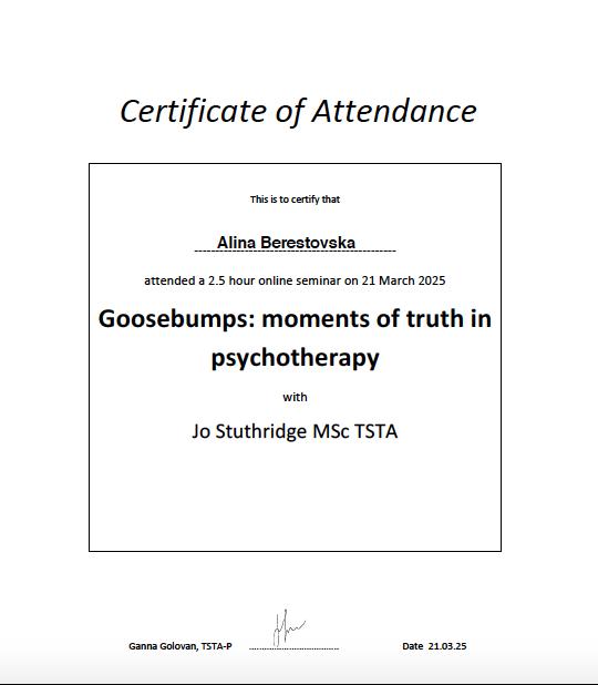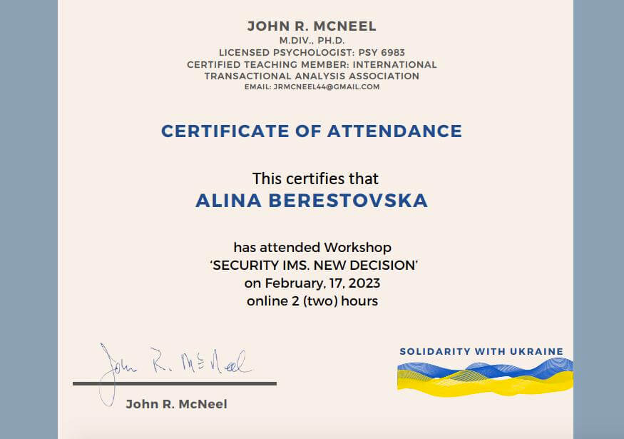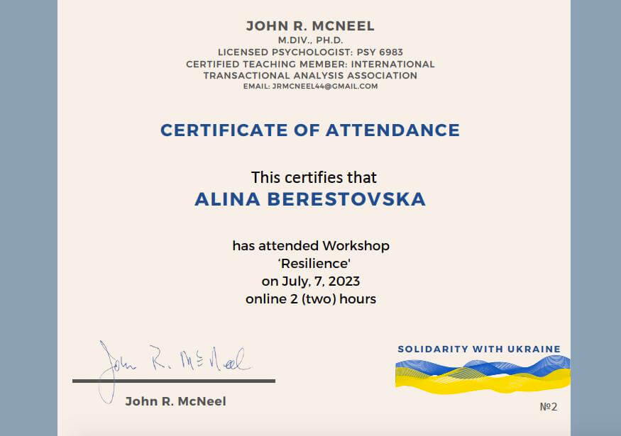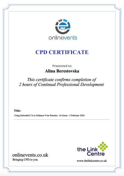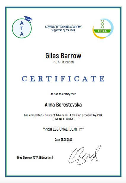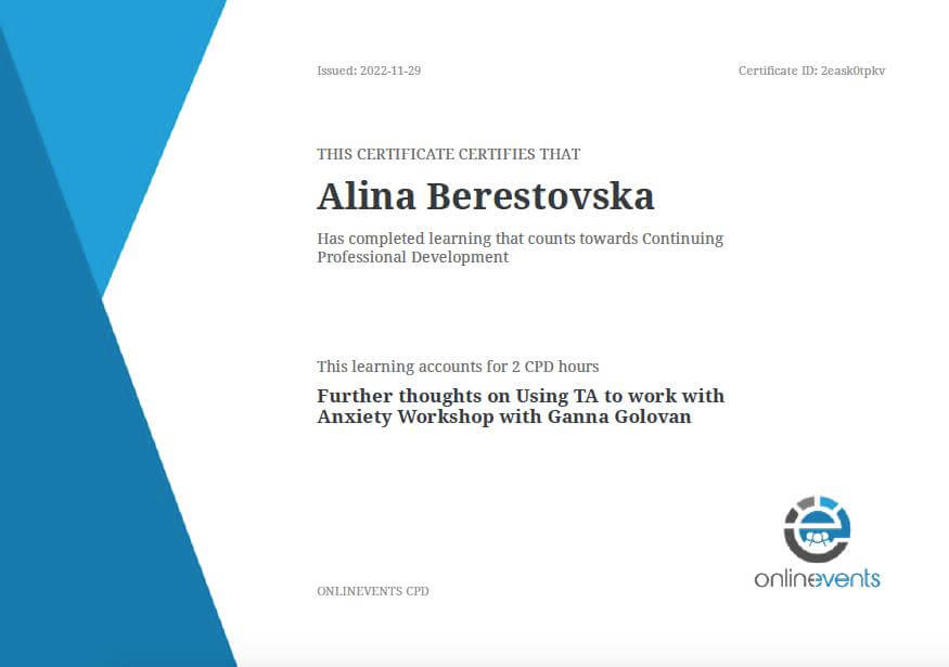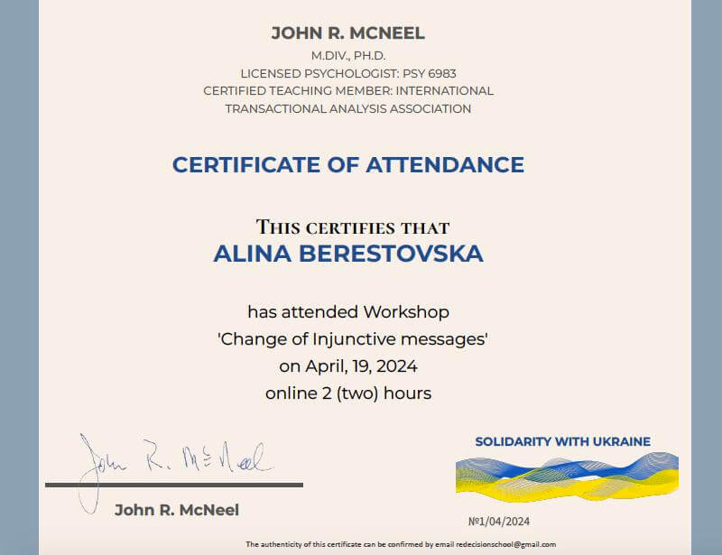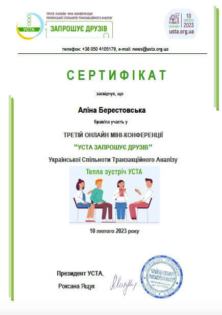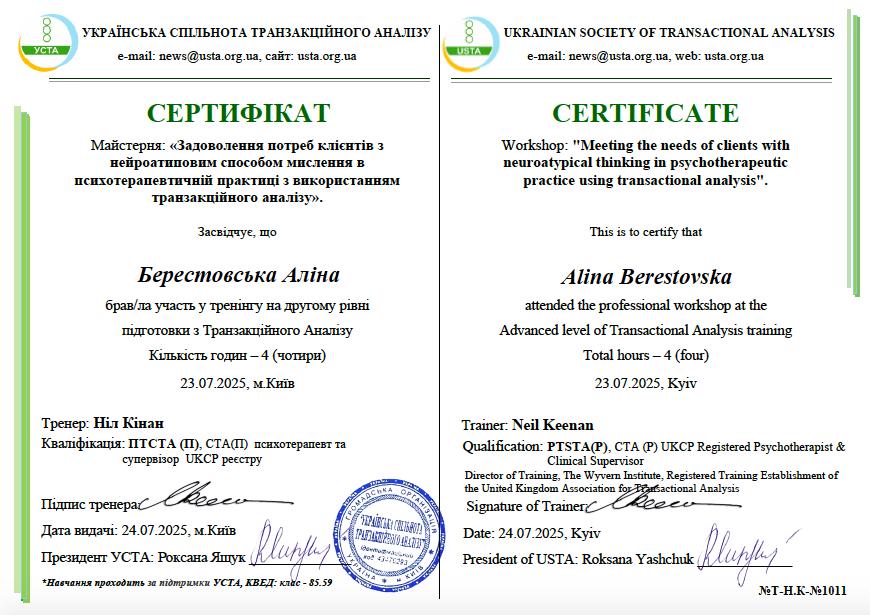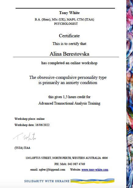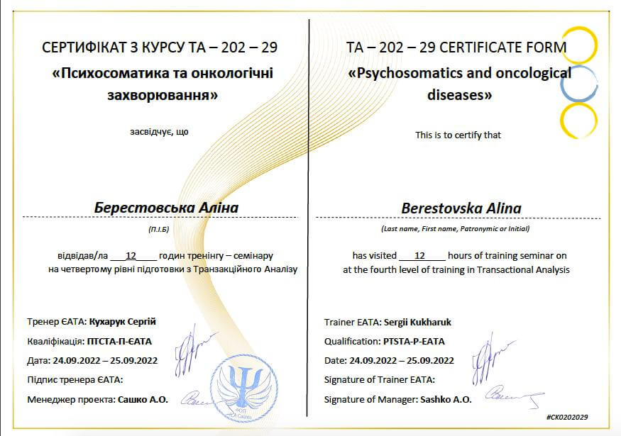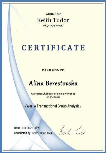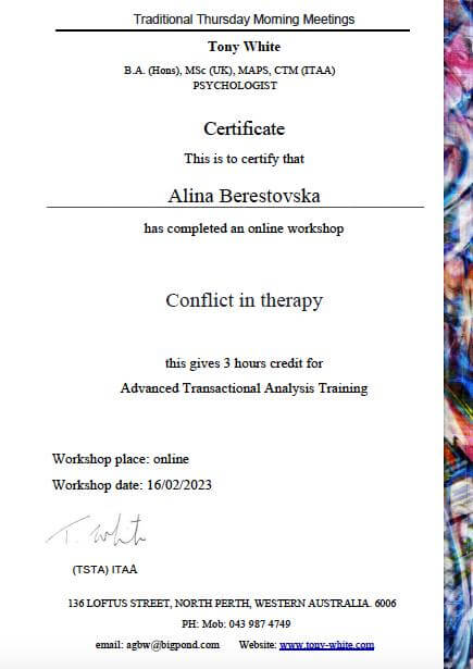 - 4-річний курс з транзакційного аналізу в психотерапії ТА-202, який проводився тренером EATA (Європейської Асоціації Транзакційного Аналізу) за підтримки УСТА (Української Спільноти Транзакційного Аналізу)