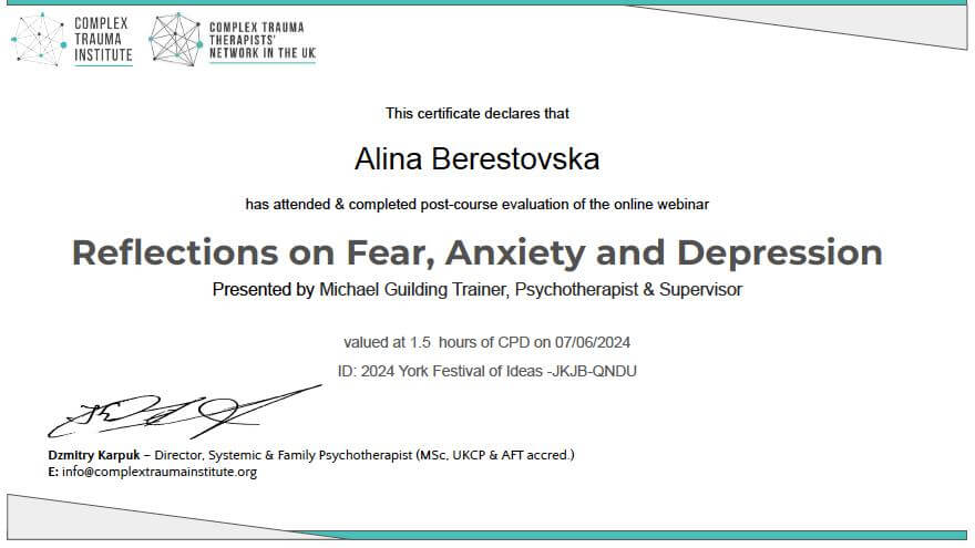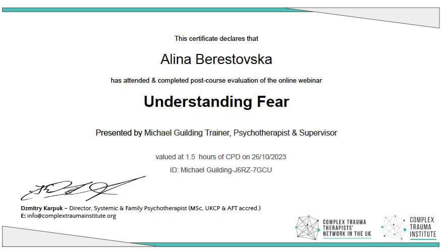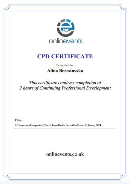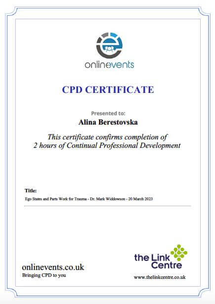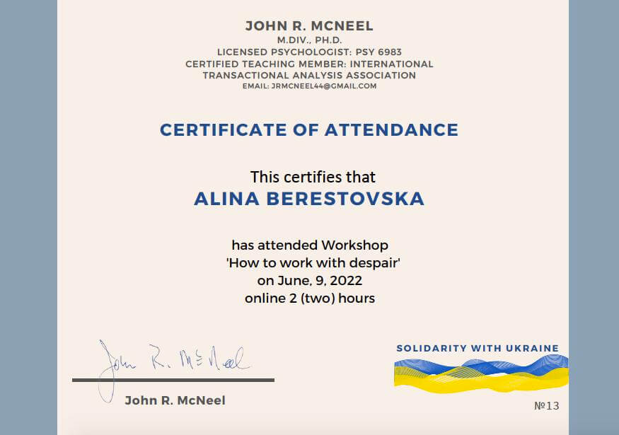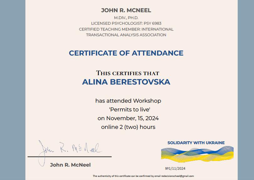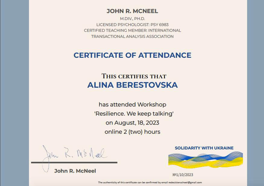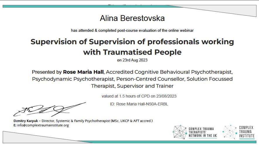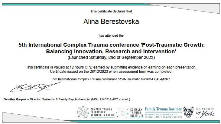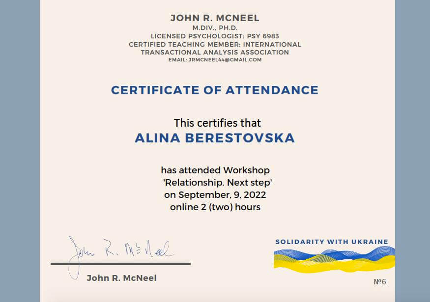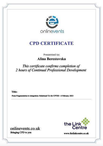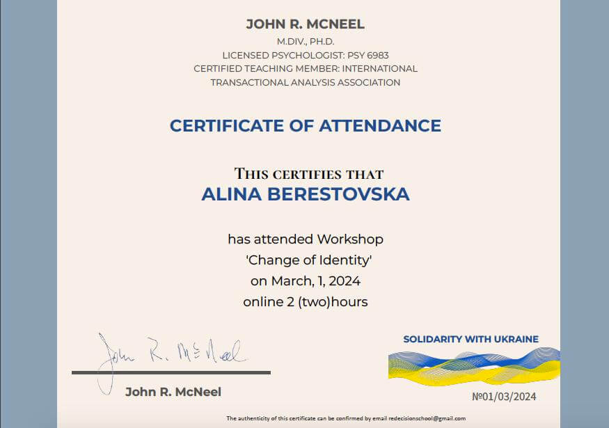 - 4-річний курс з транзакційного аналізу в психотерапії ТА-202, який проводився тренером EATA (Європейської Асоціації Транзакційного Аналізу) за підтримки УСТА (Української Спільноти Транзакційного Аналізу)