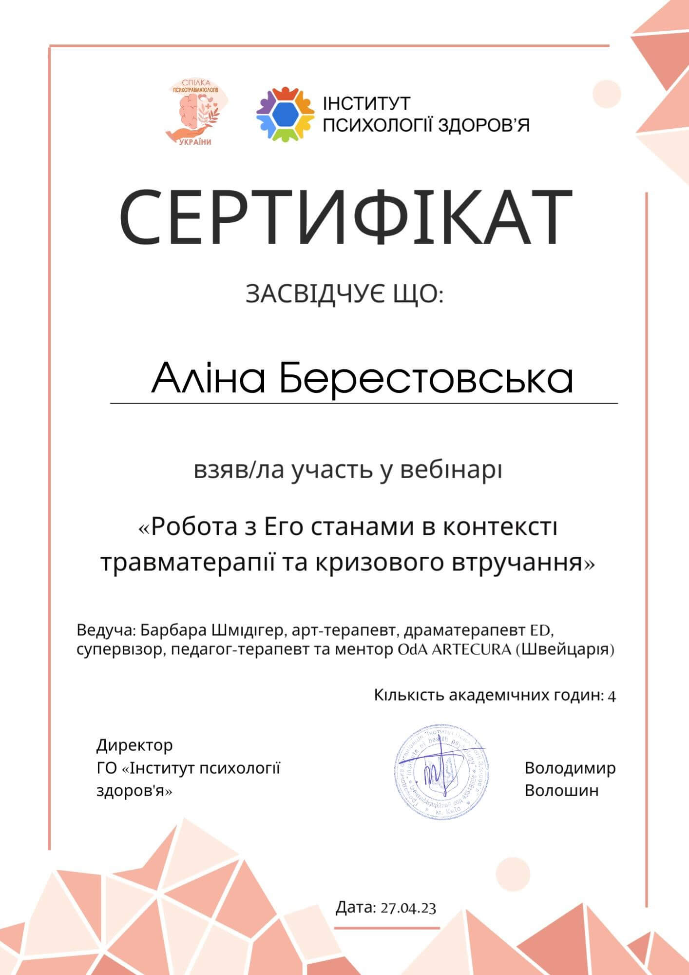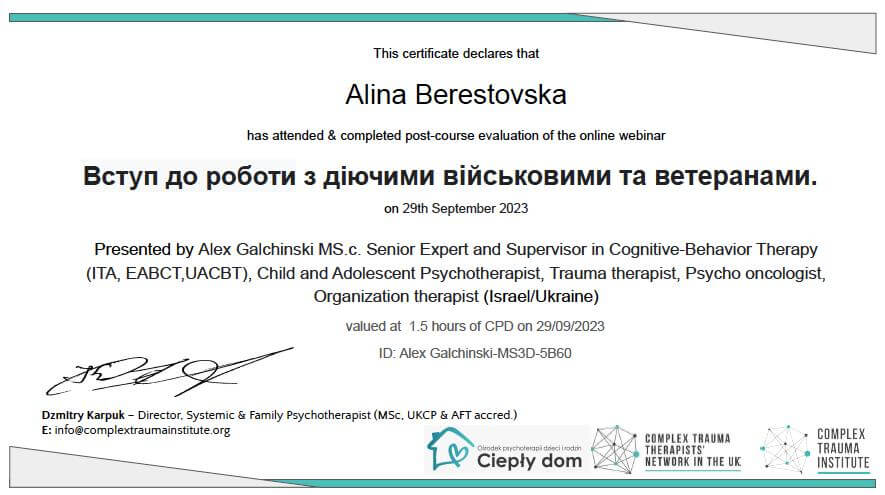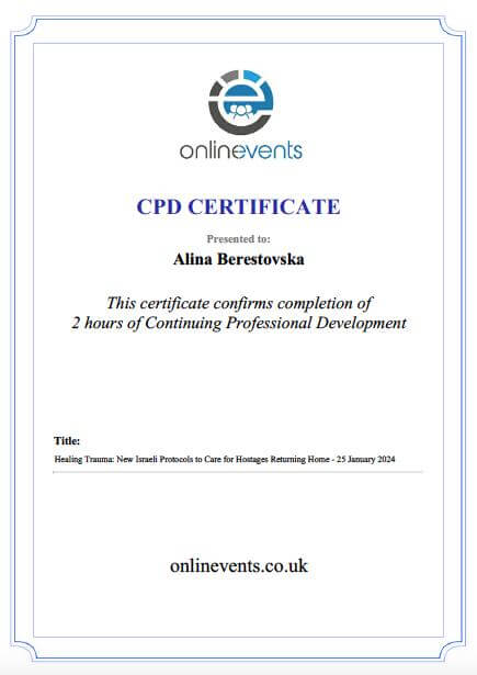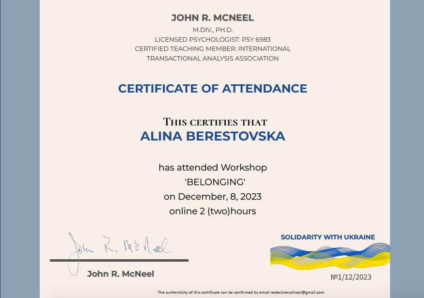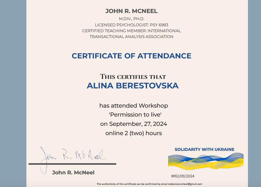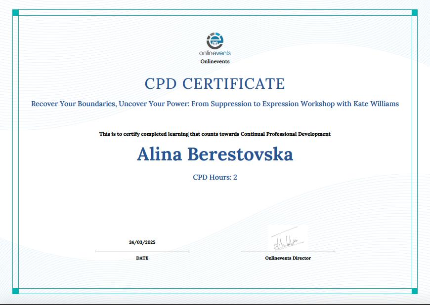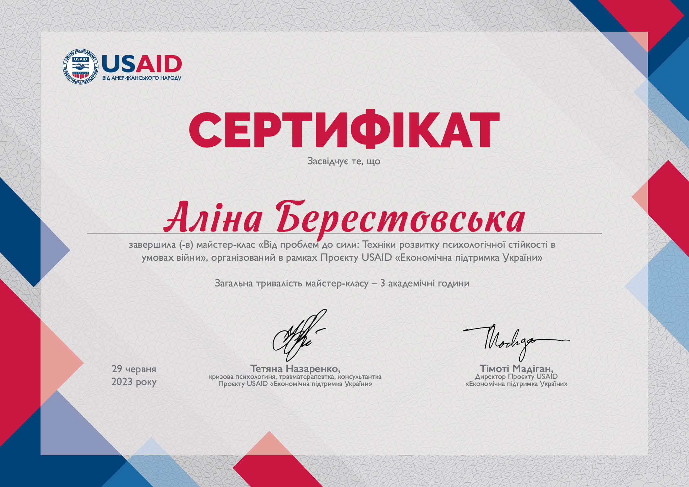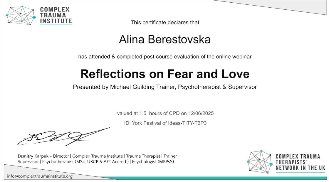 - 4-річний курс з транзакційного аналізу в психотерапії ТА-202, який проводився тренером EATA (Європейської Асоціації Транзакційного Аналізу) за підтримки УСТА (Української Спільноти Транзакційного Аналізу)