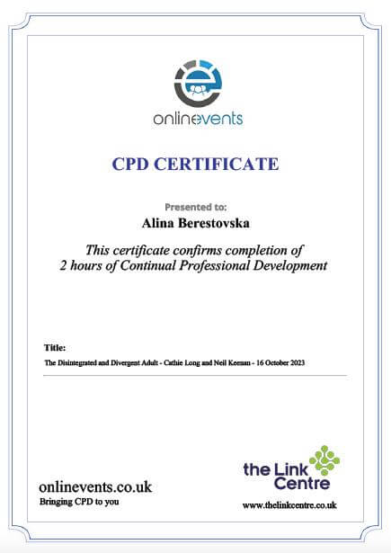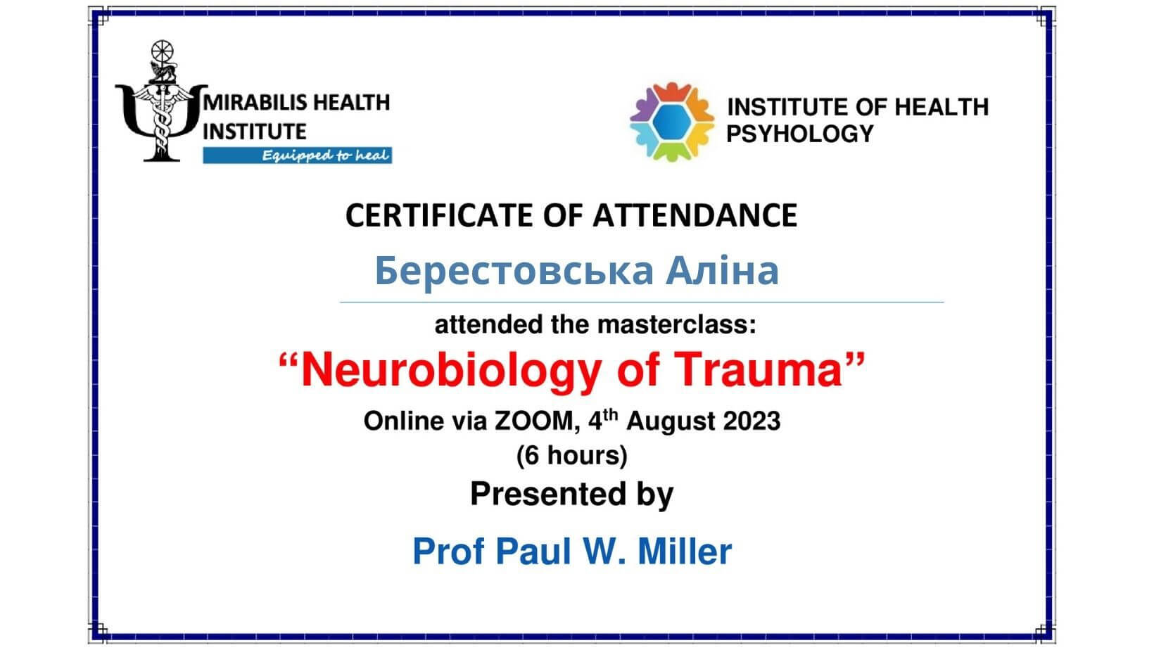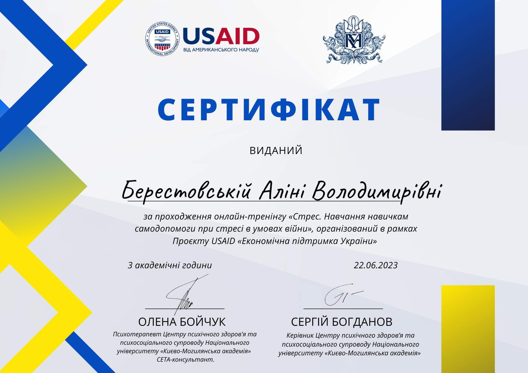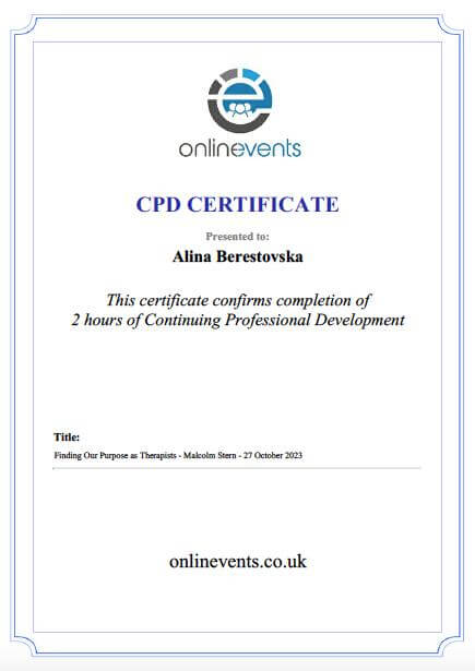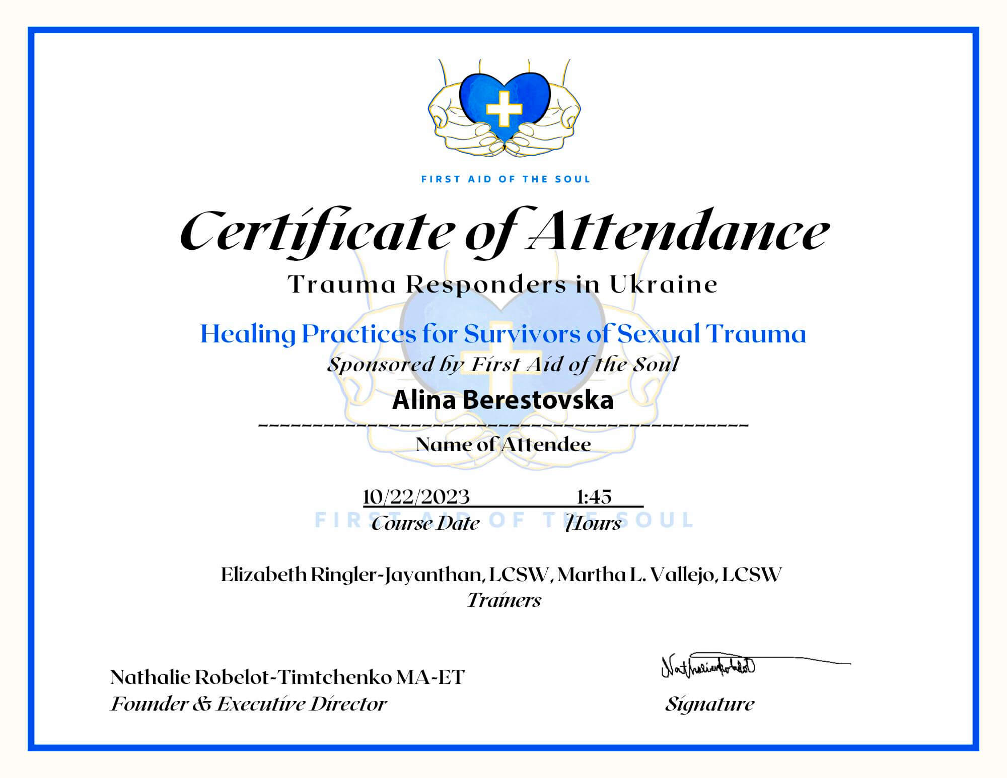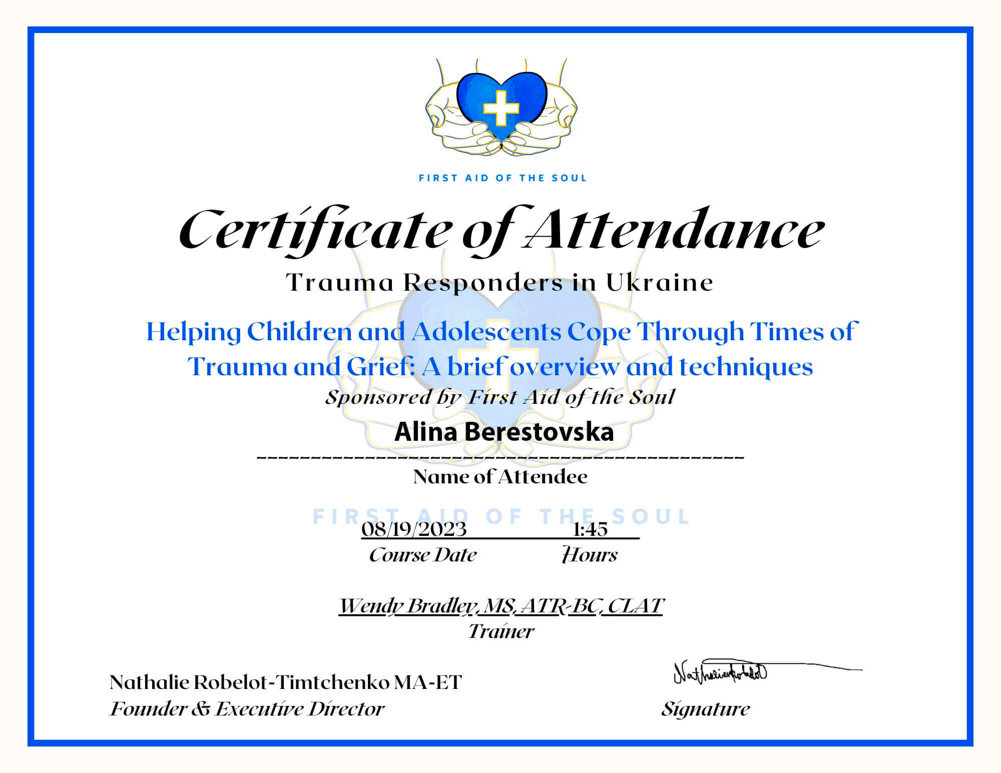 - 4-річний курс з транзакційного аналізу в психотерапії ТА-202, який проводився тренером EATA (Європейської Асоціації Транзакційного Аналізу) за підтримки УСТА (Української Спільноти Транзакційного Аналізу)