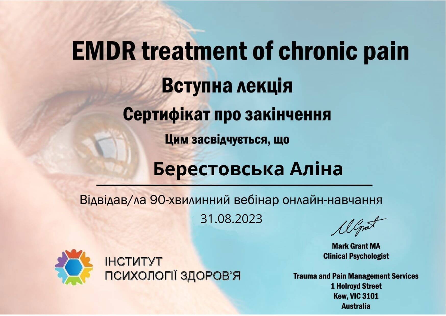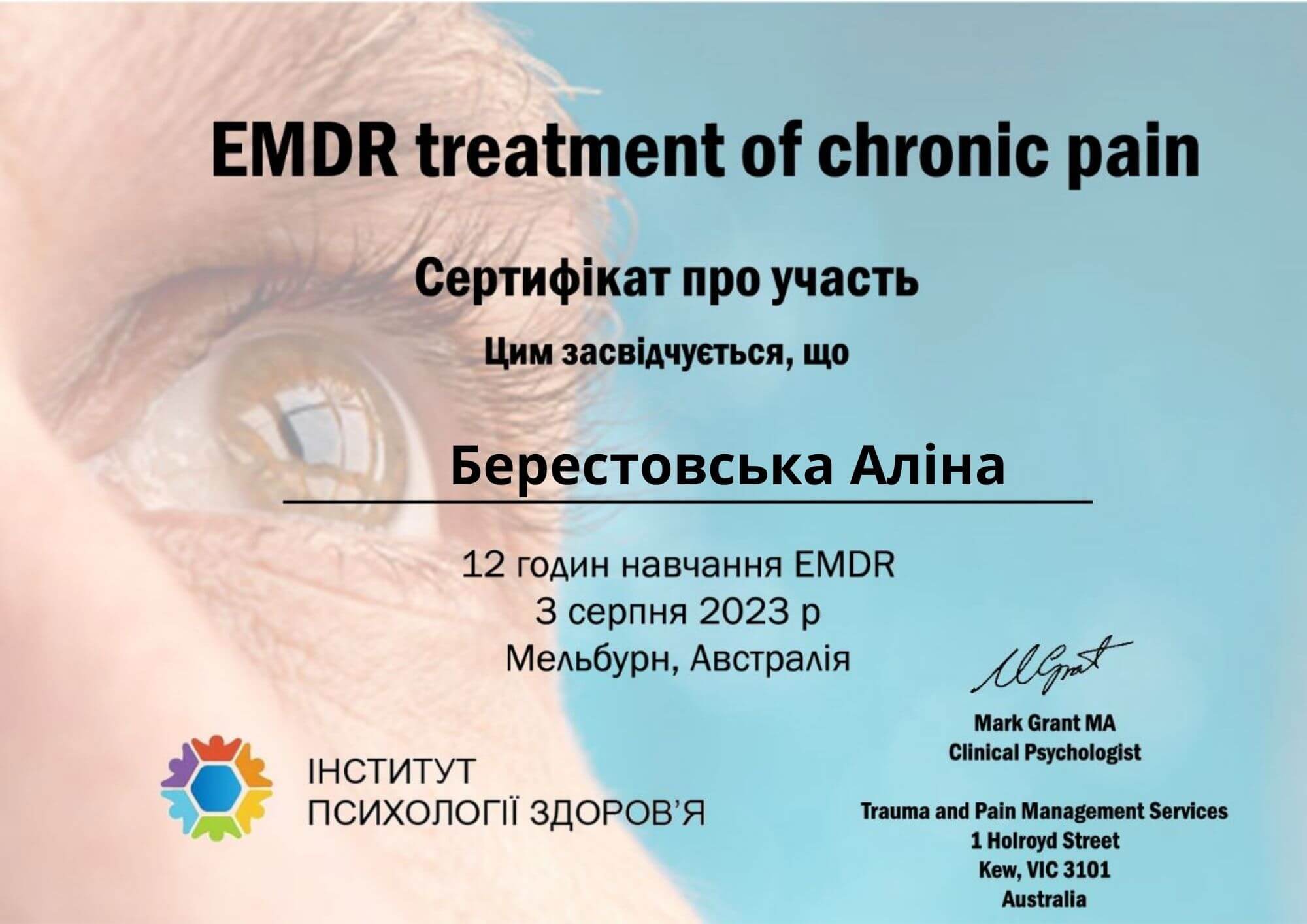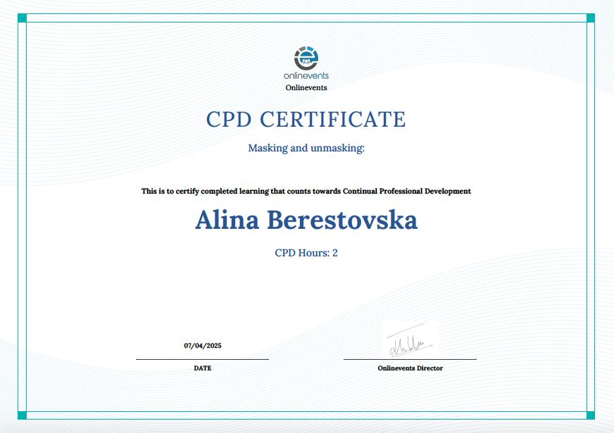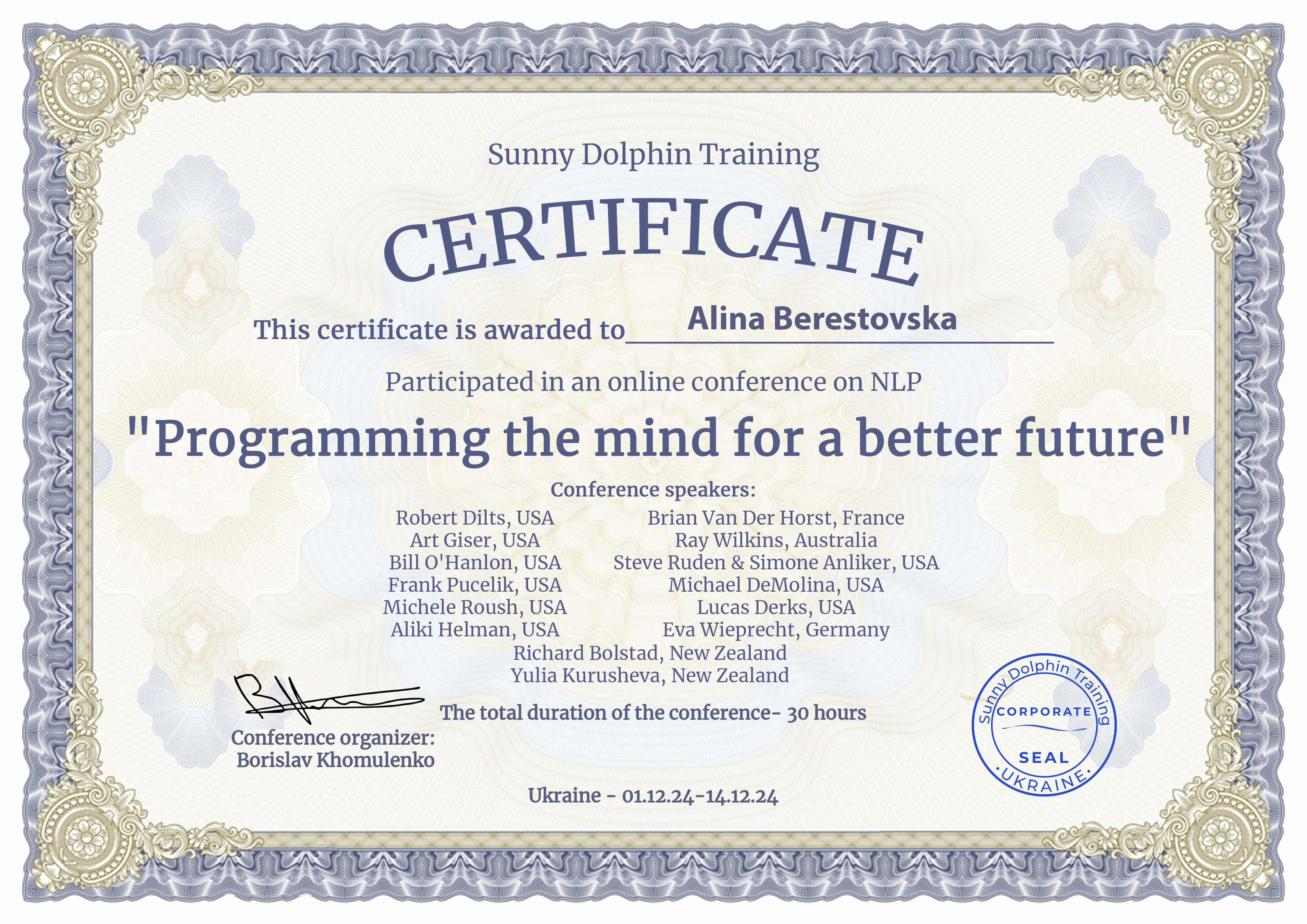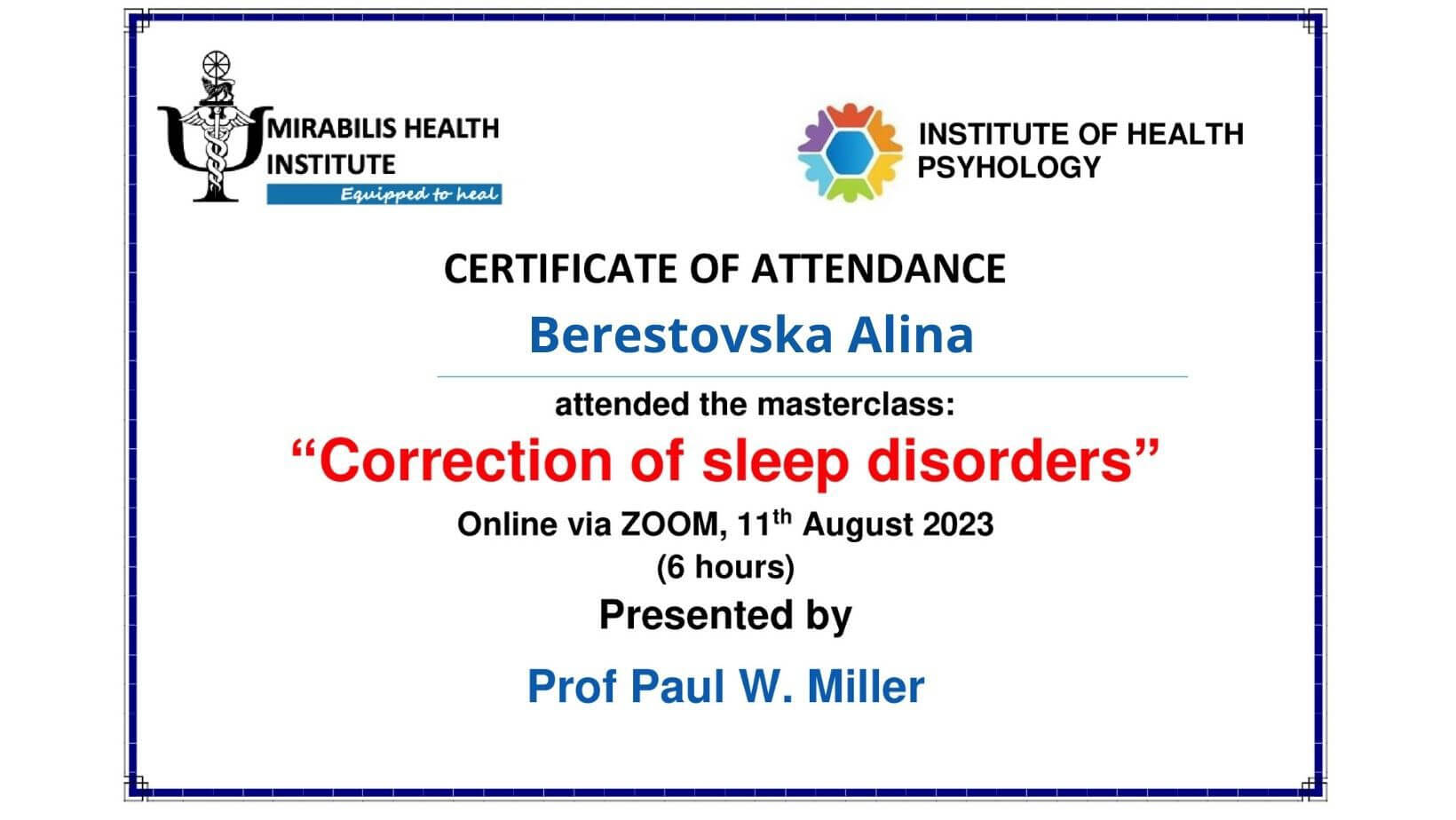 - 4-річний курс з транзакційного аналізу в психотерапії ТА-202, який проводився тренером EATA (Європейської Асоціації Транзакційного Аналізу) за підтримки УСТА (Української Спільноти Транзакційного Аналізу)