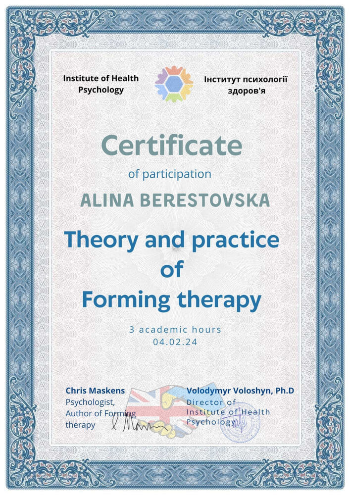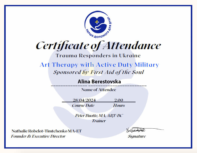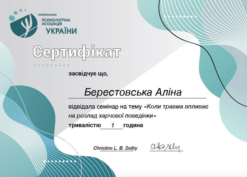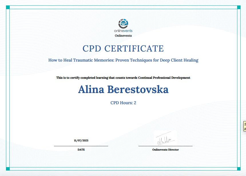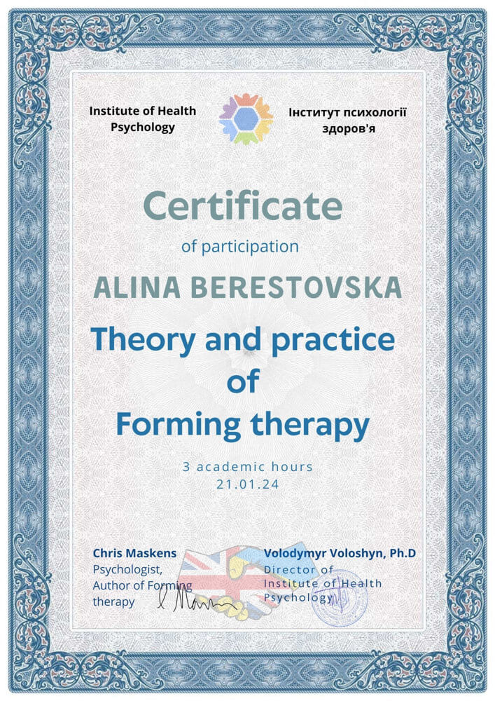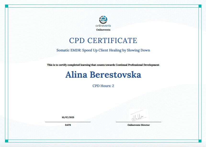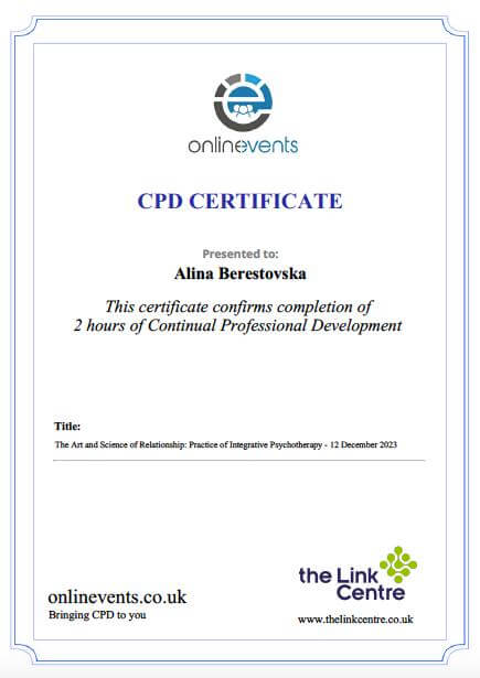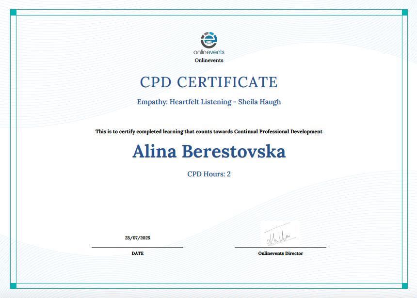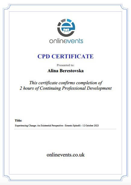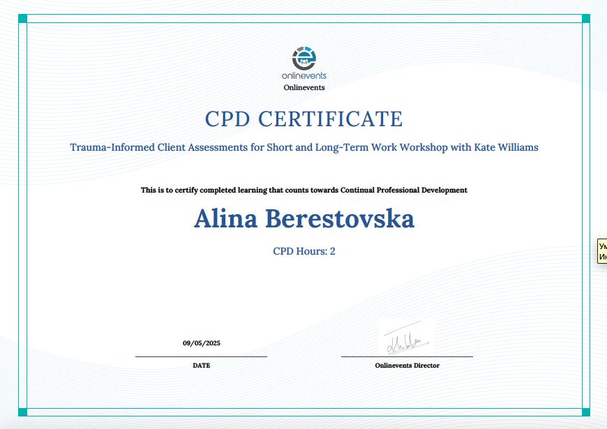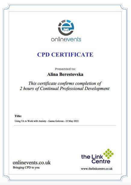 Постійно підвищую професійну компетентність. Крім навчання в модальності транзакційного аналізу, лише за останні 4 роки додатково пройшла більше 800 підтверджених сертифікатами годин навчання на курсах та семінарах з широкого кола питань психічного здоров’я. Серед них, зокрема: кризове консультування, перша психологічна допомога (де маю сертифікацію тренера), робота з травмою, основи травматерапії, психосоматика та онкологічні захворювання, робота з втратою (в тому числі маю досвід проходження 8-крокової програми), робота з невизначеною втратою, робота з біженцями та переселенцями, робота зі складнощами у відносинах (в парі, сім’ї), з тривогою, депресією, провиною, соромом, вигоранням. Маю кваліфікацію практикувати техніку перемотування David Muss. Вивчала основи соматичної терапії травми, соматичного переживання (Somatic Experiencing) за Peter Levine, емоційно-фокусованої терапії, майндфулнес, особистісно-орієнтованої терапії, екзистенційної терапії, наративної терапії, інтерперсональної терапії, КПТ.