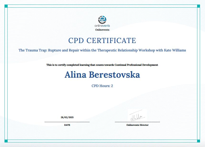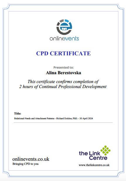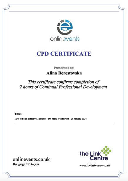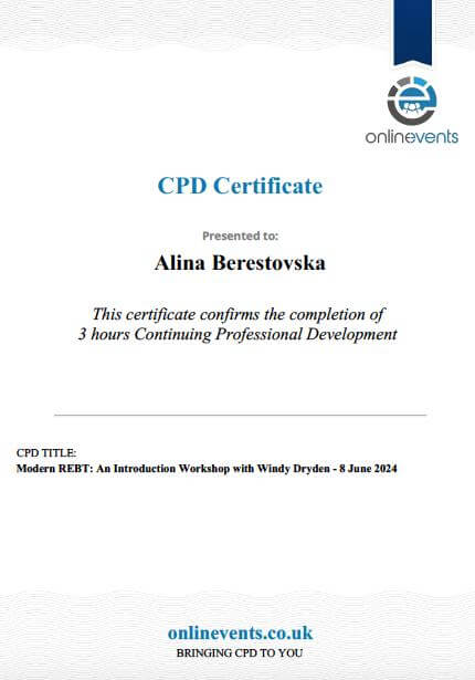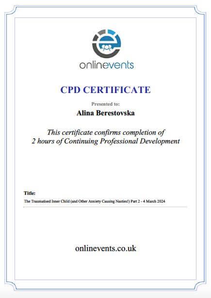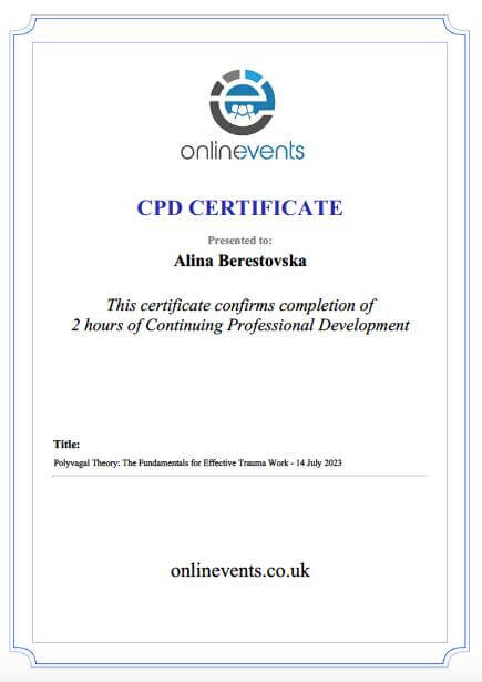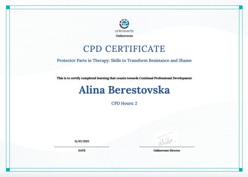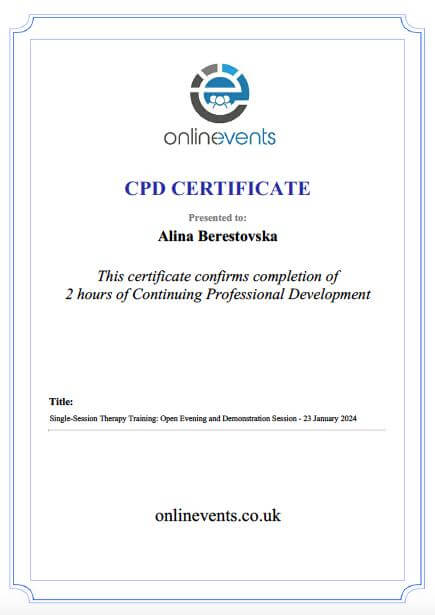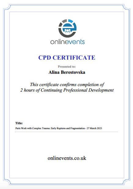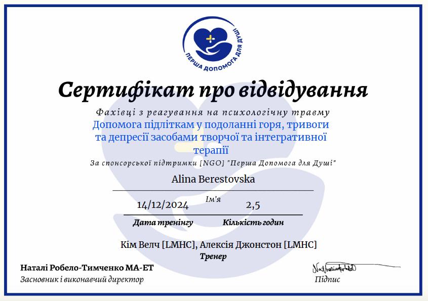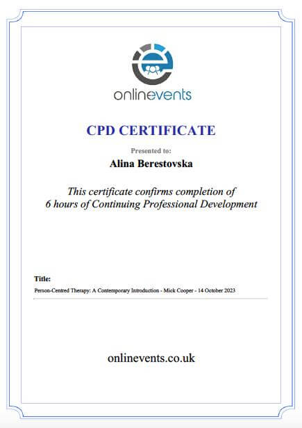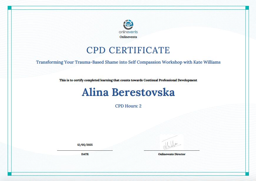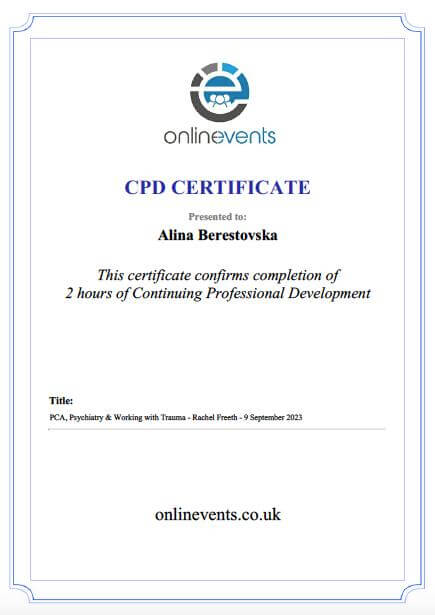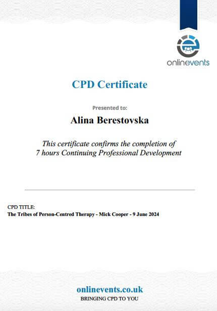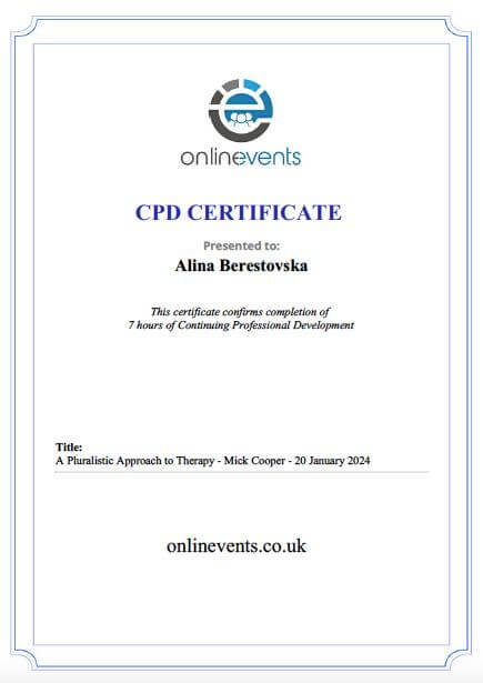 Постійно підвищую професійну компетентність. Крім навчання в модальності транзакційного аналізу, лише за останні 4 роки додатково пройшла більше 800 підтверджених сертифікатами годин навчання на курсах та семінарах з широкого кола питань психічного здоров’я. Серед них, зокрема: кризове консультування, перша психологічна допомога (де маю сертифікацію тренера), робота з травмою, основи травматерапії, психосоматика та онкологічні захворювання, робота з втратою (в тому числі маю досвід проходження 8-крокової програми), робота з невизначеною втратою, робота з біженцями та переселенцями, робота зі складнощами у відносинах (в парі, сім’ї), з тривогою, депресією, провиною, соромом, вигоранням. Маю кваліфікацію практикувати техніку перемотування David Muss. Вивчала основи соматичної терапії травми, соматичного переживання (Somatic Experiencing) за Peter Levine, емоційно-фокусованої терапії, майндфулнес, особистісно-орієнтованої терапії, екзистенційної терапії, наративної терапії, інтерперсональної терапії, КПТ.