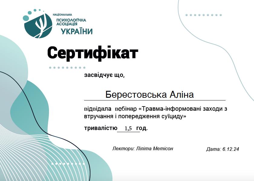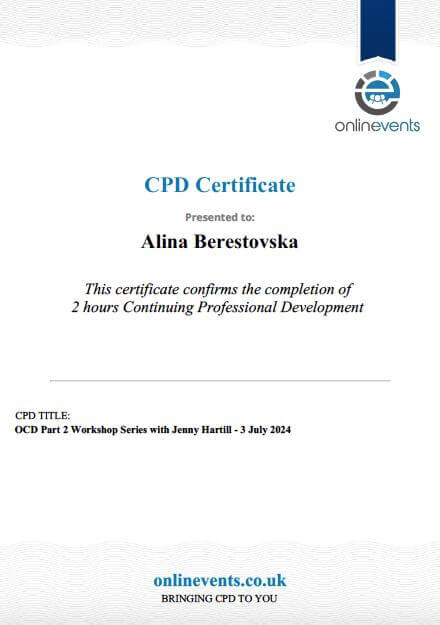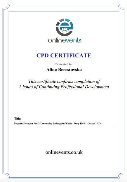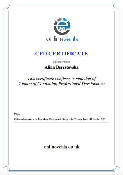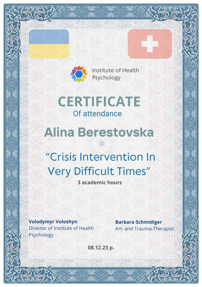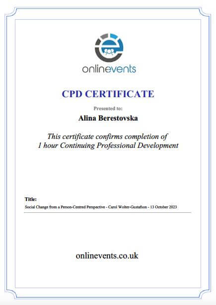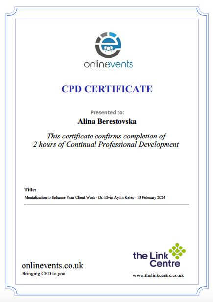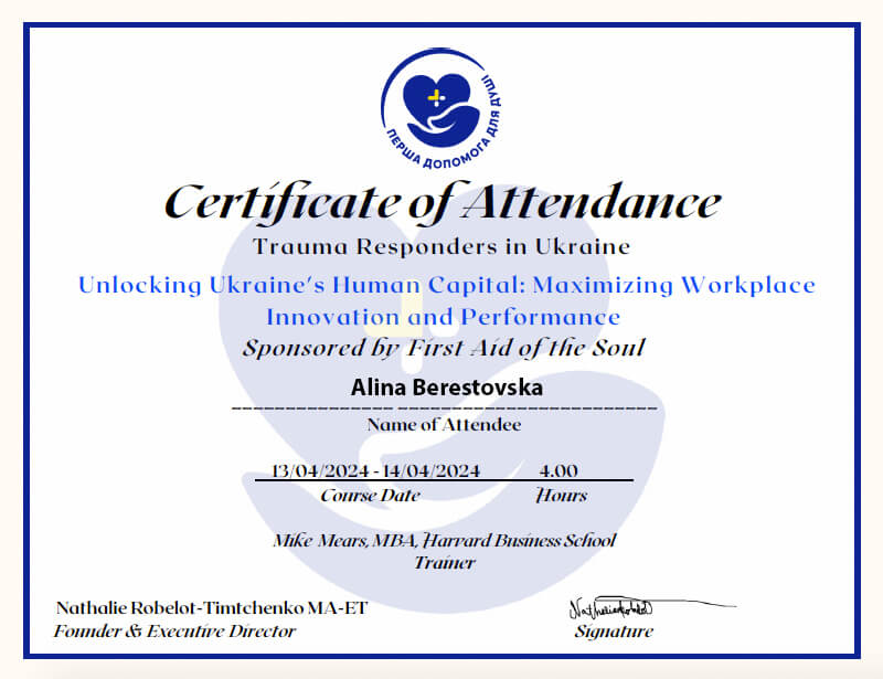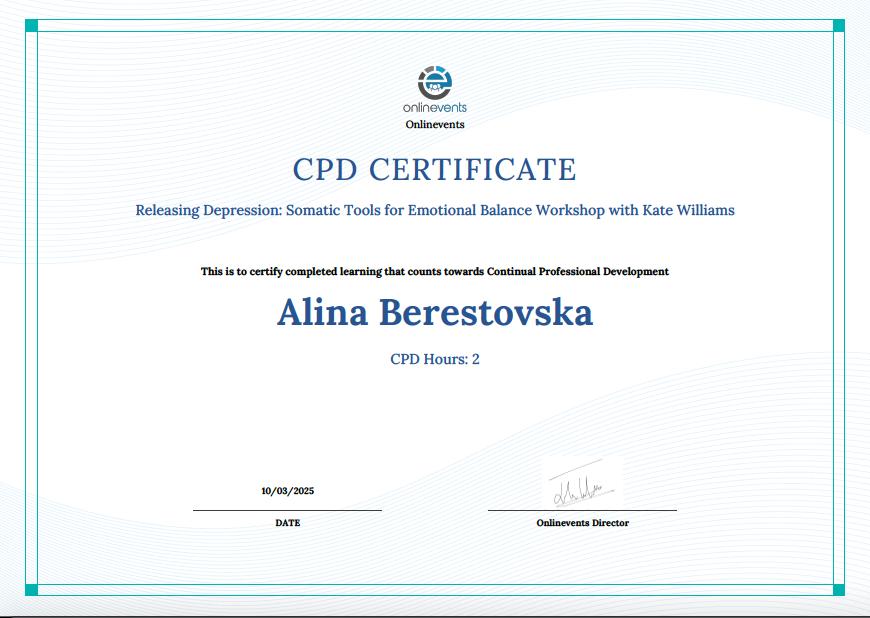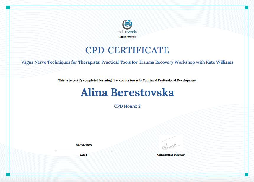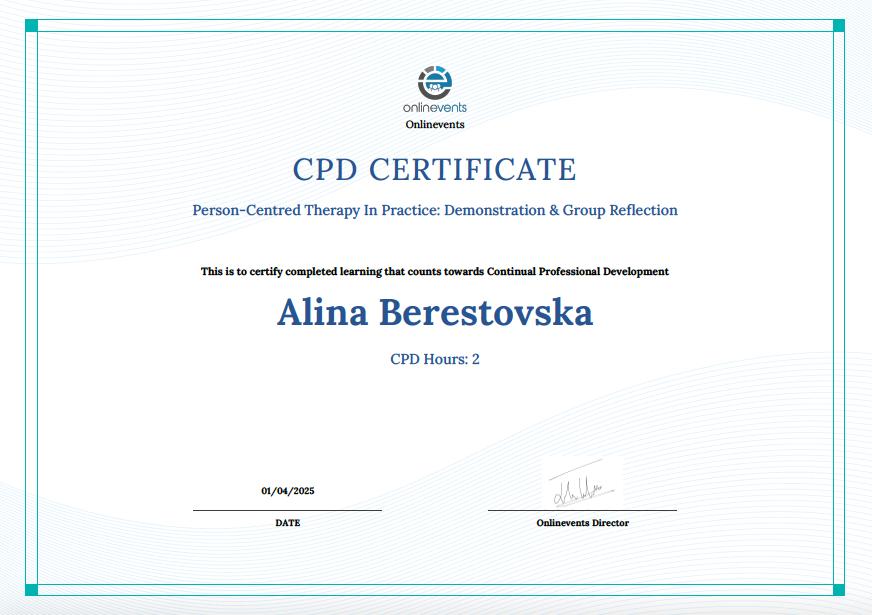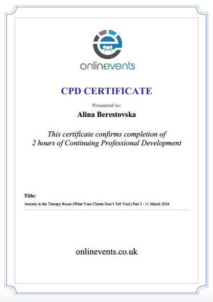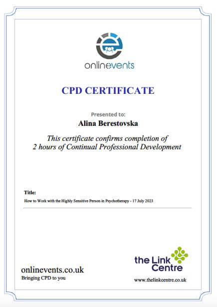 Постійно підвищую професійну компетентність. Крім навчання в модальності транзакційного аналізу, лише за останні 4 роки додатково пройшла більше 800 підтверджених сертифікатами годин навчання на курсах та семінарах з широкого кола питань психічного здоров’я. Серед них, зокрема: кризове консультування, перша психологічна допомога (де маю сертифікацію тренера), робота з травмою, основи травматерапії, психосоматика та онкологічні захворювання, робота з втратою (в тому числі маю досвід проходження 8-крокової програми), робота з невизначеною втратою, робота з біженцями та переселенцями, робота зі складнощами у відносинах (в парі, сім’ї), з тривогою, депресією, провиною, соромом, вигоранням. Маю кваліфікацію практикувати техніку перемотування David Muss. Вивчала основи соматичної терапії травми, соматичного переживання (Somatic Experiencing) за Peter Levine, емоційно-фокусованої терапії, майндфулнес, особистісно-орієнтованої терапії, екзистенційної терапії, наративної терапії, інтерперсональної терапії, КПТ.