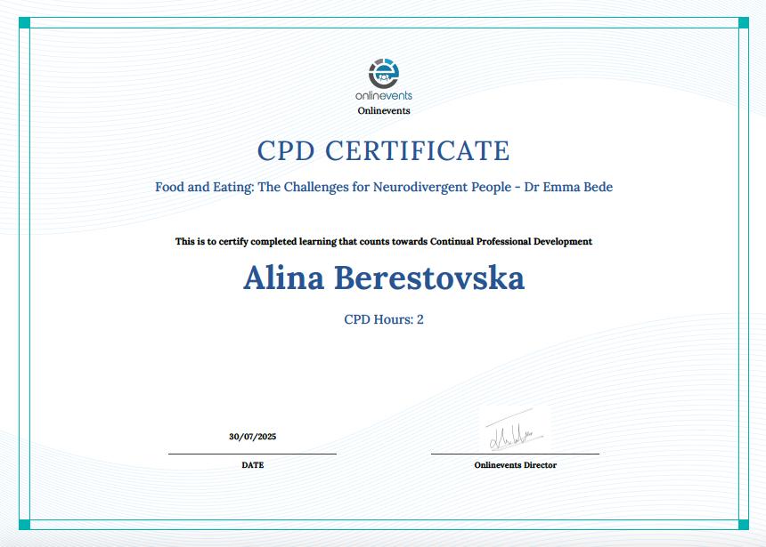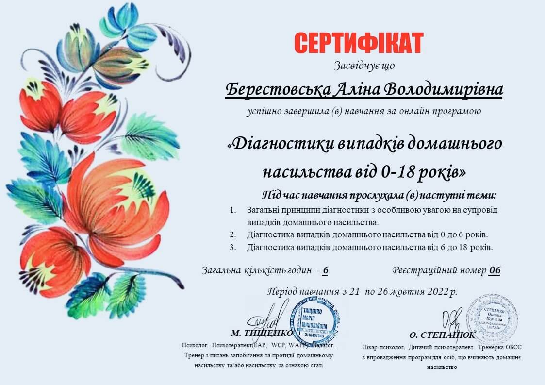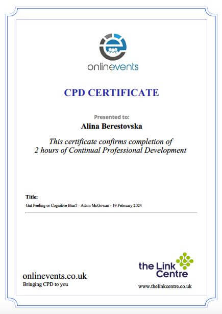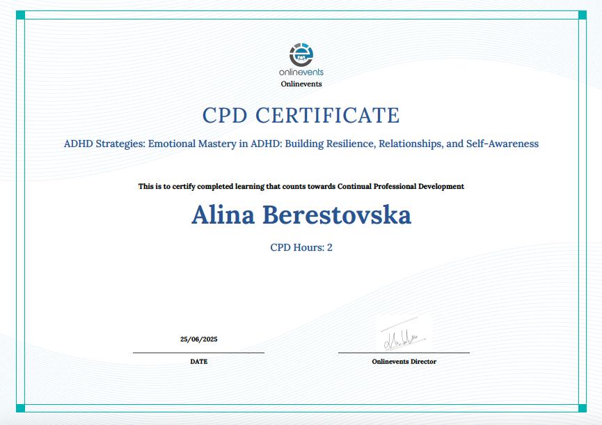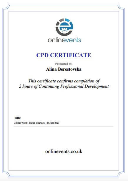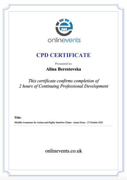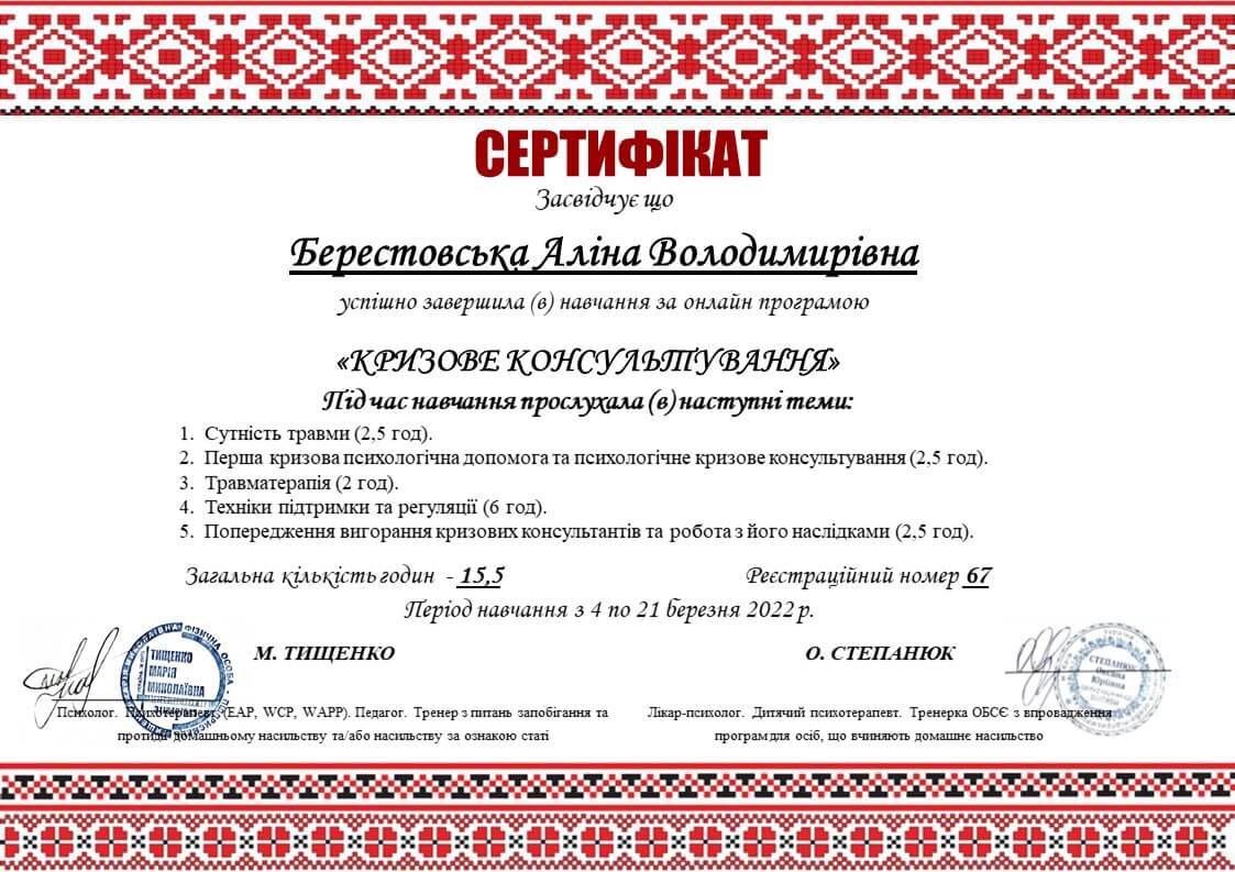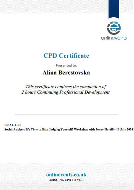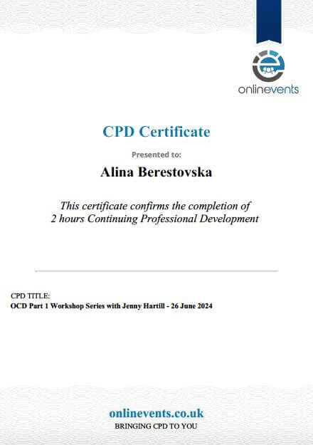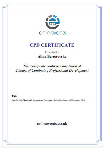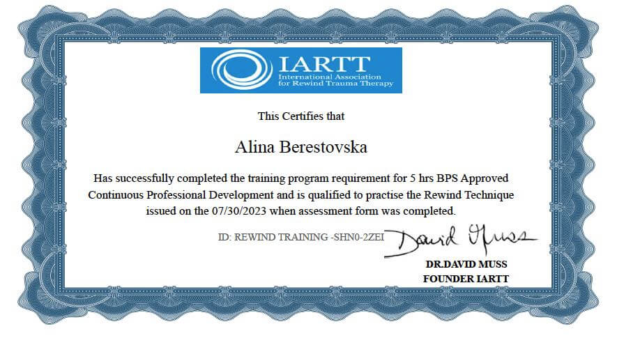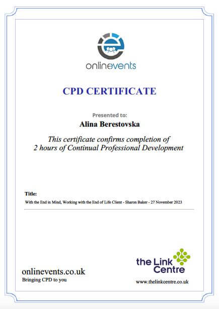Постійно підвищую професійну компетентність. Крім навчання в модальності транзакційного аналізу, лише за останні 4 роки додатково пройшла більше 800 підтверджених сертифікатами годин навчання на курсах та семінарах з широкого кола питань психічного здоров’я. Серед них, зокрема: кризове консультування, перша психологічна допомога (де маю сертифікацію тренера), робота з травмою, основи травматерапії, психосоматика та онкологічні захворювання, робота з втратою (в тому числі маю досвід проходження 8-крокової програми), робота з невизначеною втратою, робота з біженцями та переселенцями, робота зі складнощами у відносинах (в парі, сім’ї), з тривогою, депресією, провиною, соромом, вигоранням. Маю кваліфікацію практикувати техніку перемотування David Muss. Вивчала основи соматичної терапії травми, соматичного переживання (Somatic Experiencing) за Peter Levine, емоційно-фокусованої терапії, майндфулнес, особистісно-орієнтованої терапії, екзистенційної терапії, наративної терапії, інтерперсональної терапії, КПТ.