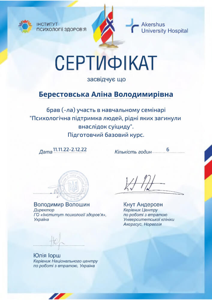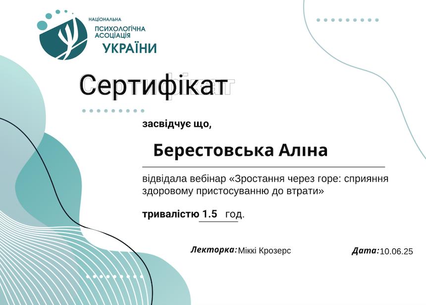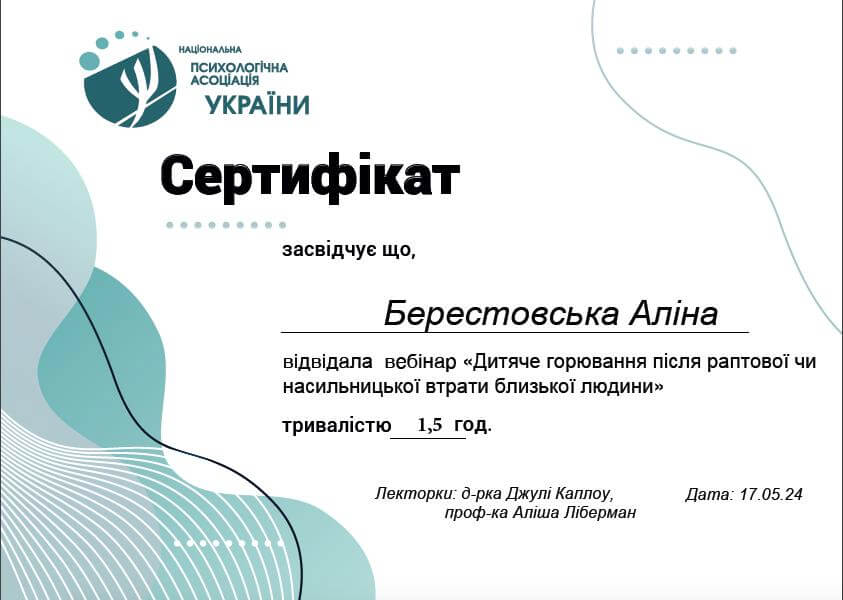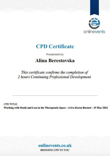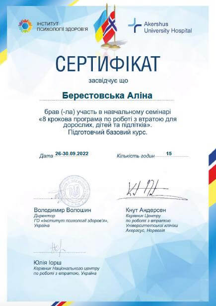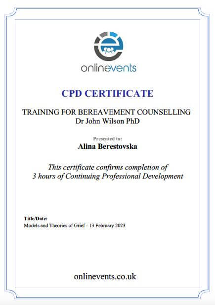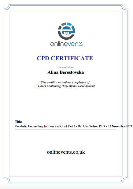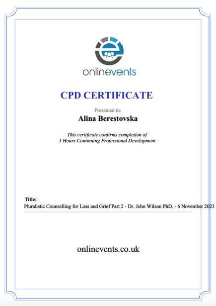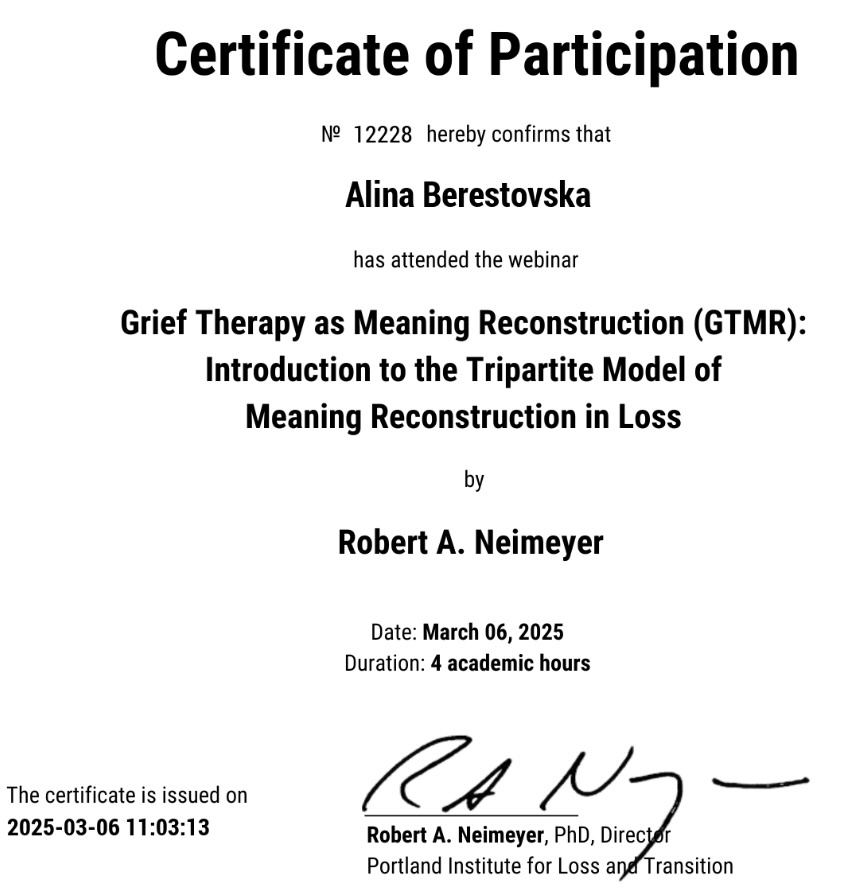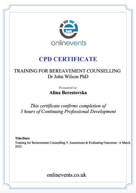 Маю досвід проведення досліджень і написання наукових робіт, присвячених переживанню втрати, а також розробки і проведення сертифікатного курсу «Розуміння горя та робота з людьми, які переживають втрату: теоретико-практичні аспекти» (у співпраці з Навчально-науковим інститутом психології Університету «КРОК»). Курс складався з 7 занять, тривалістю 3 астрономічні години кожне (всього – 28 академічних годин; 17 год. самостійної роботи / 1,5 кредити ECTS).