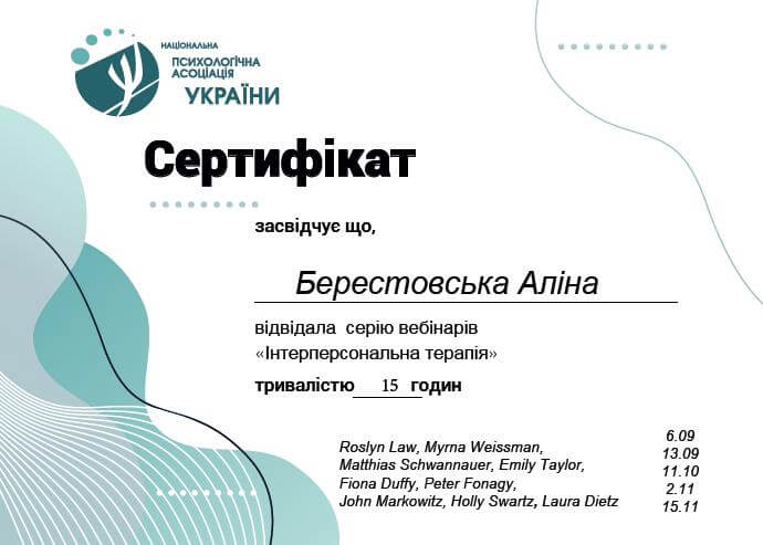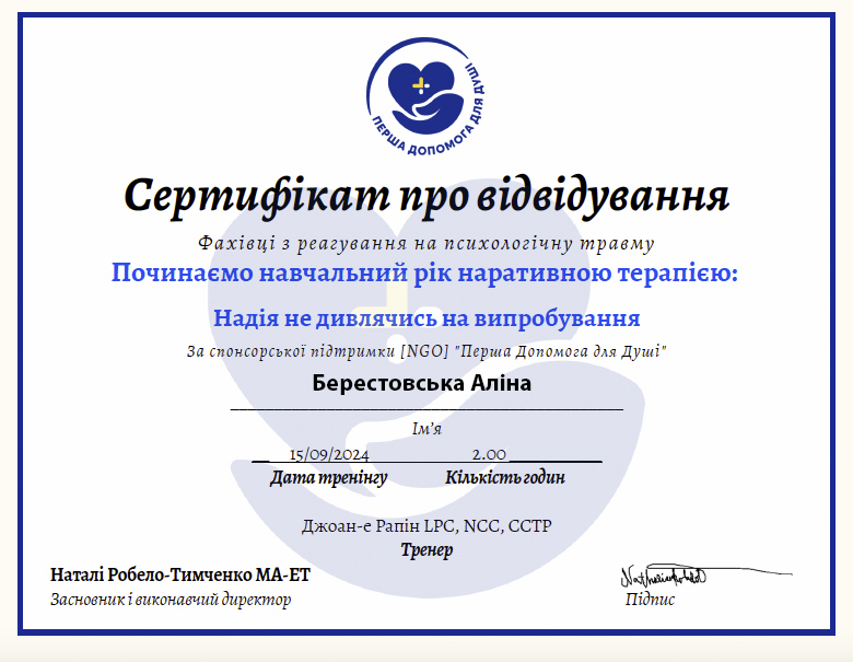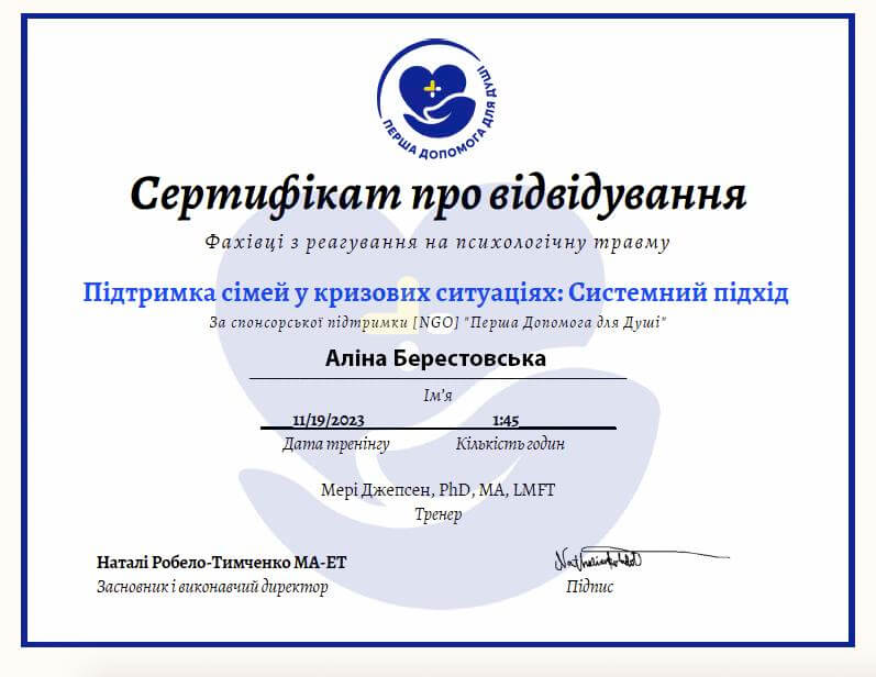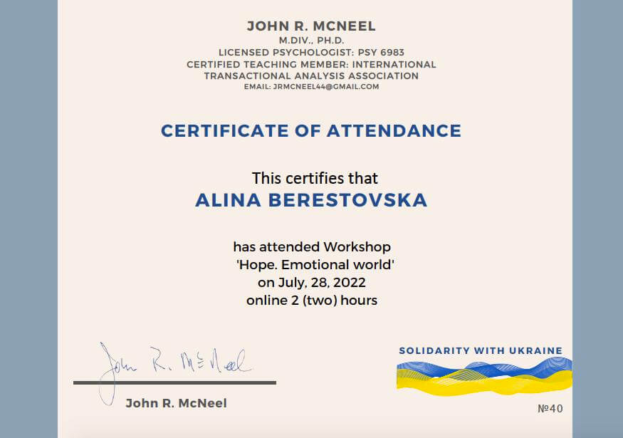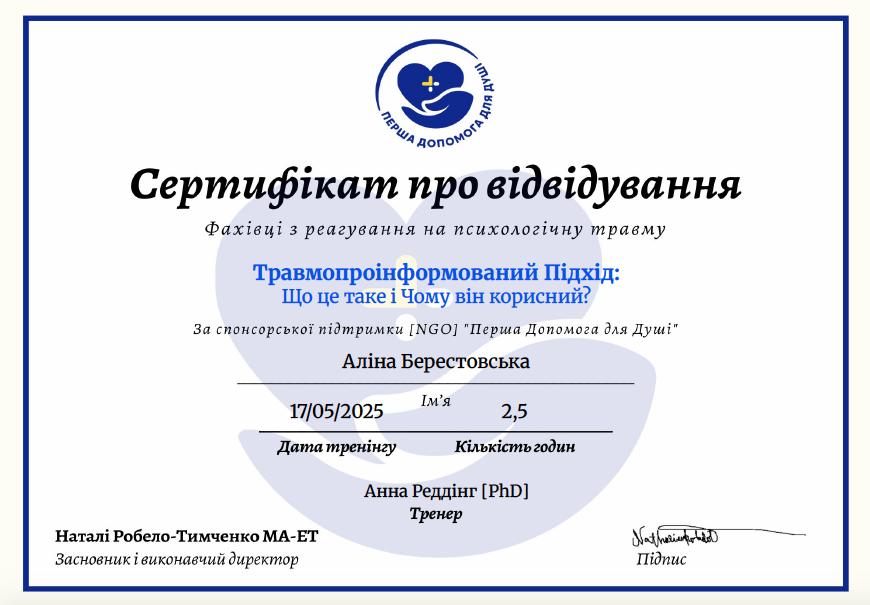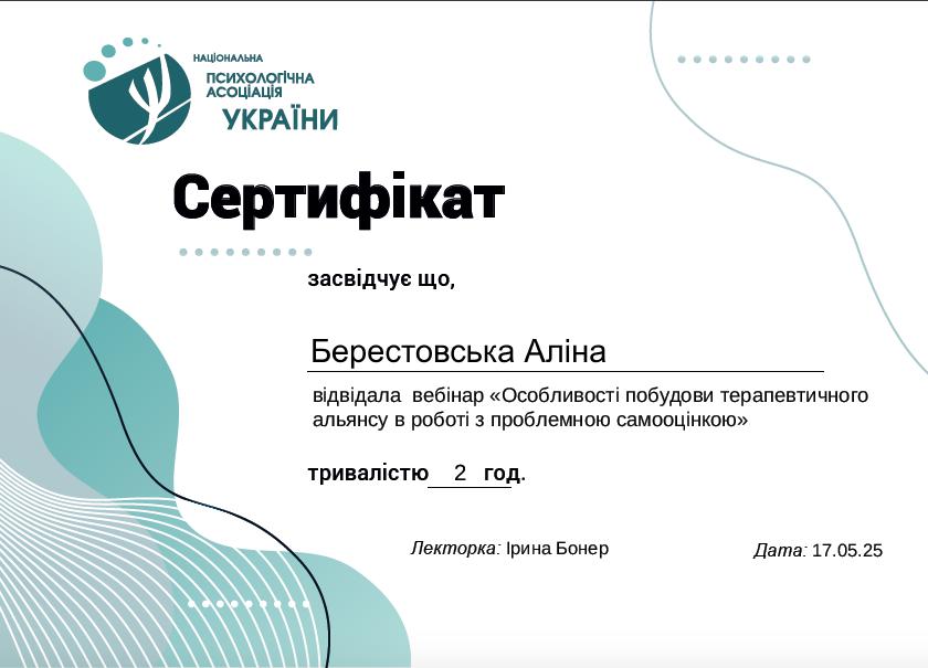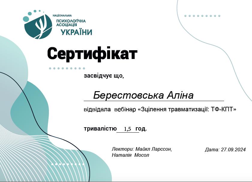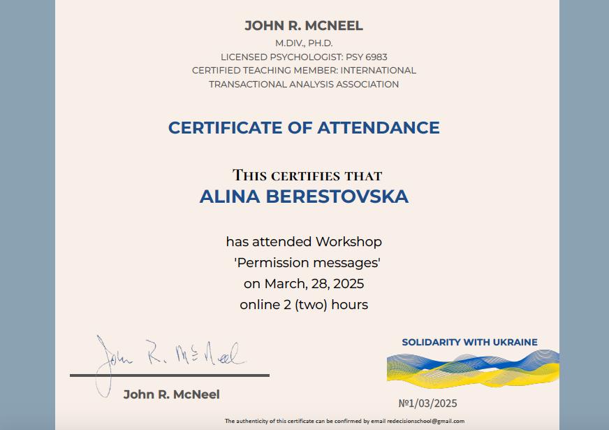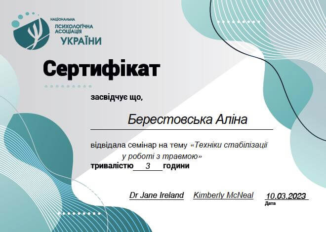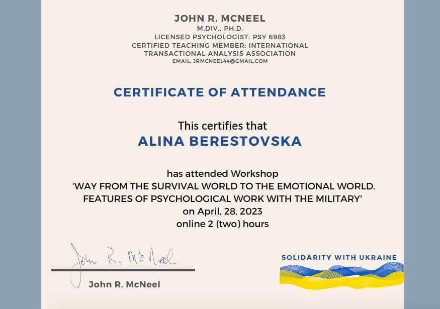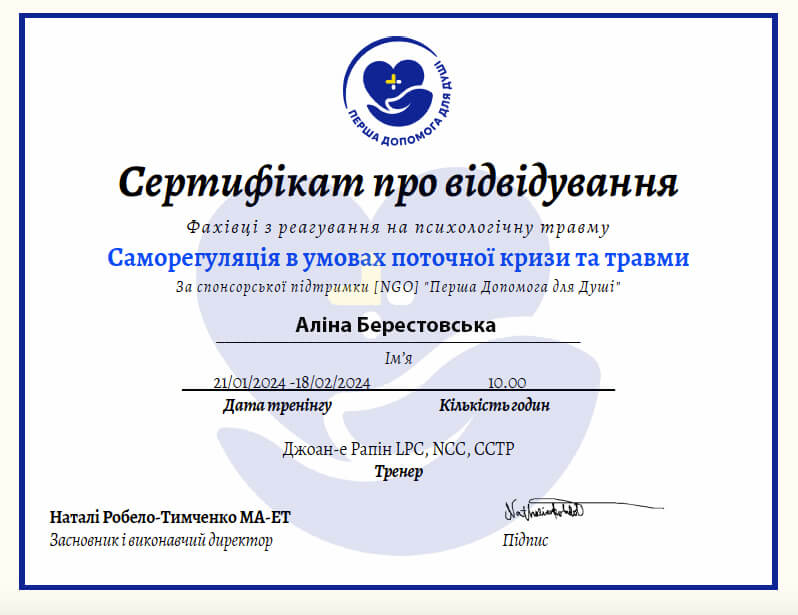 Мені – 35. Психолог (магістр психології), член Європейської Асоціації Транзакційного Аналізу (EATA), Української Спільноти Транзакційного Аналізу (УСТА), Національної психологічної асоціації (НПА). Маю завершене психотерапевтичне навчання в модальності транзакційного аналізу та спеціалізацію з клінічної психології. В сфері психології – 6 років. В роботі керуюсь професійними знаннями та етичними нормами.