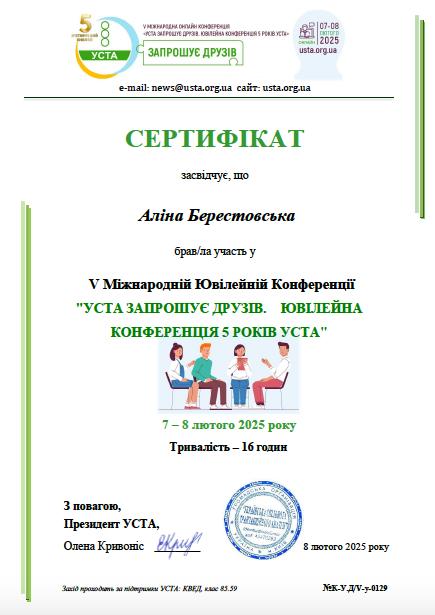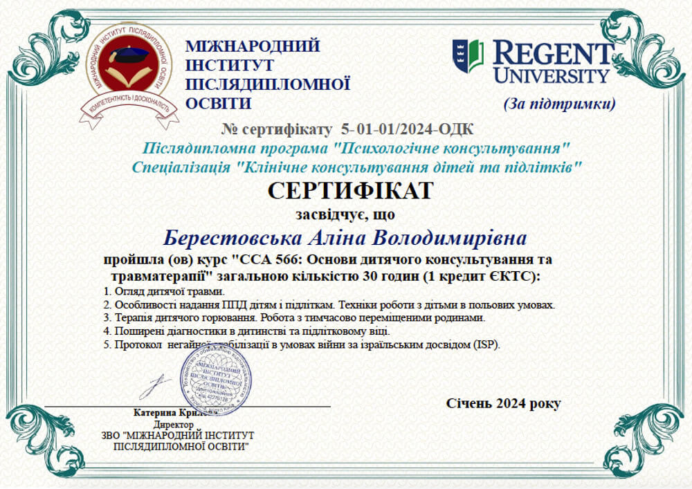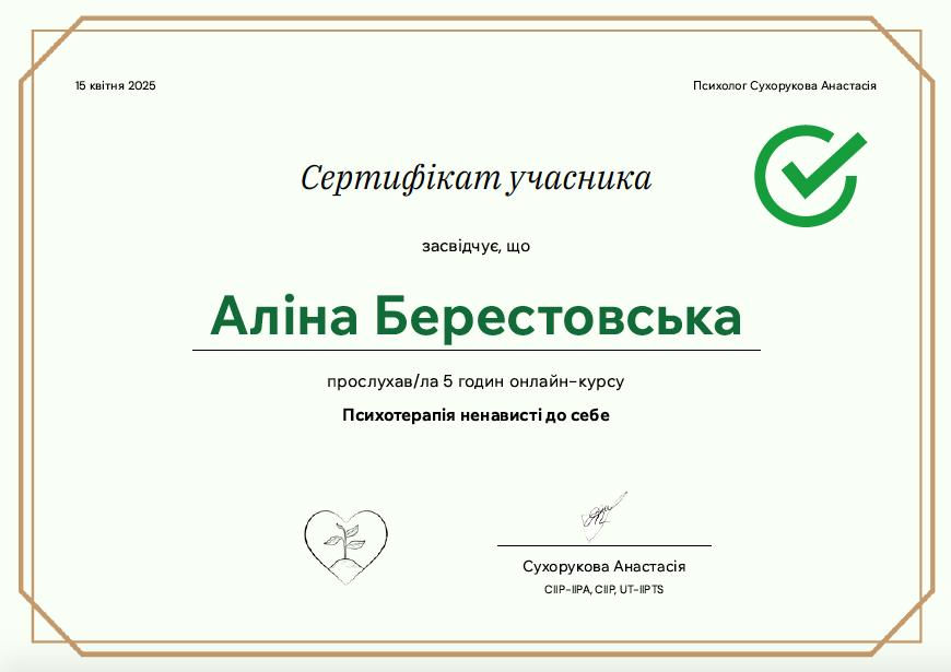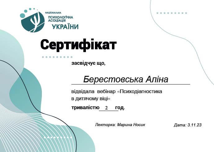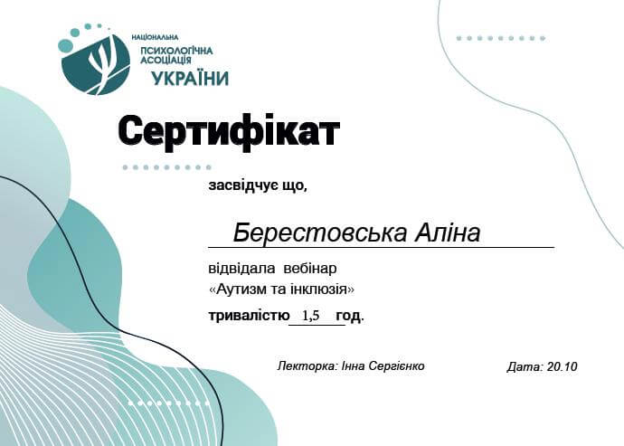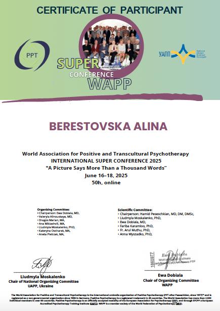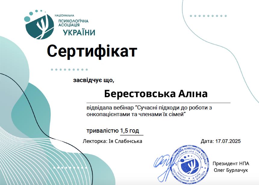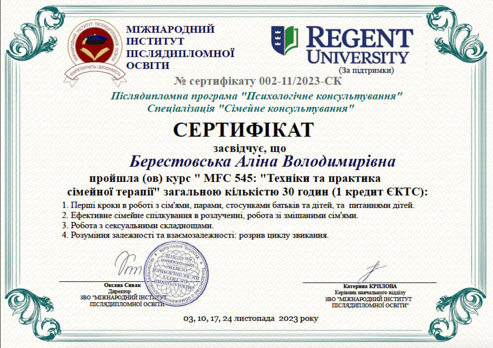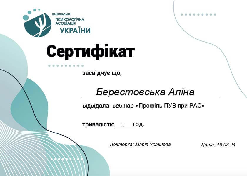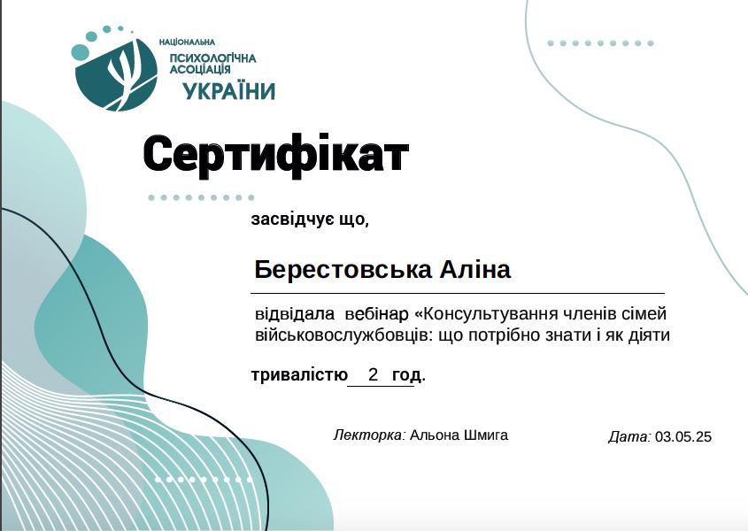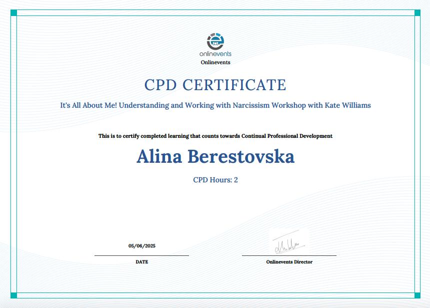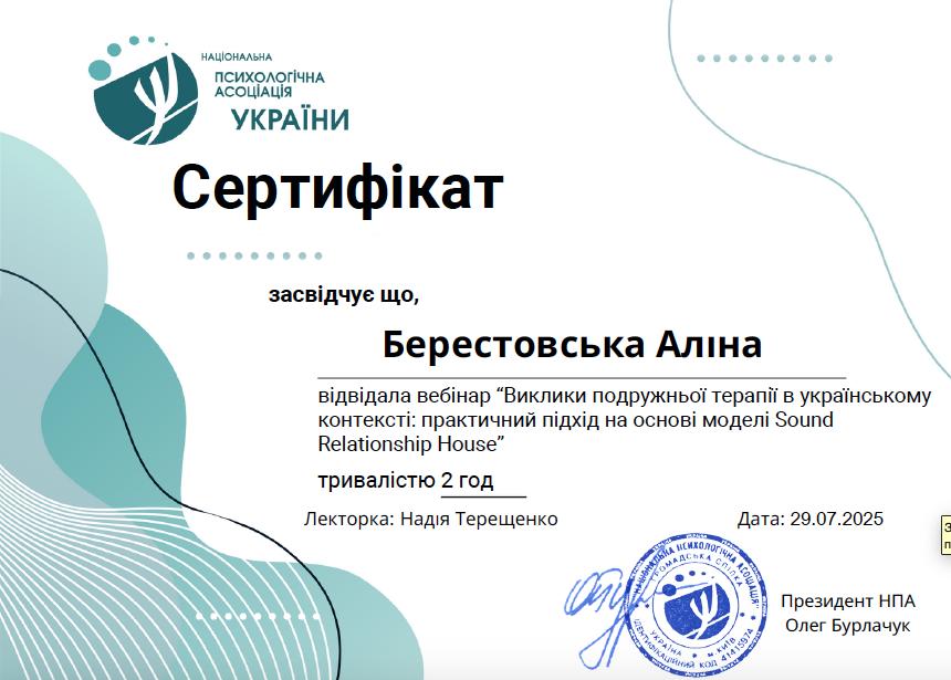 Мені – 35. Психолог (магістр психології), член Європейської Асоціації Транзакційного Аналізу (EATA), Української Спільноти Транзакційного Аналізу (УСТА), Національної психологічної асоціації (НПА). Маю завершене психотерапевтичне навчання в модальності транзакційного аналізу та спеціалізацію з клінічної психології. В сфері психології – 6 років. В роботі керуюсь професійними знаннями та етичними нормами.