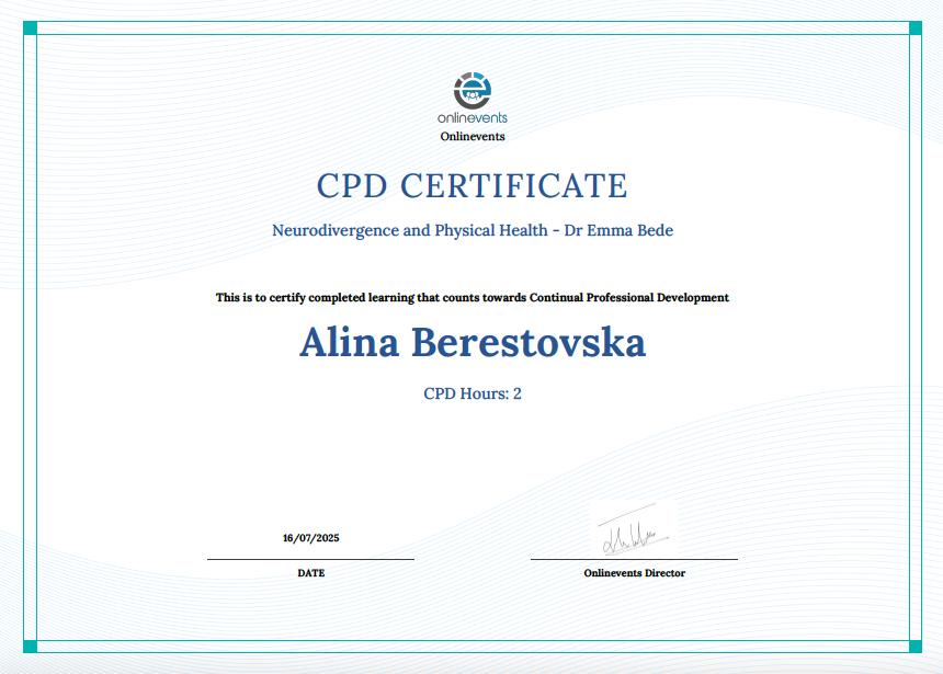 Навіть якщо мої клієнти мають поставлені психіатром діагнози, ніколи не сприймаю їх через призму цих діагнозів. Діагнози лише дають інформацію, яку враховую в терапевтичному плані, та можливість для клієнтів отримати медикаментозну підтримку. Вони не роблять людей слабкими, поламаними, якимись не такими, як вони мають бути. Якими б не були діагнози, для мене цінні люди як особистості. За будь-яких умов вони для мене – Ok.