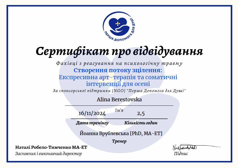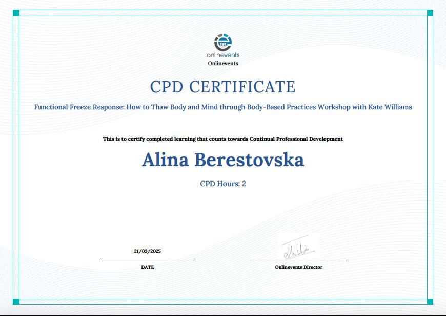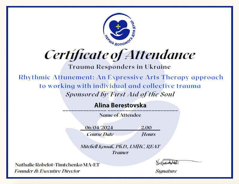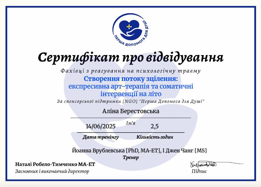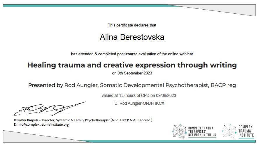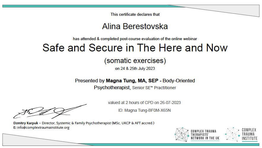На власному досвіді та досвіді своїх клієнтів переконалась, що травматичні досвіди недостатньо когнітивно осмислити – їх треба прожити в безпечному контакті, в присутності емпатійного, ресурсного, стабільного іншого і завершити, дозволивши вийти тим емоціям, що були подавлені, та тим тілесним реакціям, які залишились завмерлими, застиглими, нереалізованими. Інакше неможливо рухатись до зцілення, залишити минуле в минулому й отримати можливість іншого теперішнього та майбутнього.