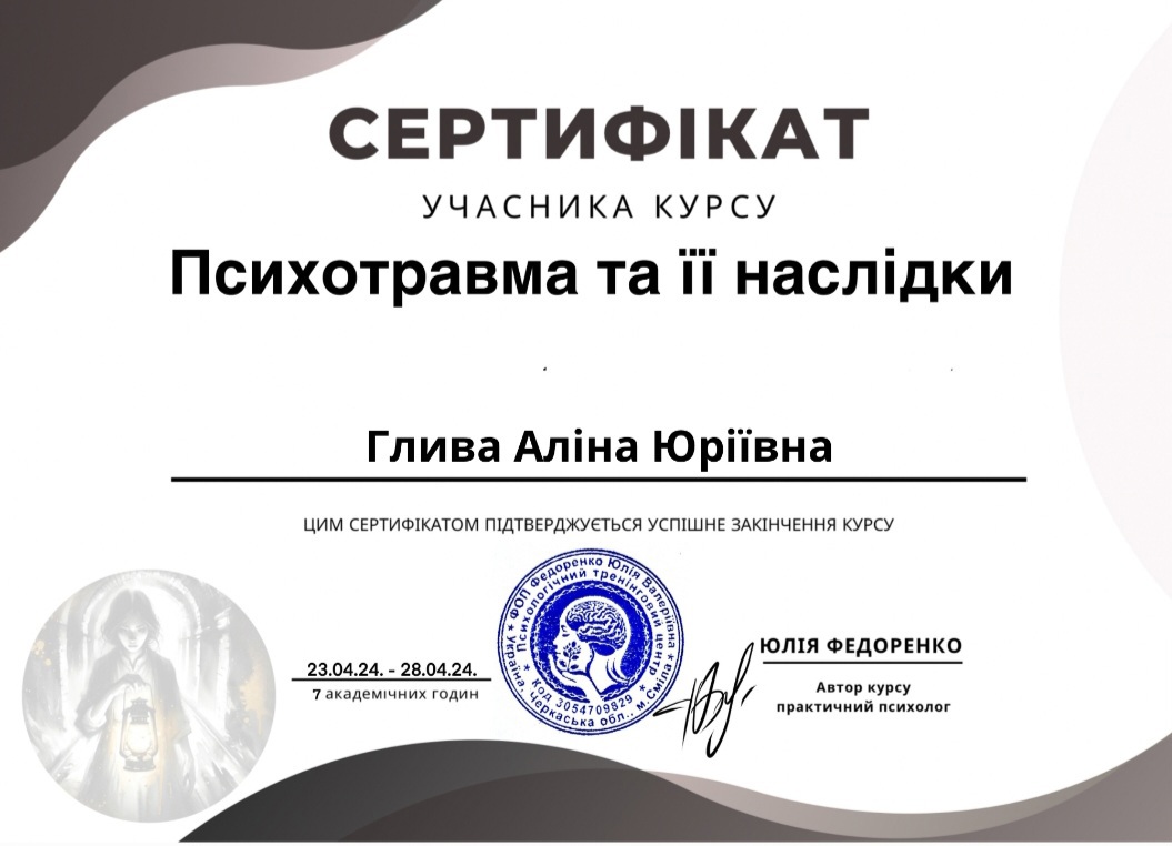 Мій розвиток як фахівця у галузі психології не зупиняється на досягнутому. Я постійно поглиблюю свої знання та навички через особисту психотерапію, регулярну участь в інтервізійних групах та системну супервізійну підтримку. Вірю, що бути психологом — це безперервна освіта та постійна робота над собою задля надання якісної та ефективної допомоги.