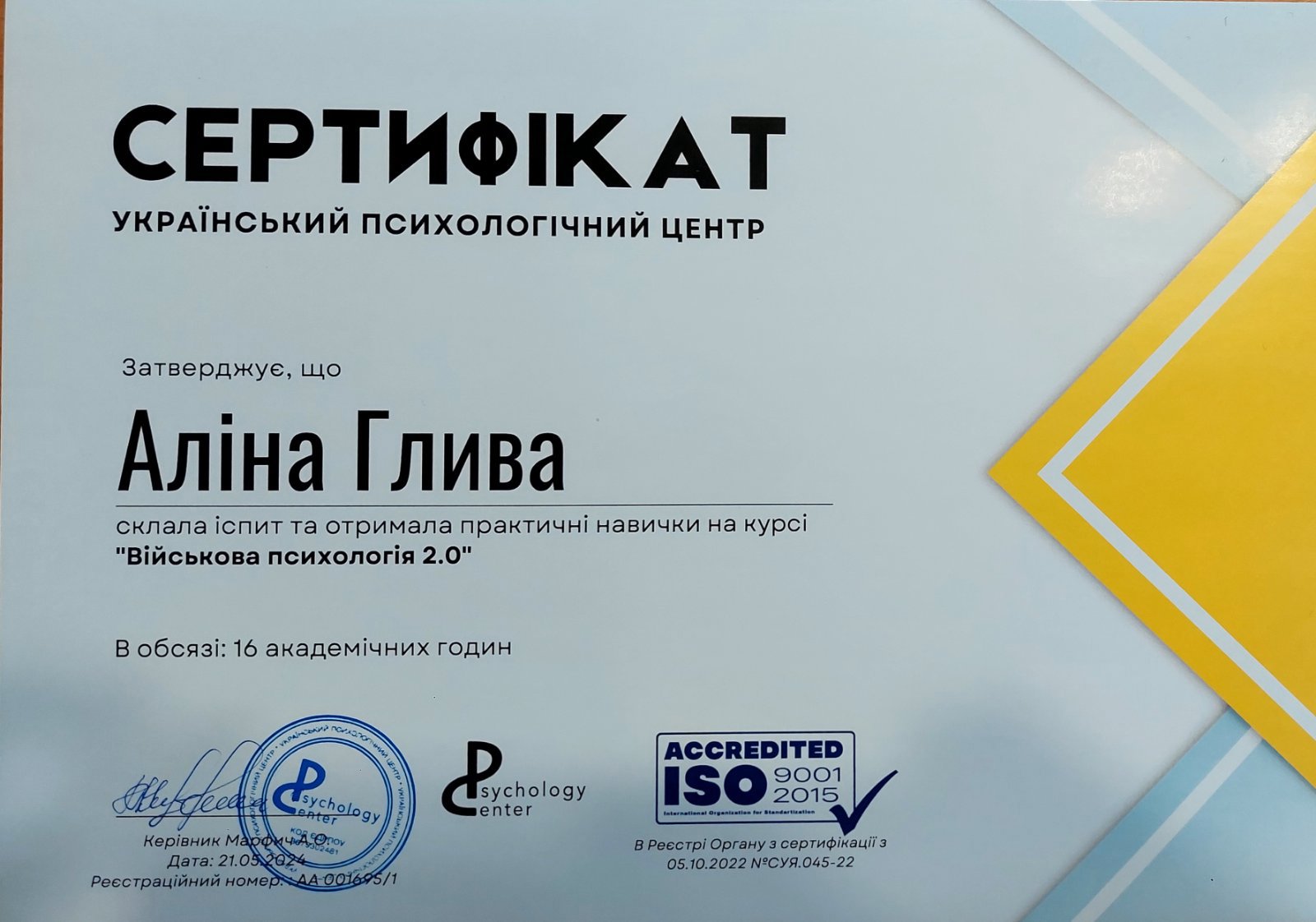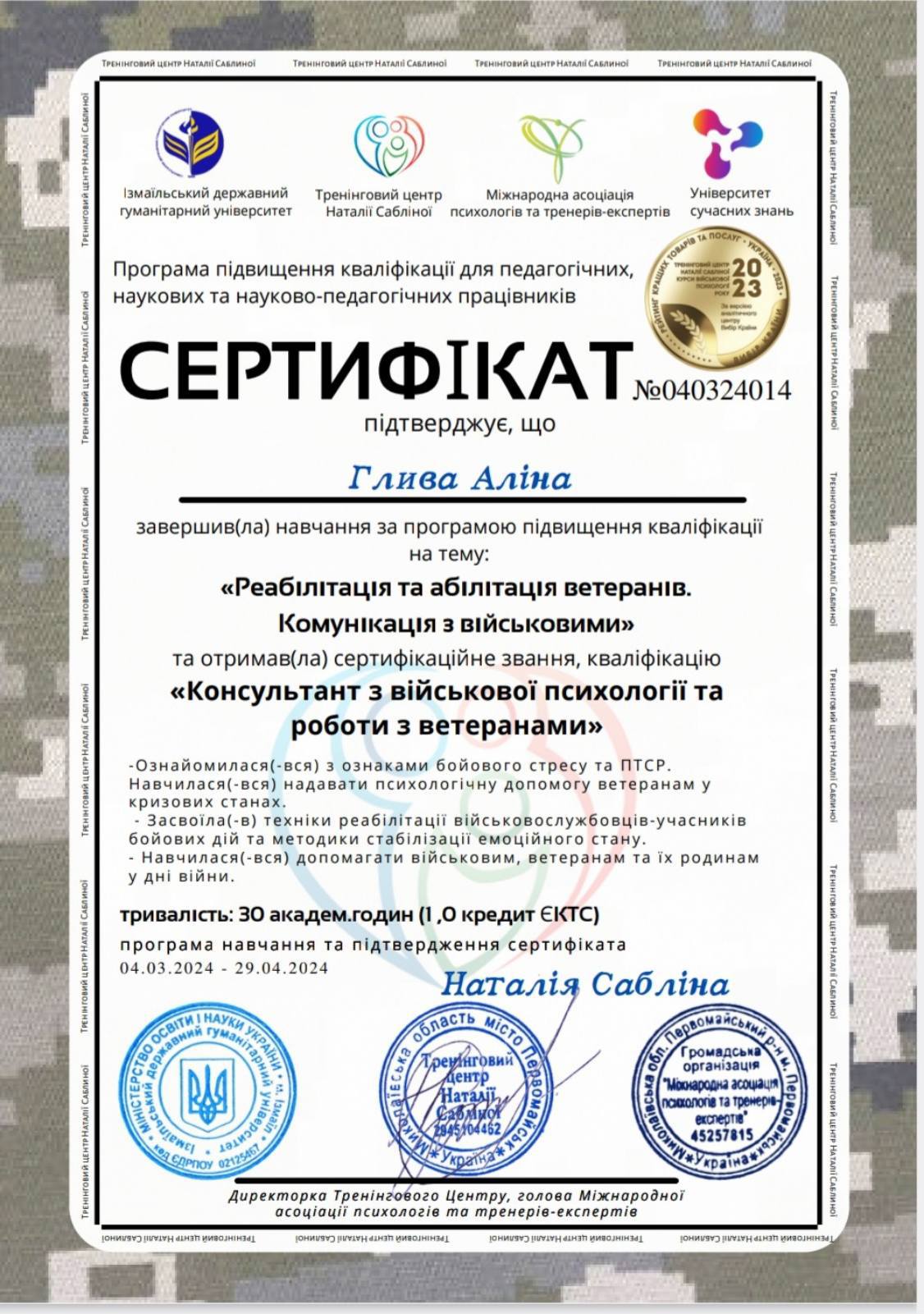1. Південноукраїнський інститут психології, психотерапії та управління, сертифікат базового консультанта у методі позитивної та транскультуральної психотерапії;