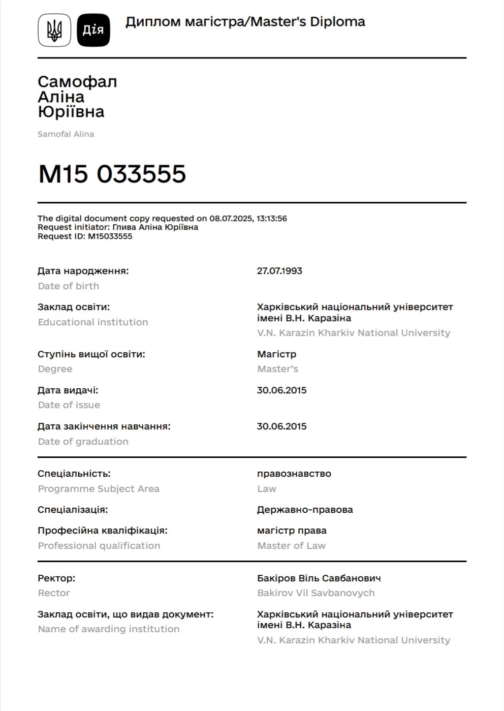 2.Спеціальність: Правознавство; ступінь вищої освіти: магістр права, Харківський національний університет ім. В.Н. Каразіна.