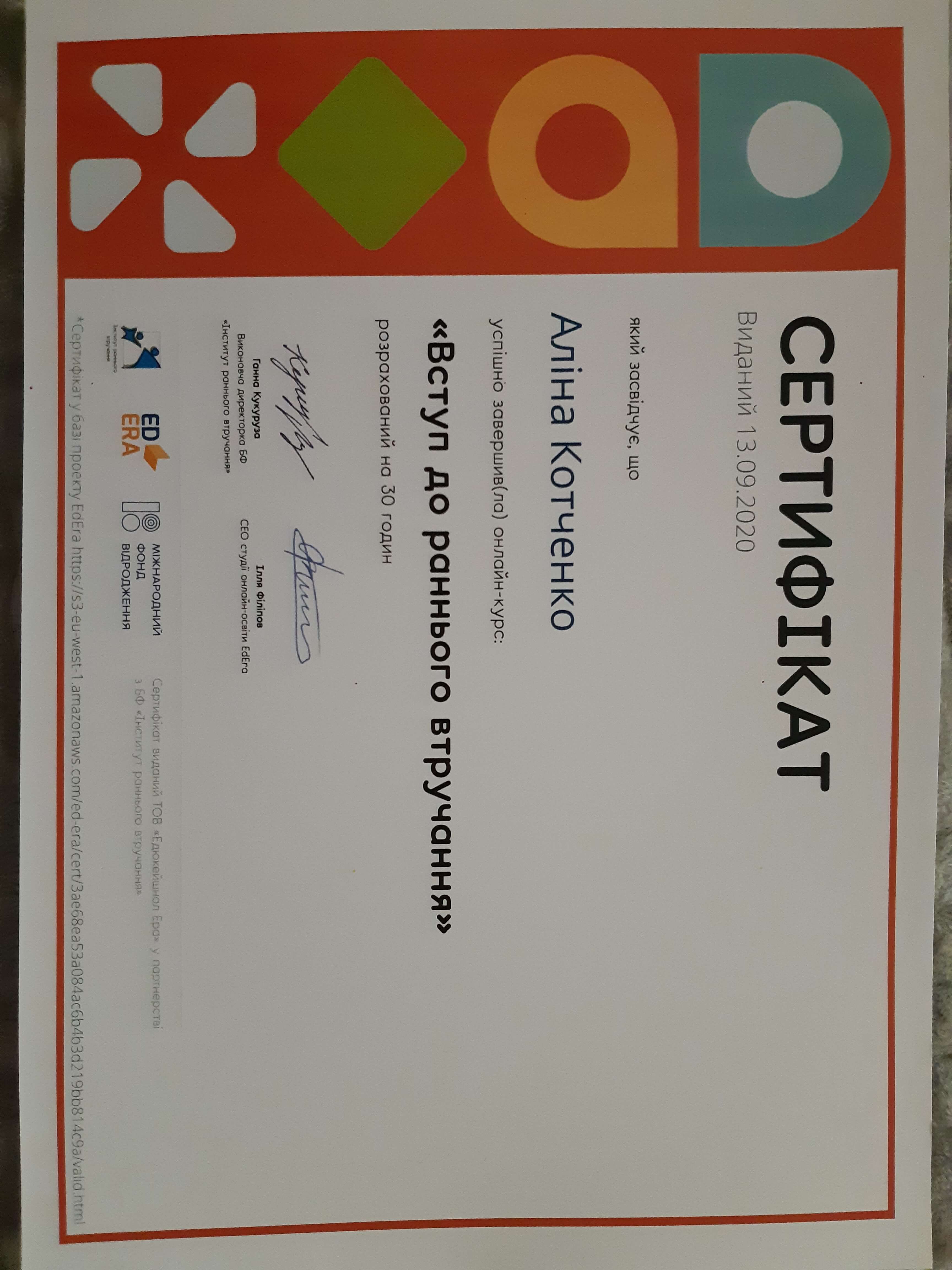 Курс "Вступ до раннього втручання" (2020);