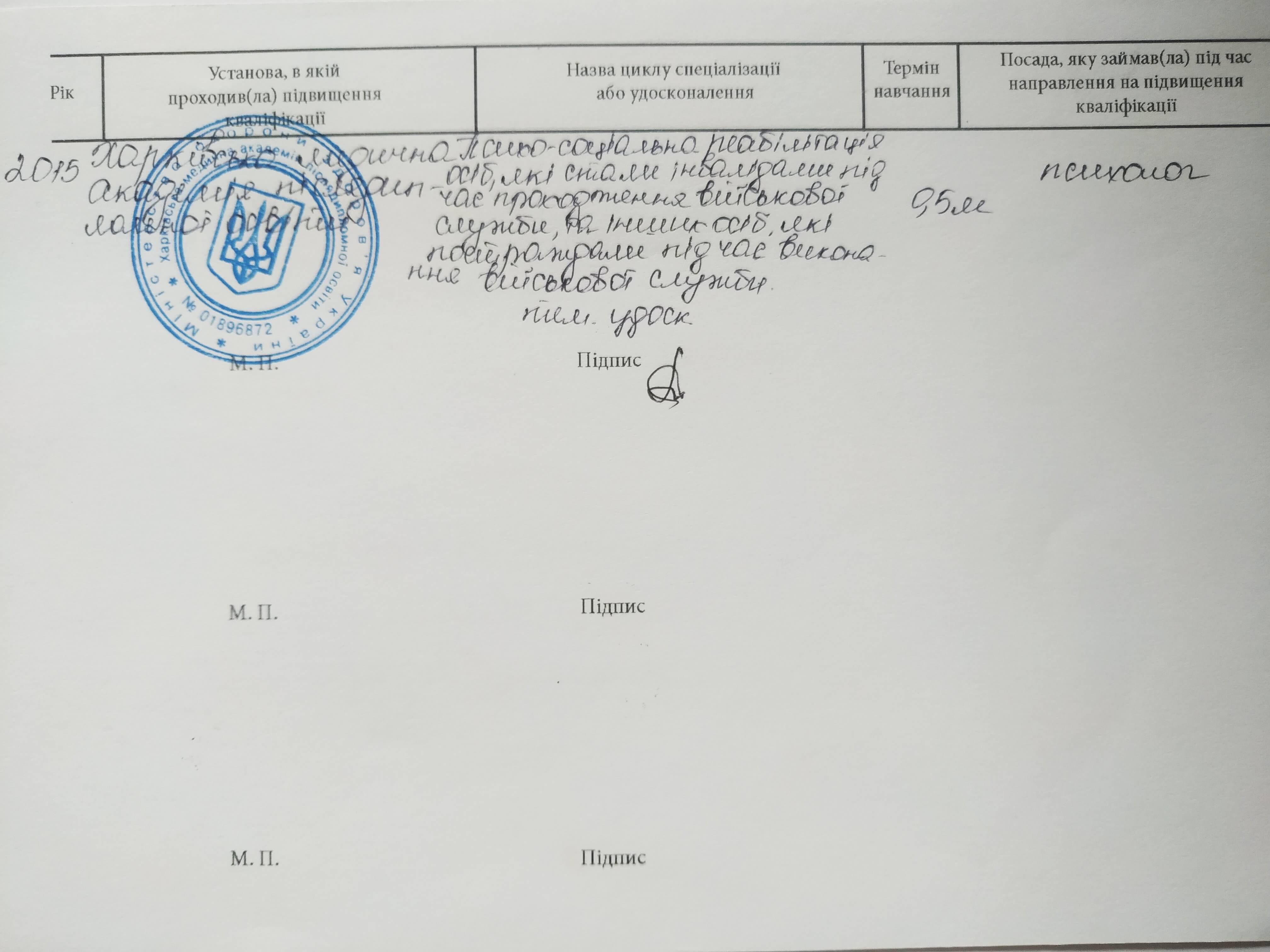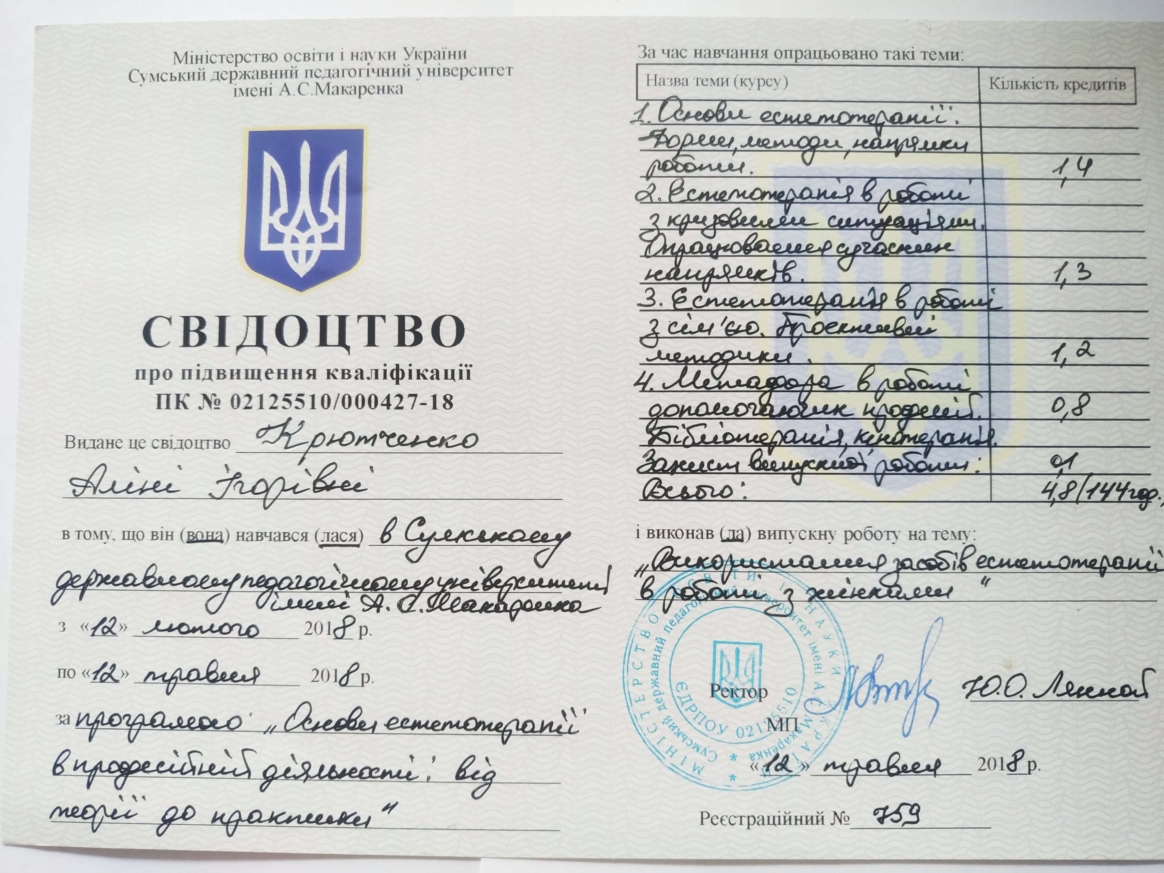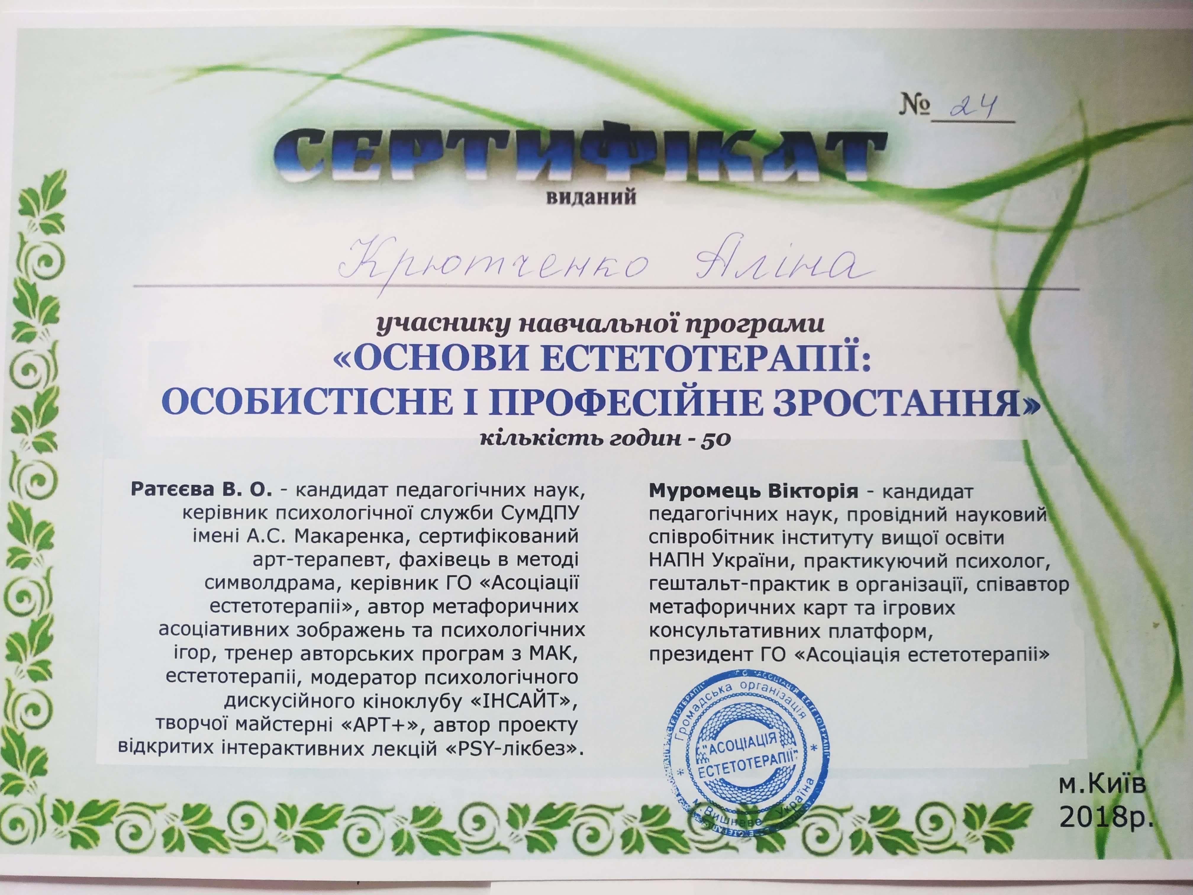 ● Курси підвищення кваліфікації: СумДПУім.А.С.Макаренка. Програма: «Основи естетотерапії в професійній діяльності: від теорії до практики» (2018 р.).