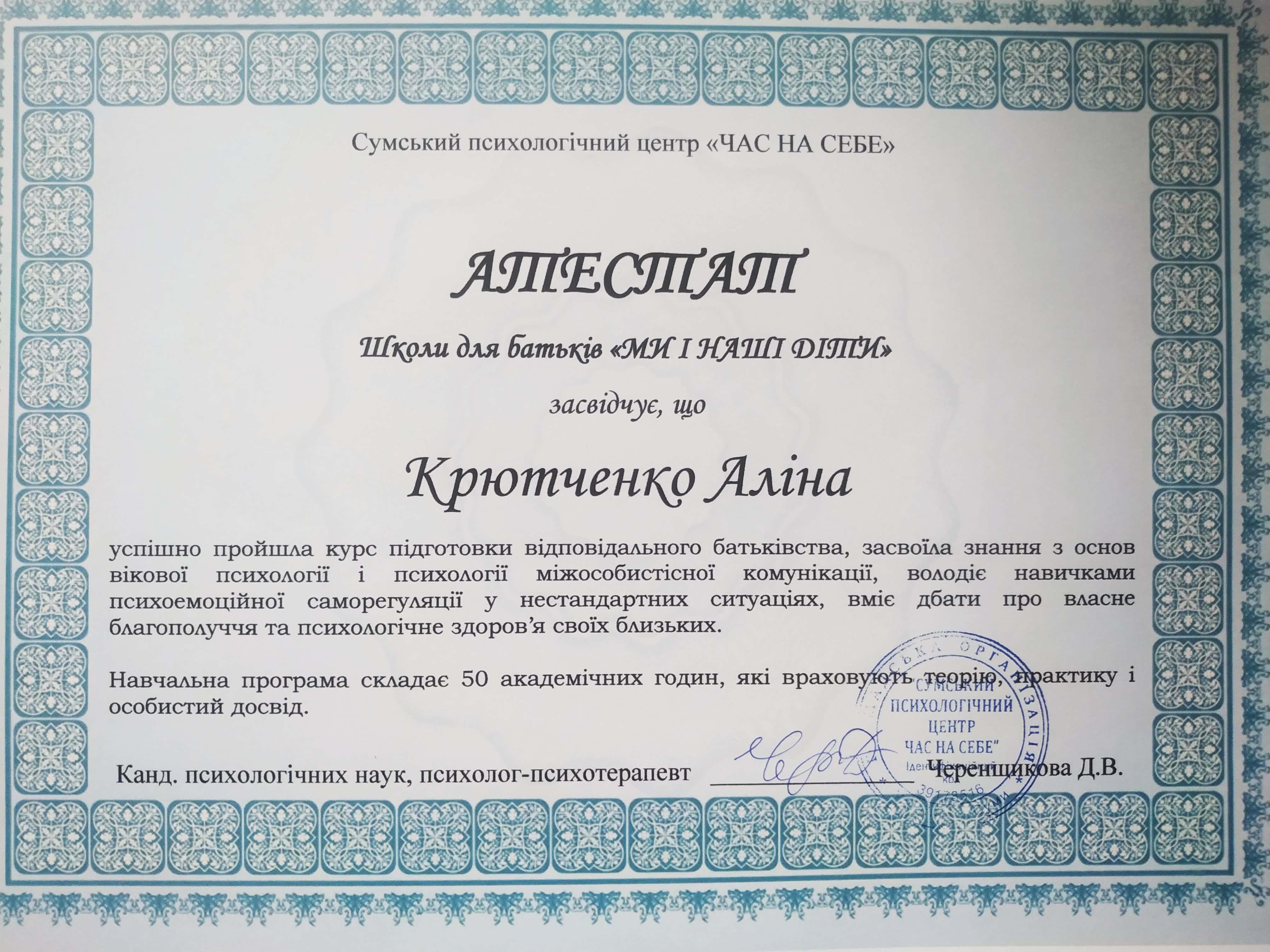 ● Базовий курс з Позитивної Психотерапії, Всесвітня Асоціація Позитивної психотерапії та Український Інститут Позитивної крос-культурної психотерапії та менеджменту