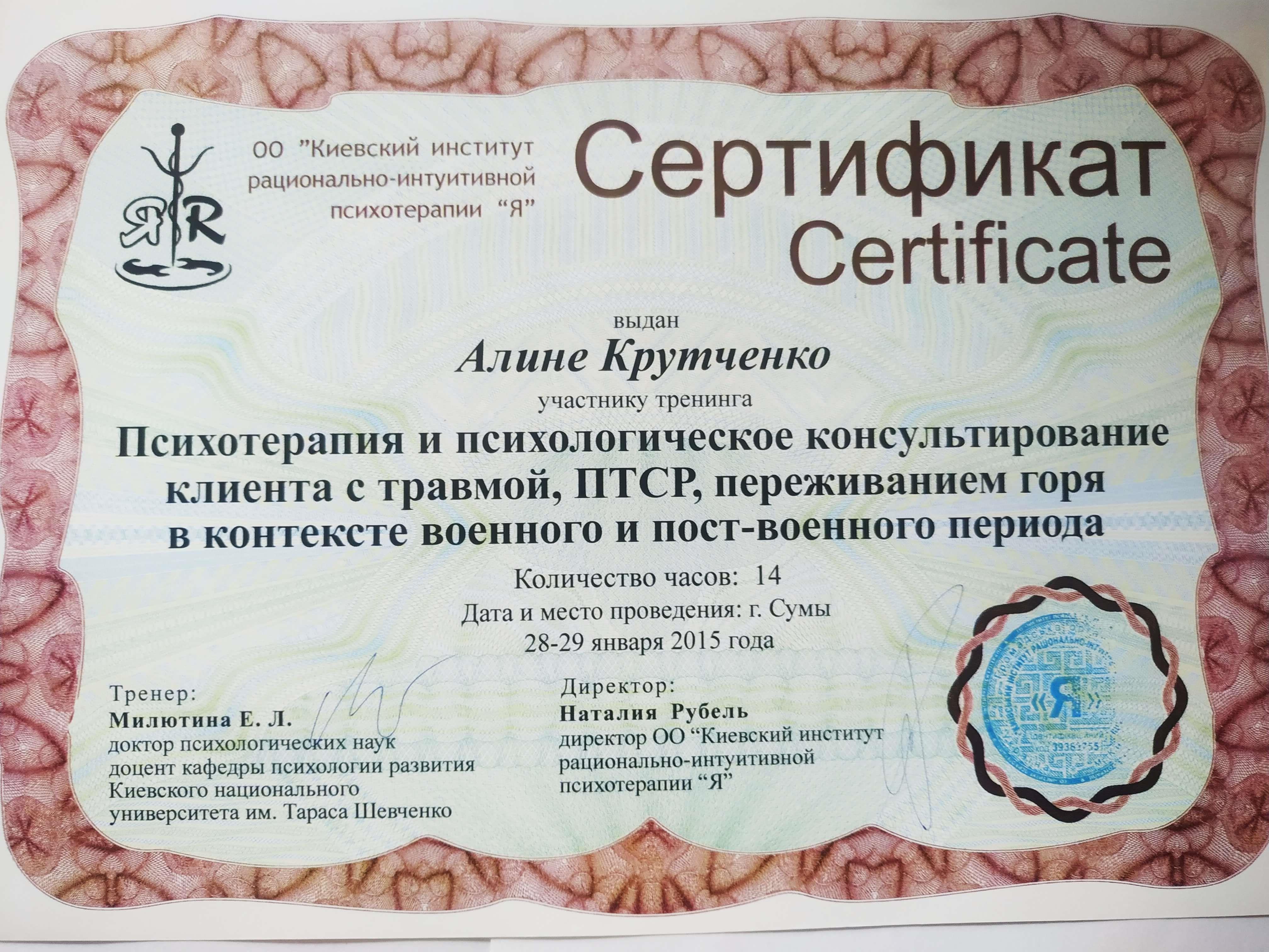 ● Навчання щодо організаціїнадання соціально-психологічної допомоги дітям та їх сім’ям, переміщеним в регіони України з тимчасово окупованої території та районів проведення антитерористичної операції. Міжнародний інститут глибинної психології (квітень2015 р.).