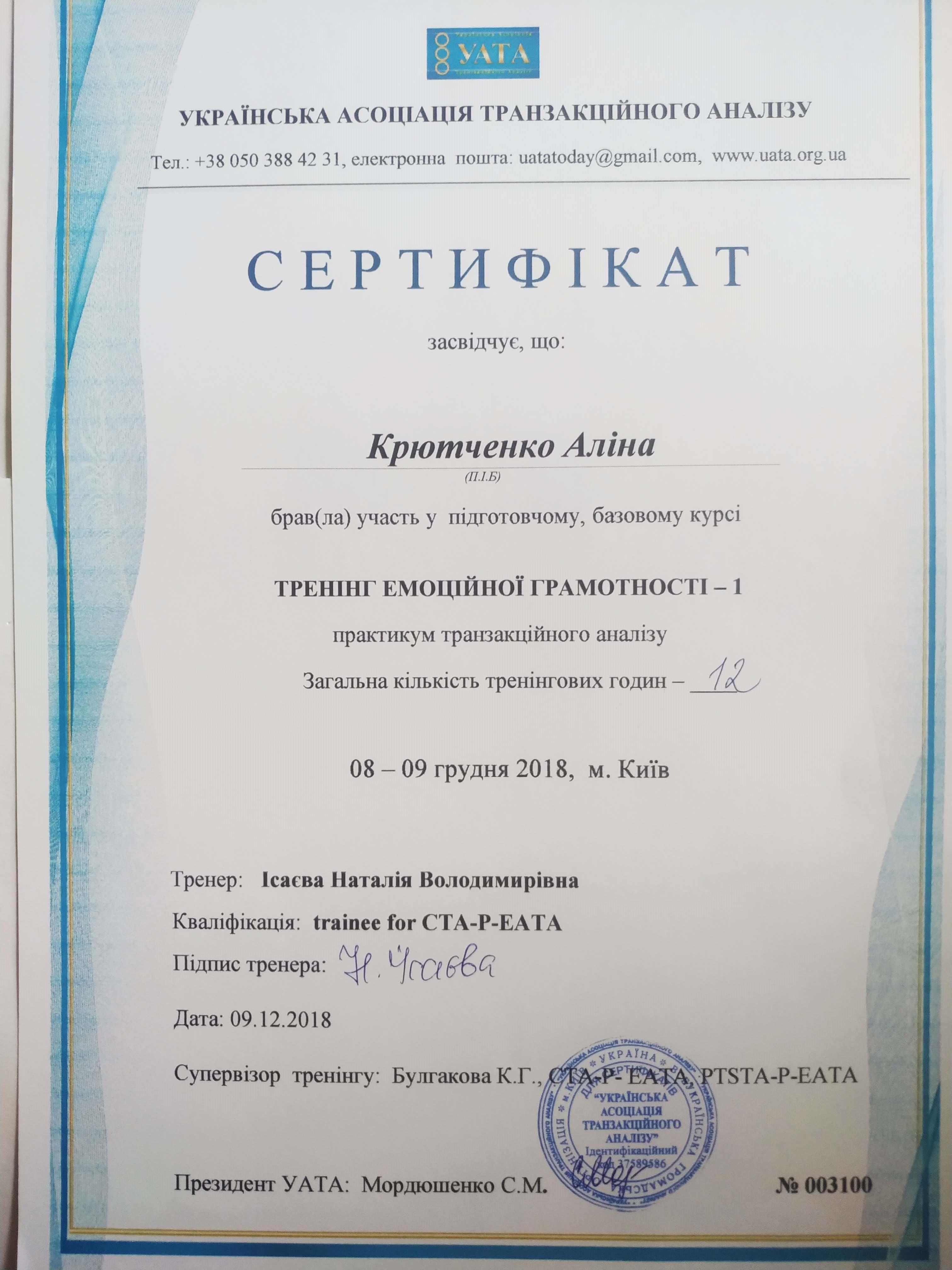 ● Українська асоціація транзакційного аналізу Базовий курс «Тренінг емоційної грамотності-1» (грудень 2018р.).