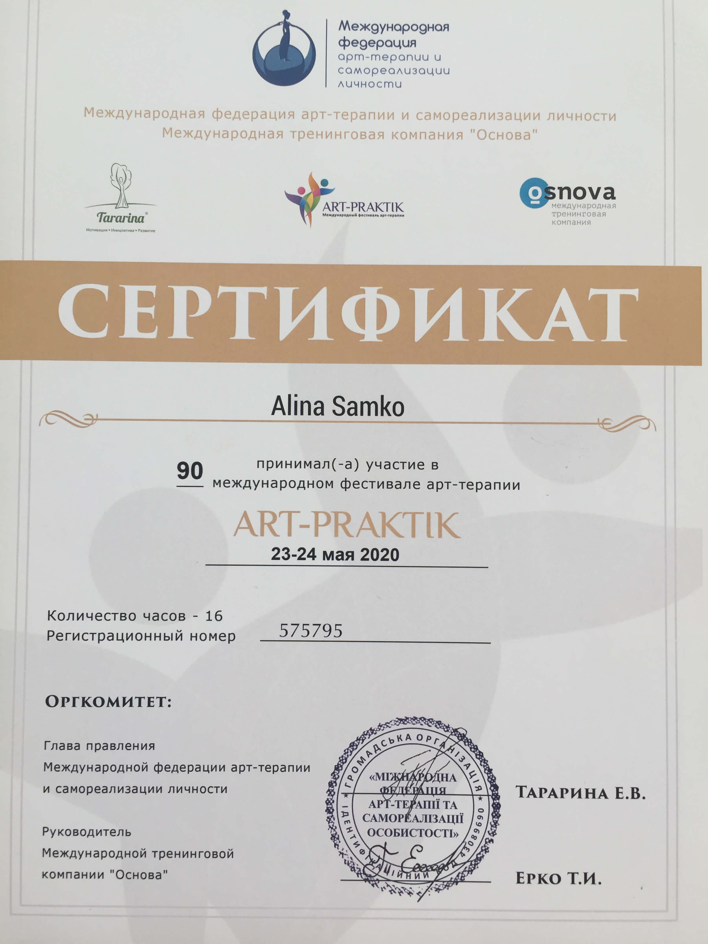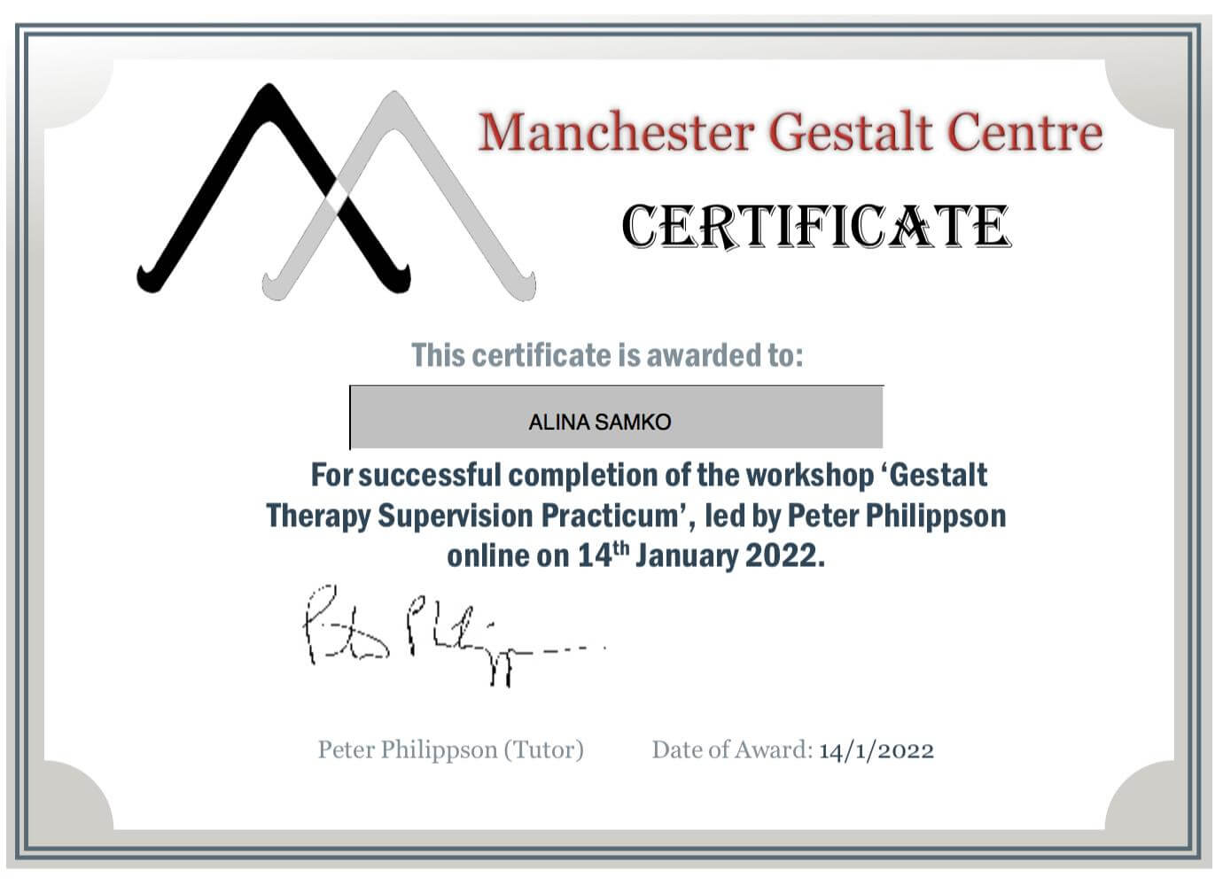 Постійна супервізійна міжнародна група (Пітер Філіпсон). Супервізійні групи зі Світланою Юркович, Світланою Кілару. Trauma Therapy - Regent University, Israel Project, International Trauma Center.