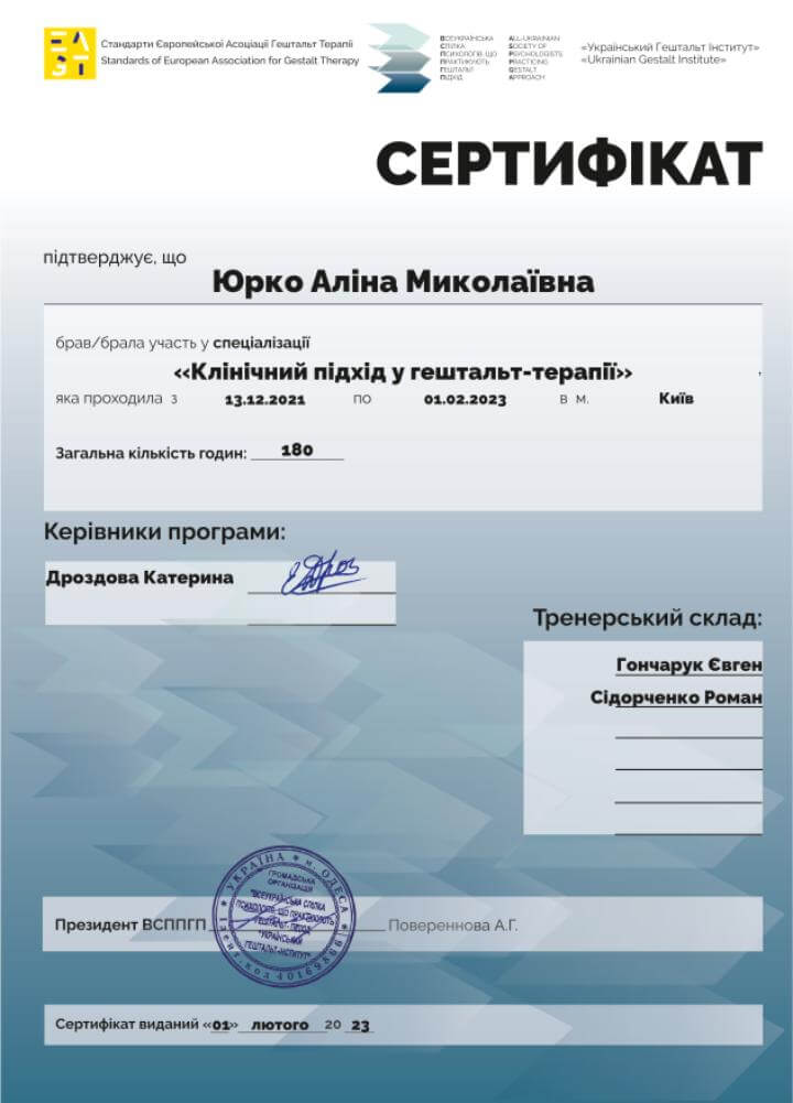 НАГТУ Український Гештальт Інститут, сертифікований та акредитований гештальт-терапевт.