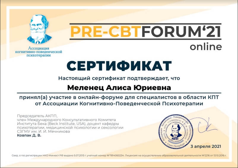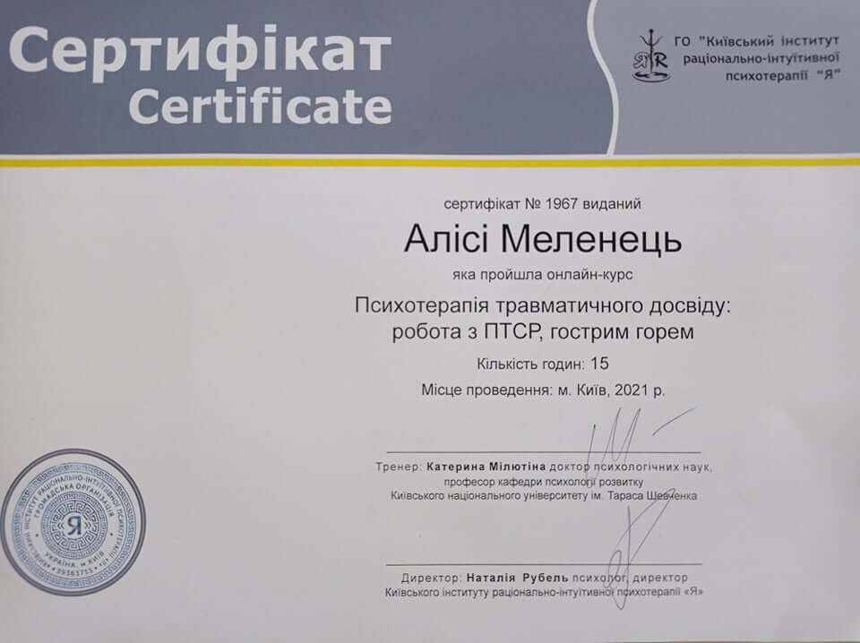 Я свідомо обирала професію і тому на початку шляху здобула вищу освіту за фахом психології на денній формі навчання. Здобувши теоретичну базову підготовку, я пішла розвивати практичні навички, навчаючись методам розмовної психотерапії. У 2017 я завершила першу ступінь підготовки гештальт-терапевтів, зараз продовжую відточувати навички вже на іншому ступені. Пройшла курс з психіатрії для психологів, маю спеціалізації по роботі з травматичним досвідом та пост-травматичним стресовим розладом, постійно приймаю участь у різних тренінгах, конференціях та майстер-класах, відвідую супервізію та інтервізійну групу.