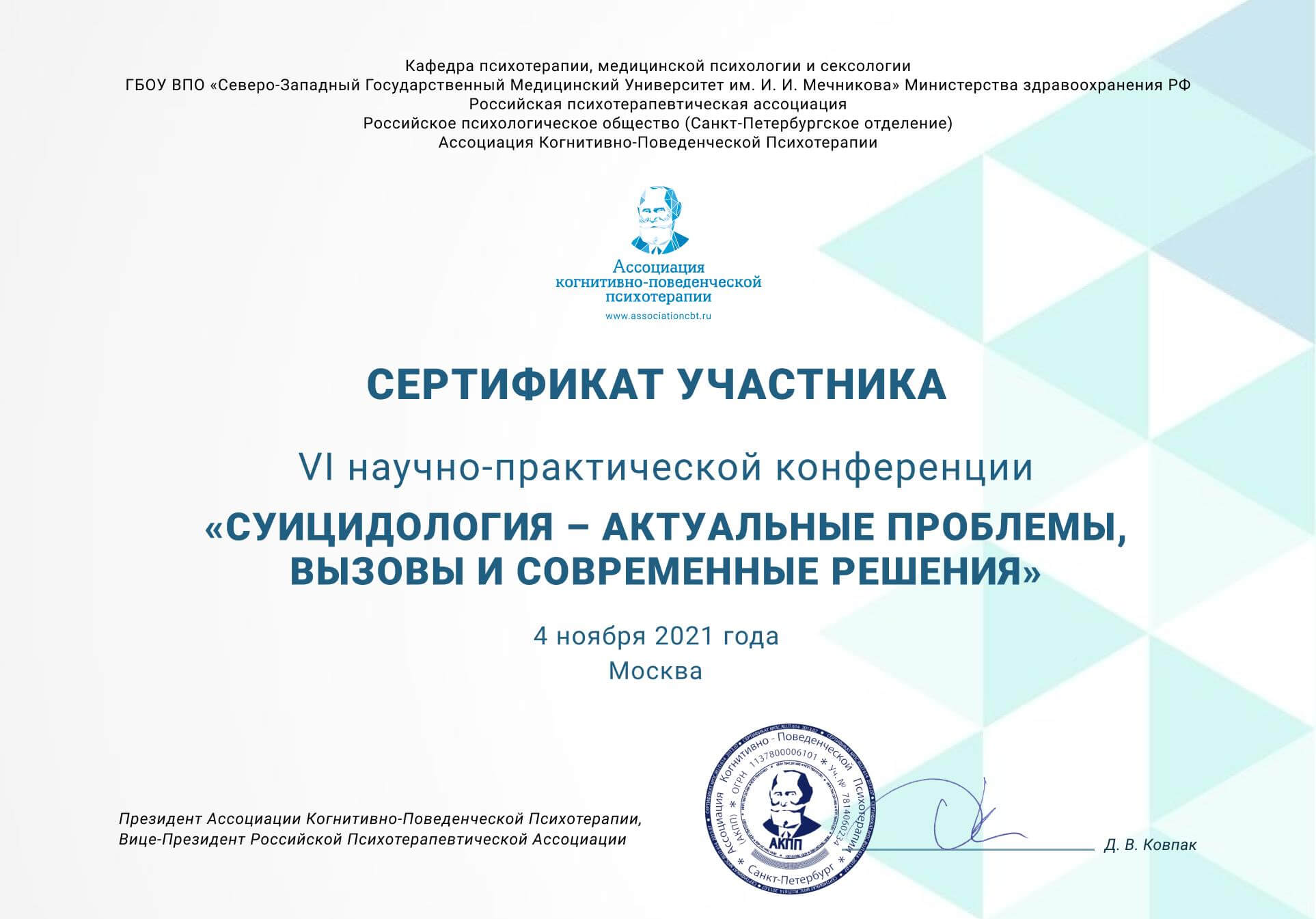 Психіатрія для психологів; Психотерапія травматичного досвіду: робота з ПТСР, гострим горем; Курс з тренінгу навичок психологічного відновлення; Курс з роботи з втратою у дорослих, підлітків та дітей; Курс з основ травматерапії у воєнному контексті та надання першої психологічної допомоги потерпілим; Тренінг з техніки стабілізації; Тренінг з когнітівно-процесуальної терапії та інші (актуальна інформація в інстаграмі та на сайті).