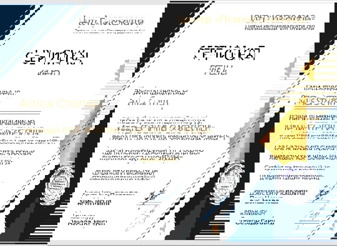 спеціальність «Психологія», спеціалізація «Медична психологія». Диплом про отримання вищої освіти за спеціальністю «Психолог»;