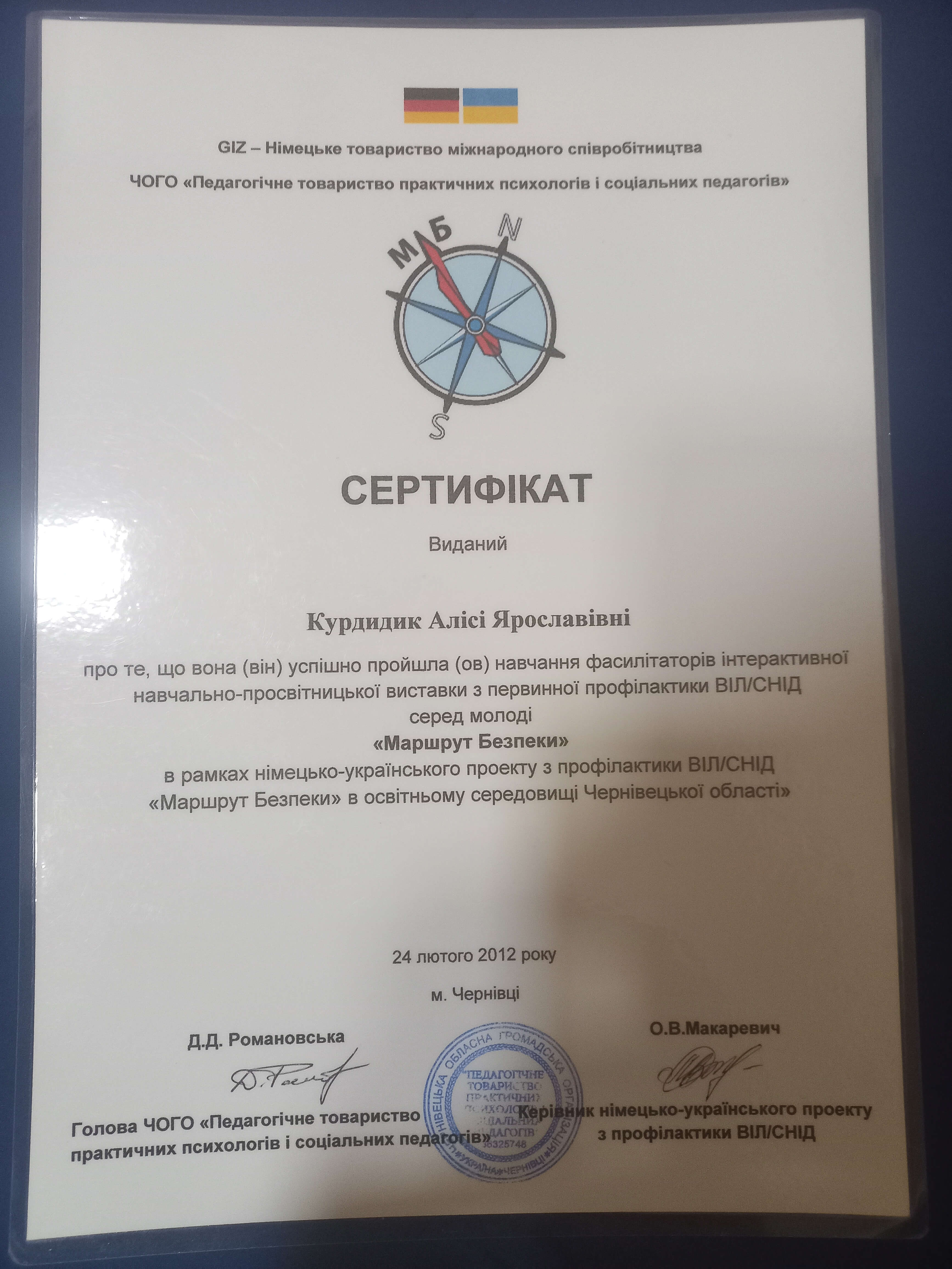 Навчання та участь в якості фасилітатора інтерактивної навчально-просвітницької виставки з первинної профілактики ВІЛ/СНІД серед молоді «Маршрут Безпеки» в рамках німецько-українського проекту з профілактики ВІЛ/СНД «Маршрут Безпеки» в освітньому середовищі Чернівецької області