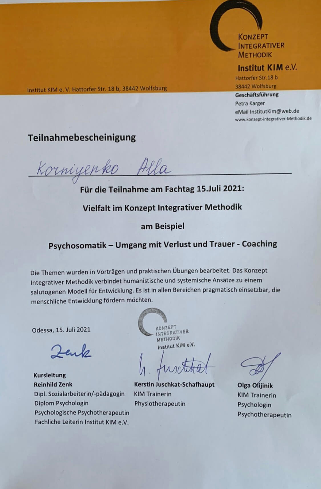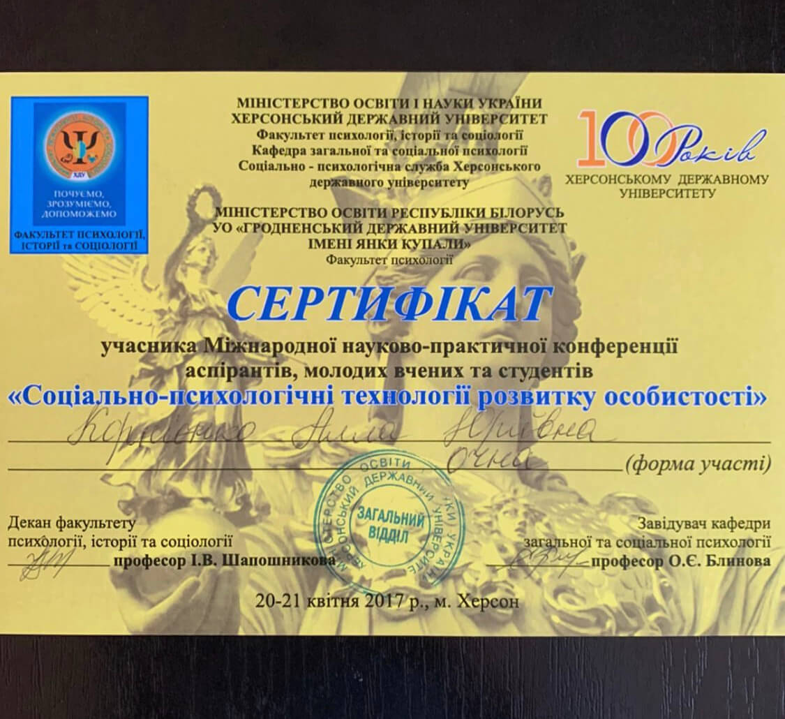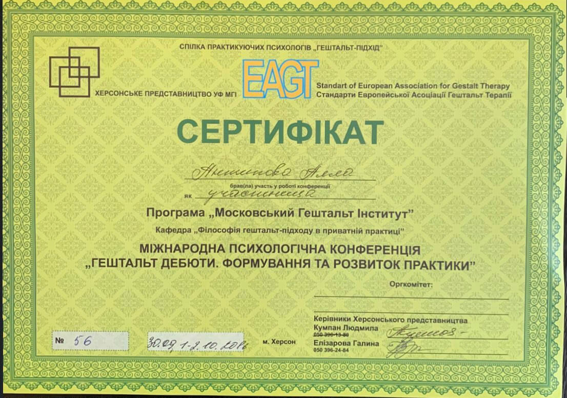 Украинский Гештальт институт - сертифицированный гештальт-терапевт.