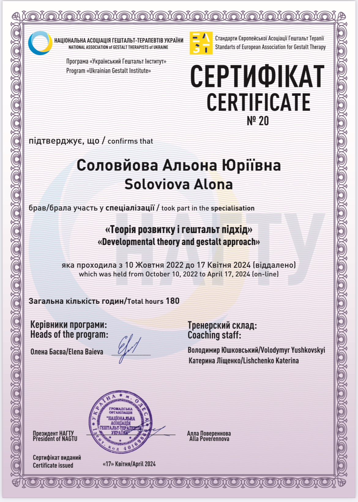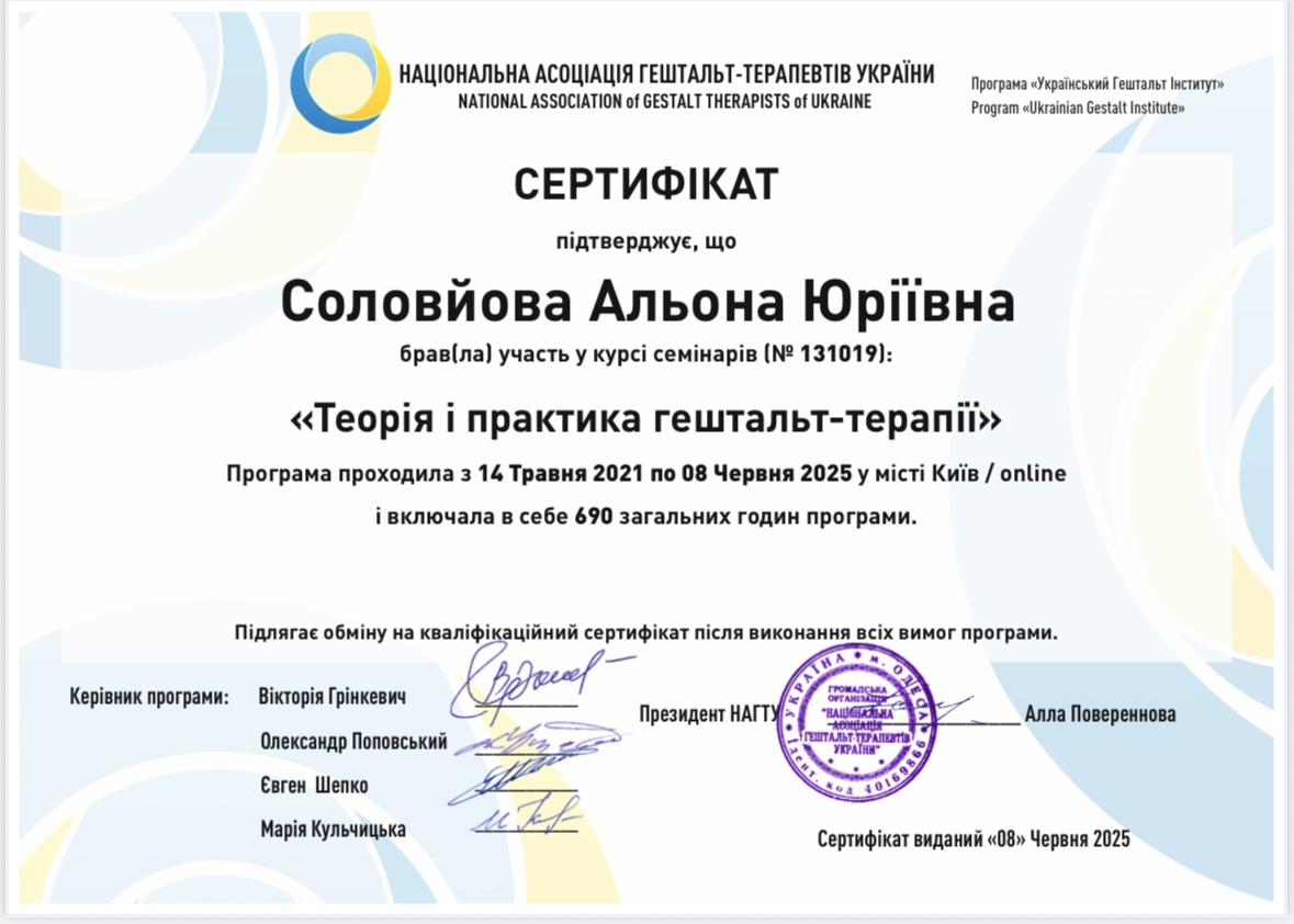 Я працюю за допомогою гештальт підходу. Це напрямок психотерапії, який за допомогою усвідомленості допомагає пізнати себе; визначити свої потреби і цінності; розібратись в своїх емоціях, почуттях і бажаннях на глибинному рівні; навчитись вибудовувати комфортні для вас стосунки з оточенням; покращити свій психо-емоційний стан. Цей підхід вчить концентруватися на реальному моменті і усвідомлювати себе в ньому.