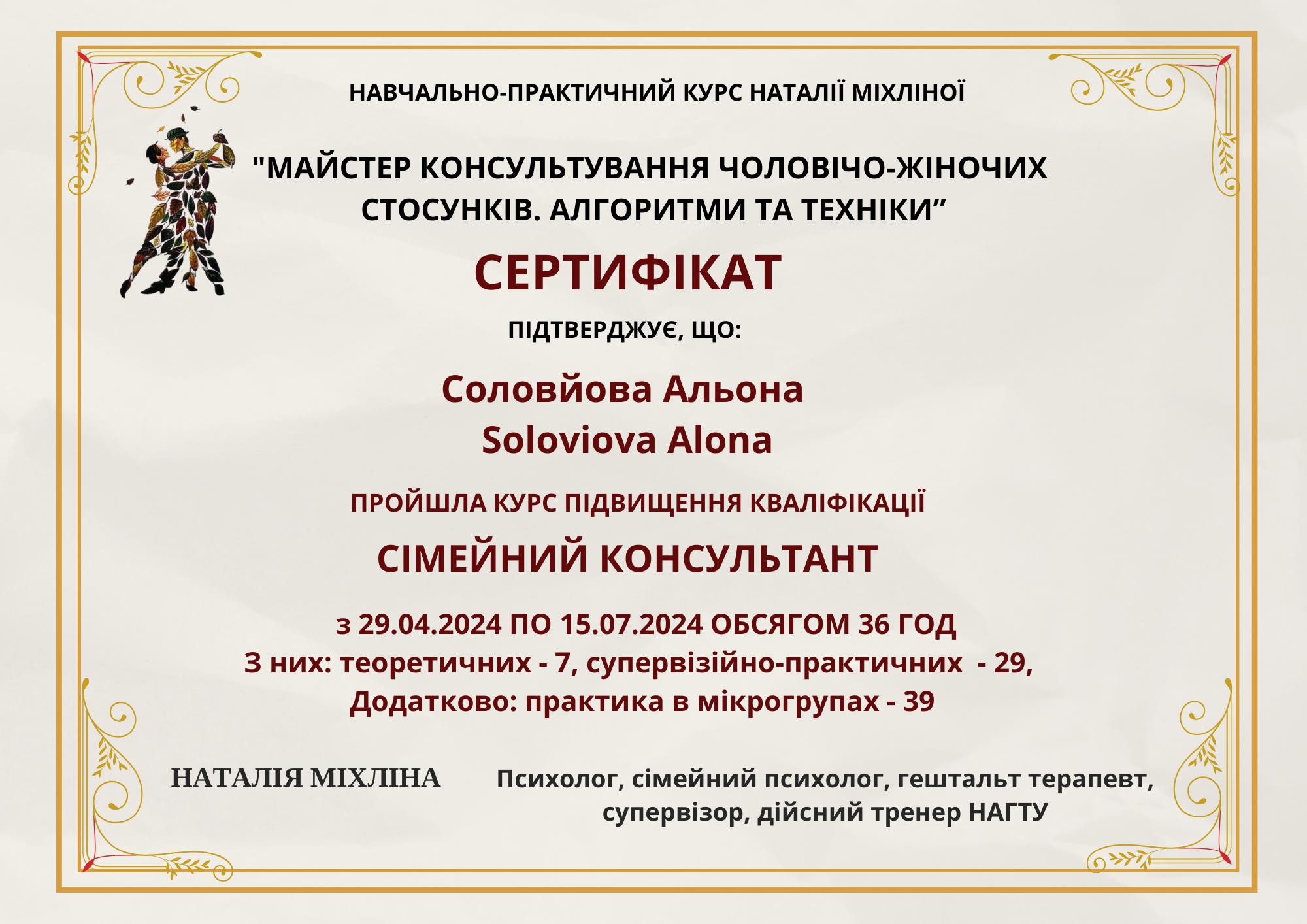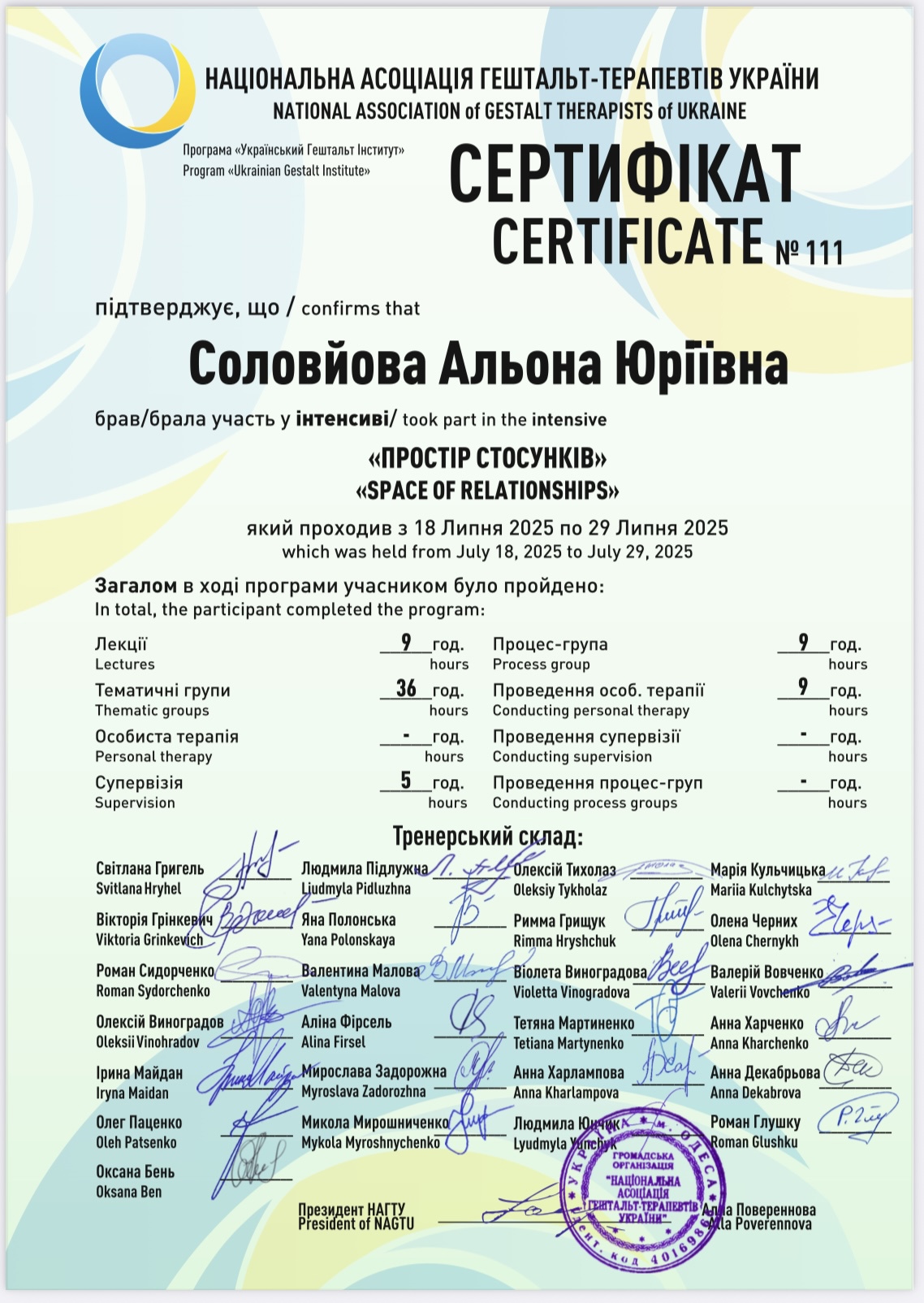 Привіт! Мене звати Альона, я психолог, гештальт-терапевт. Мені 36 років, я одружена, у мене є дев'ятирічна донька. Велику частину свого життя я прожила в Донецьку. З 2014р. вже встигла пожити в таких містах як Святогірськ, Маріуполь, Кам'янське, Хмельницький і Одеса. Зараз я вже 3 роки проживаю в Києві.