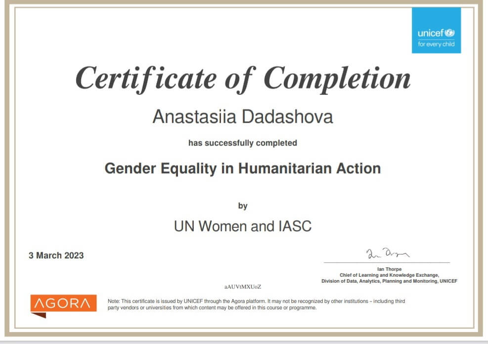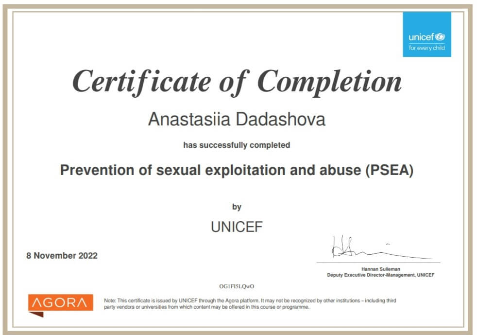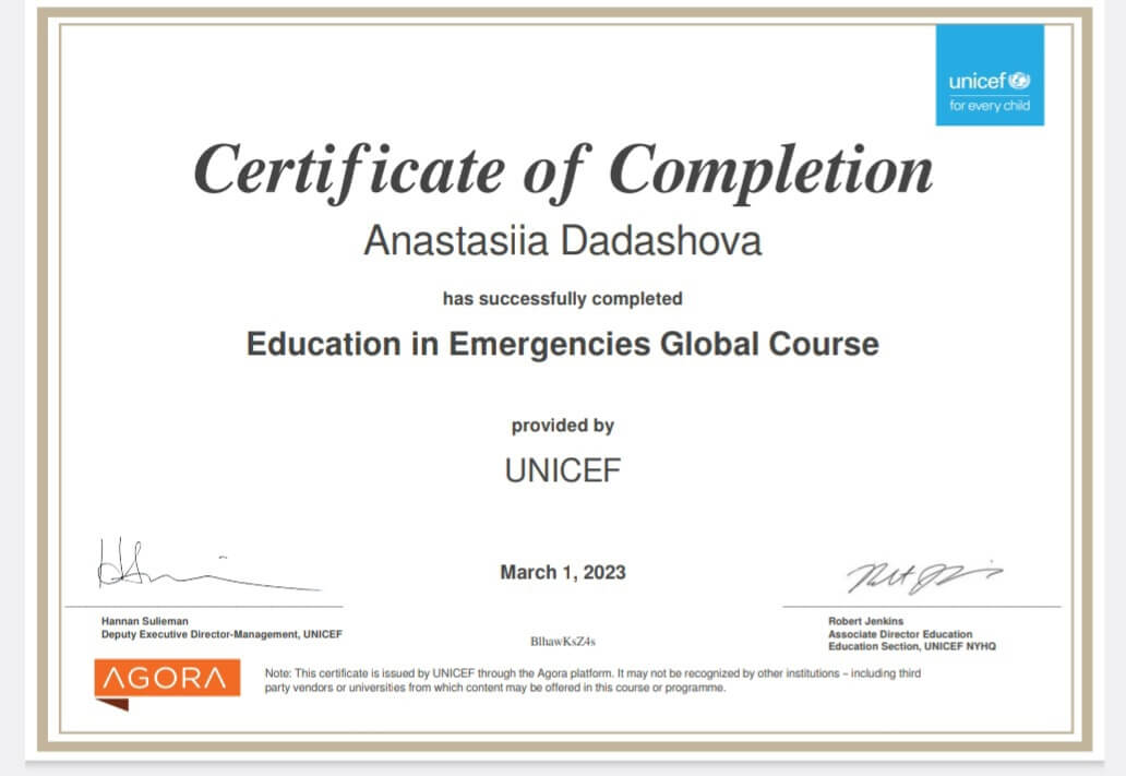 Друга вища освіта (Магістратура) з психології у Запорізькому національному універсететі. Пройшла наступні курси:1. Safeguarding children and child protection. 2. Certificate of Completion in Emergencies Global Course. 3. Certificate of Completion Provention of sexual exploitation and abuse ( PSEA) 4. Certificate of Completion Gender Equality in Humanitarian Action (IASC).