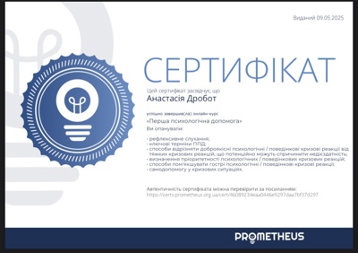 Наразі продовжую професійний розвиток: у 2025 році проходжу навчання на міжнародному курсі Shapes of Grief, який присвячений темам втрати та горювання.