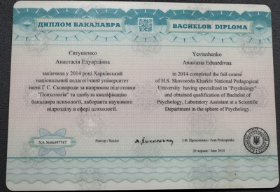 Маю базову психологічну освіту — у 2010–2014 роках навчалася в Харківському національному педагогічному університеті імені Г. С. Сковороди за спеціальністю «загальна психологія».