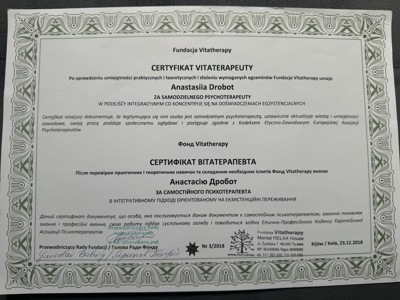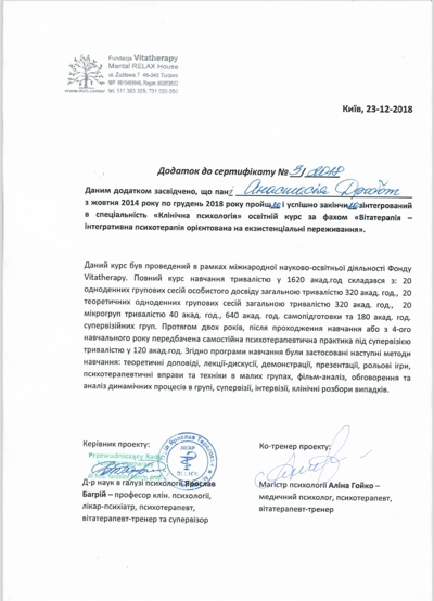 Vitatherapist (2014–2018) — поглиблене навчання в екзистенційному підході до психотерапії. Робота з темами сенсу, свободи, відповідальності, ізоляції, смерті та вибору.