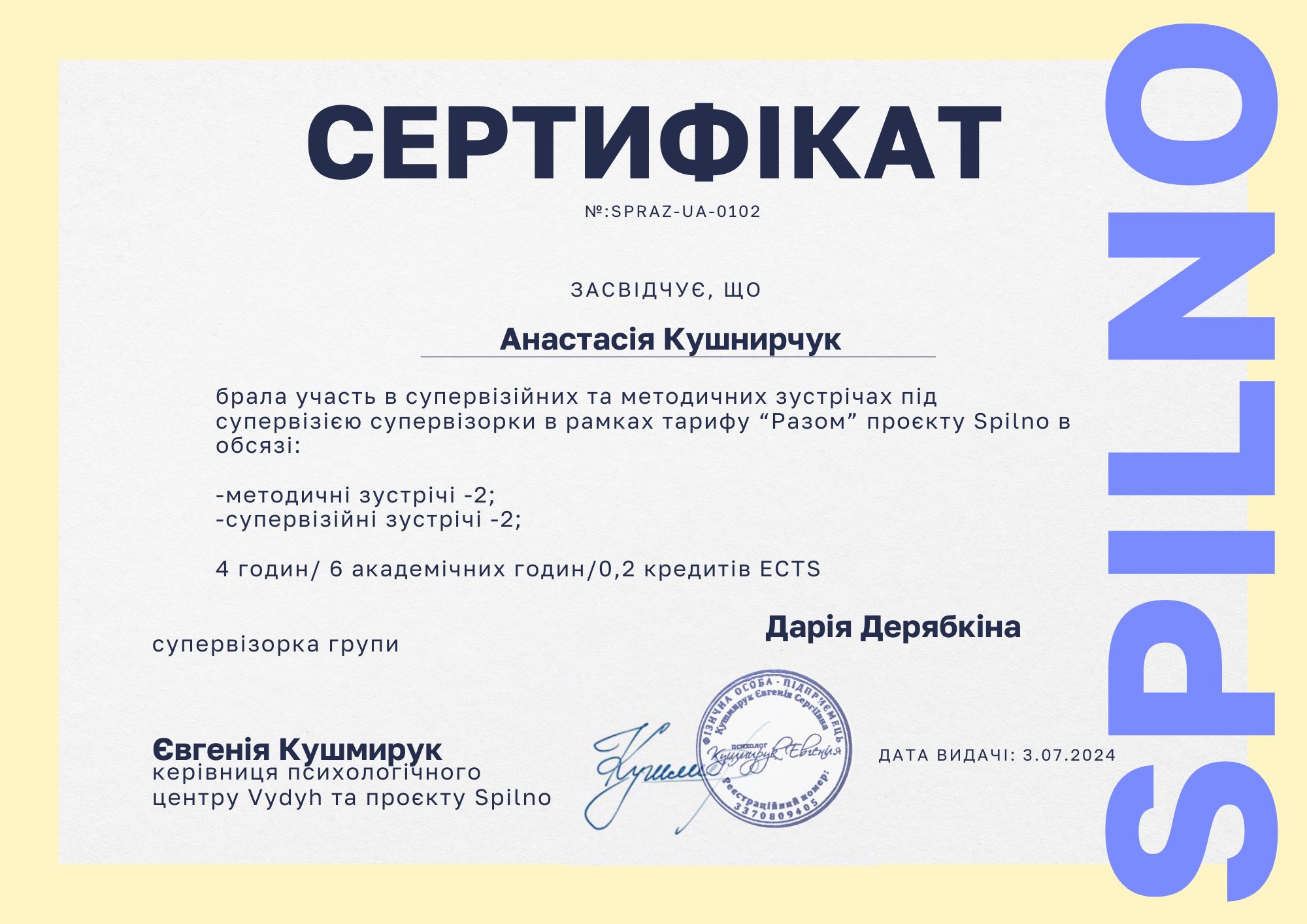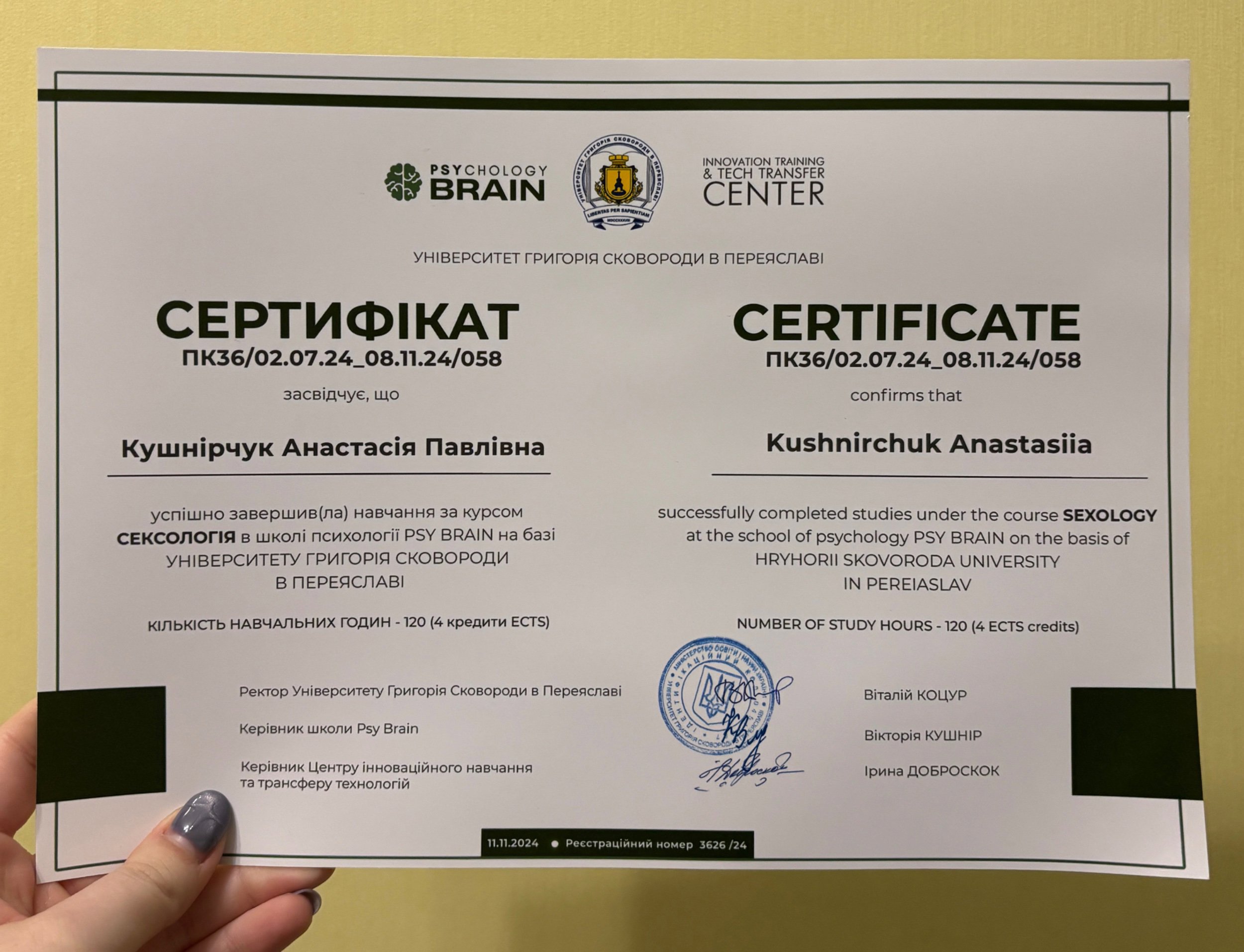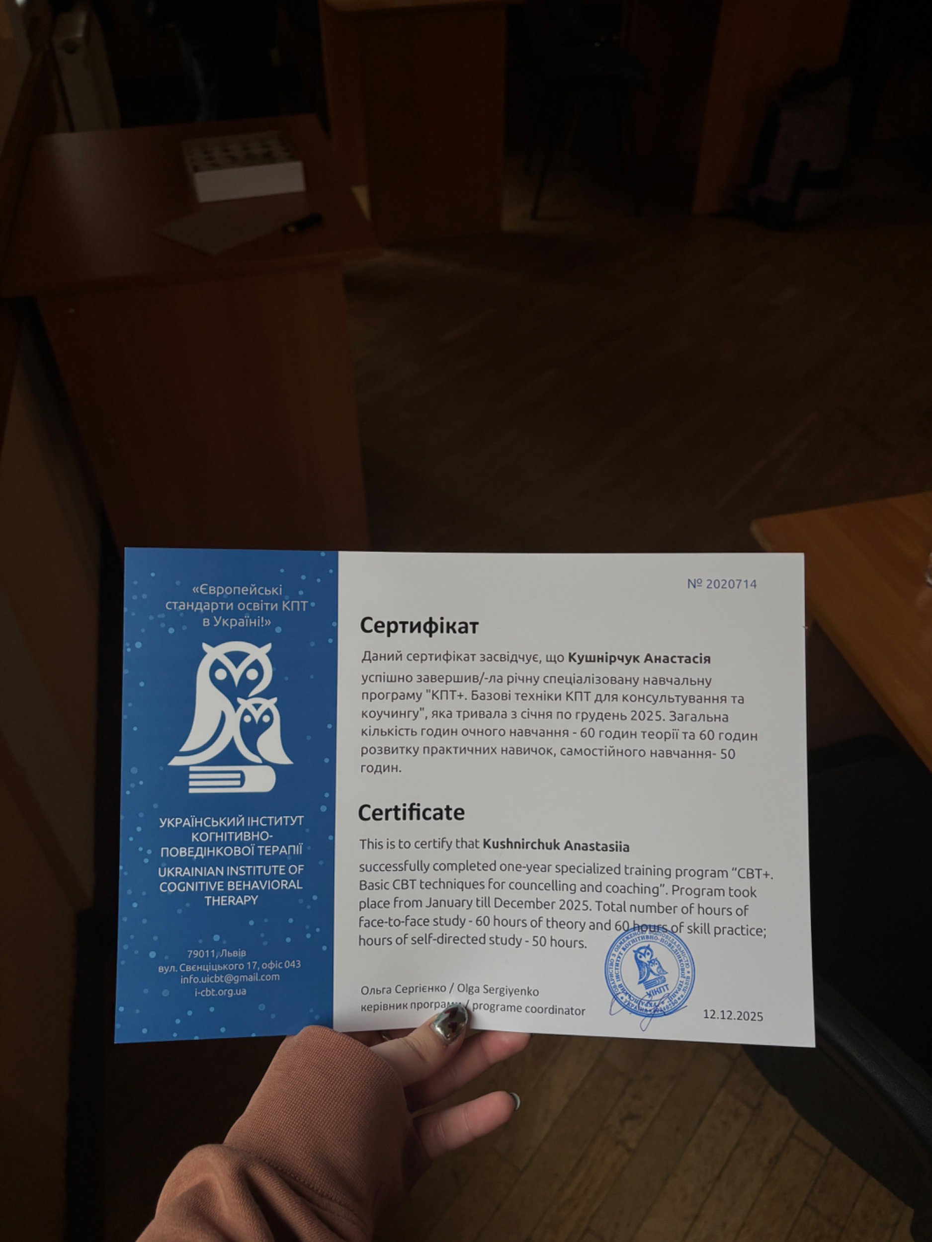 У житті я, окрім психології, також маю хобі, яке є моєю другою роботою - виготовляю прикраси з натурального каміння. Цей процес дозволяє мені більше розслабитись та зайняти руки, коли є бажання (та замовлення, звісно). Також люблю ходити на йогу, читати книжки (в основному художню літературу). Найбільше заспокоєння мені дають детективи та трилери, де тебе довго тримають у напрузі.