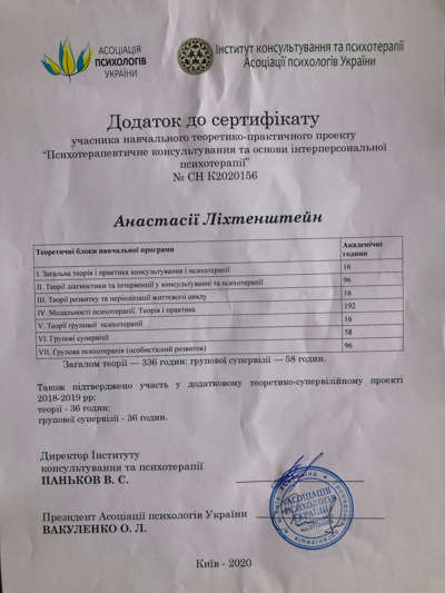 — Інститут консультування і психотерапії АПУ, сертифікований психолог-консультант у методі «Інтерперсональна психотерапія», 336 годин
