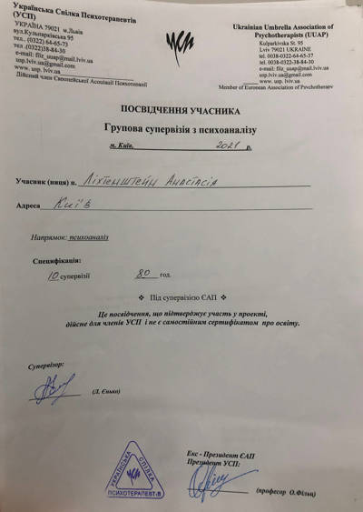 Регулярно підвищую кваліфікацію, відвідуючи інтервізійні та супервізійні групи (понад 250 годин). Також слухаю лекції та семінари у своєму психотерапевтичному підході.