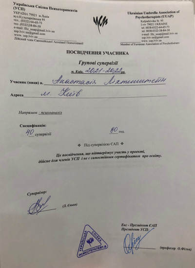 — 2018-2019 — теоретико-супервізійний груповий проект (на базі Інституту консультування і психотерапії АПУ), теорії 36 годин, групової супервізії 36 годин