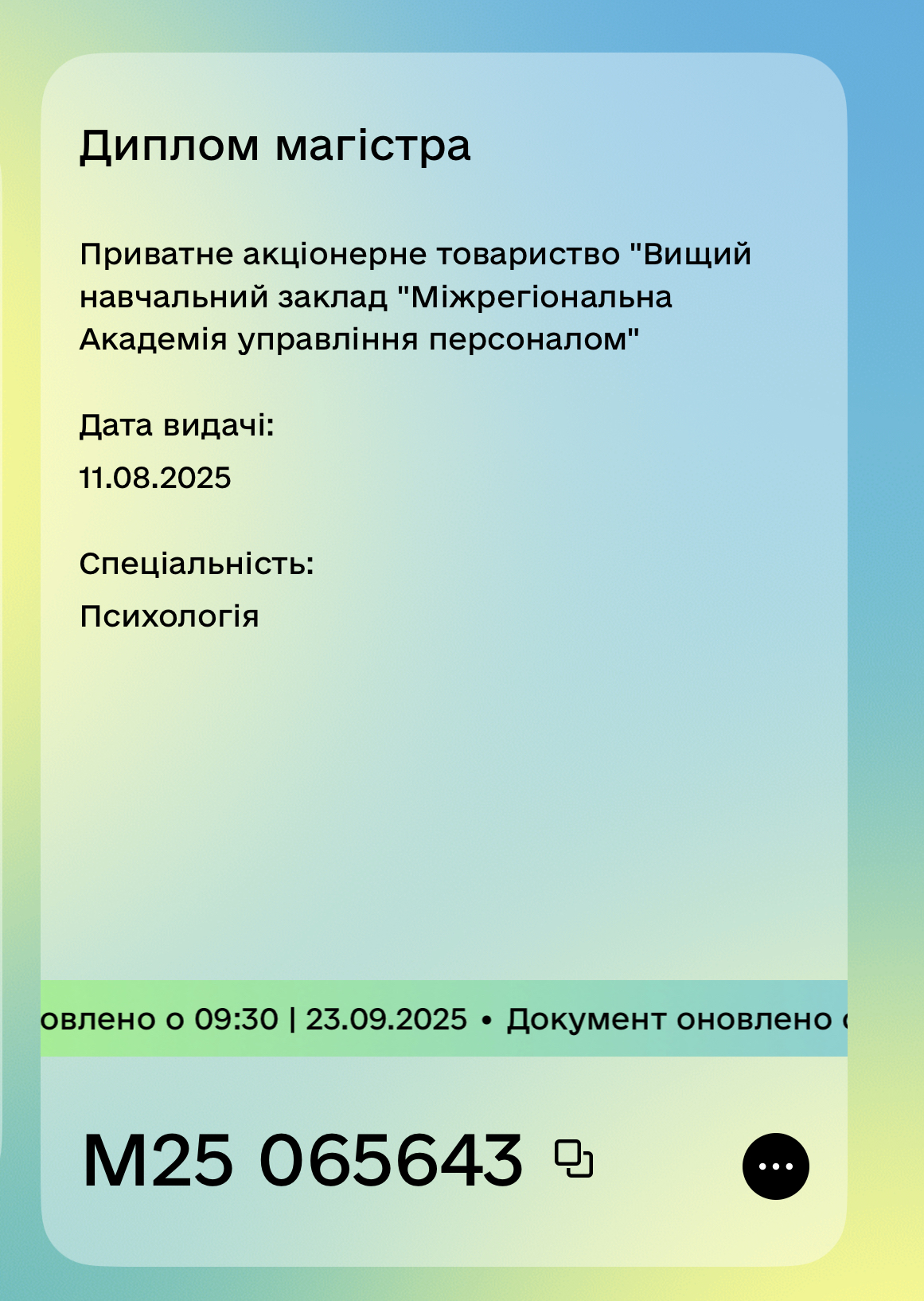 Психотерапія навчила мене бути з собою чесною й уважною. Я стала краще чути свої почуття, потреби та межі — і сміливіше їх поважати. Замість постійної самокритики з’явилося співчуття до себе, замість поспіху — здатність зупинятися й усвідомлювати, що зі мною відбувається тут і тепер. Я навчилася витримувати складні емоції, не тікаючи від них і не знецінюючи себе. Психотерапія дала мені внутрішню опору та відчуття живого контакту — з собою й з іншими. Саме з цього досвіду народжується моя робота як терапевтки: з поваги, прийняття та віри в здатність людини змінюватися.