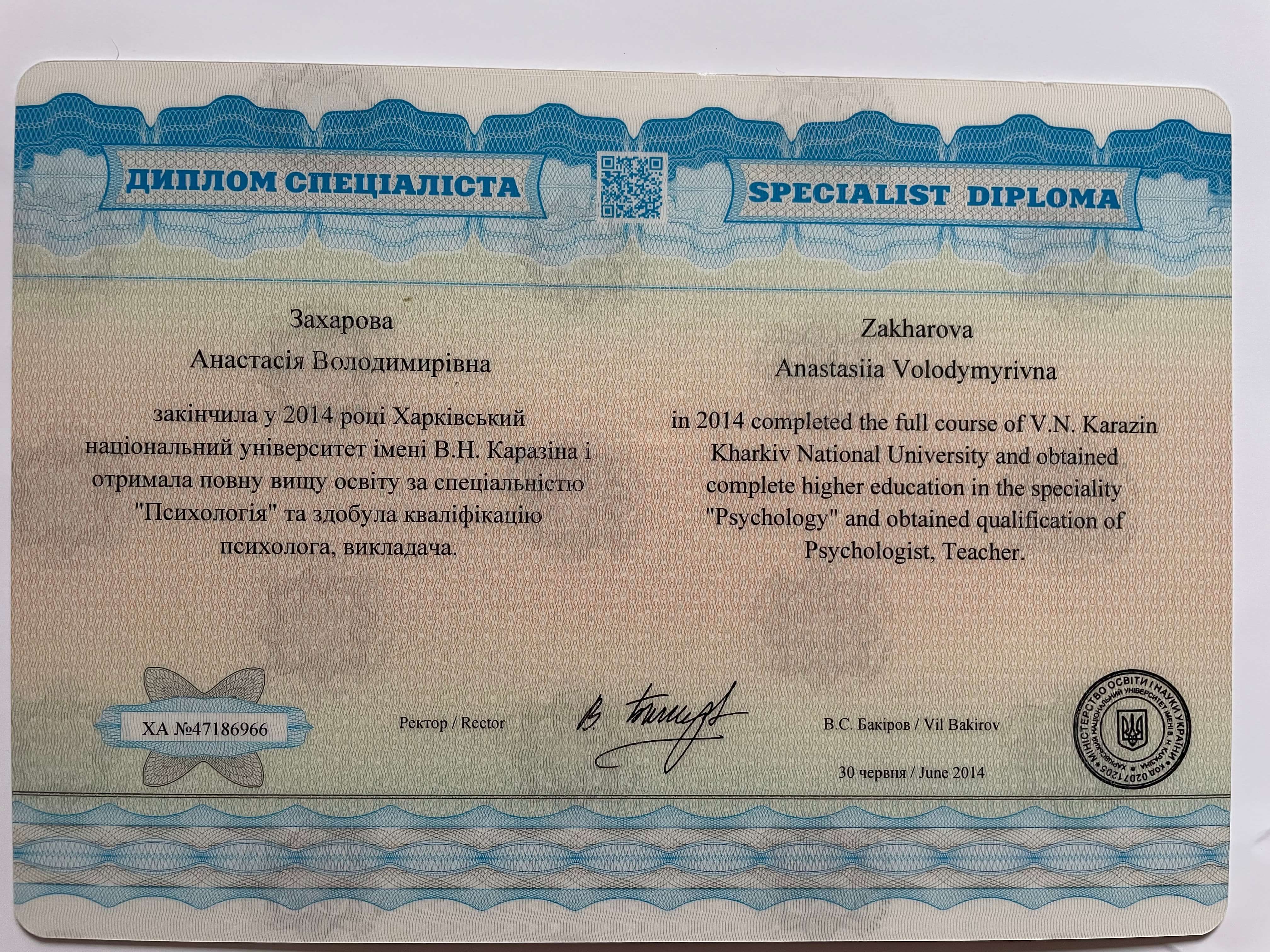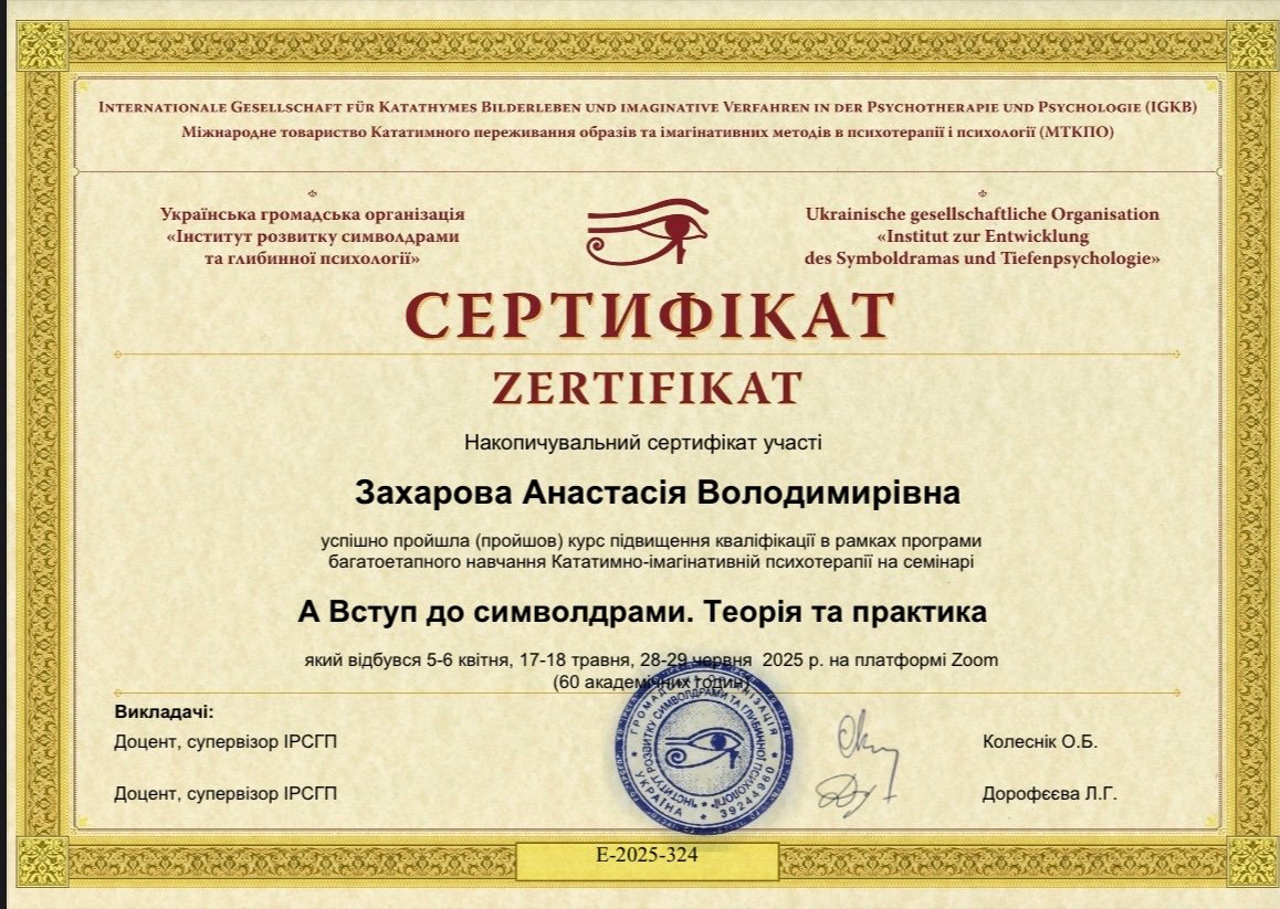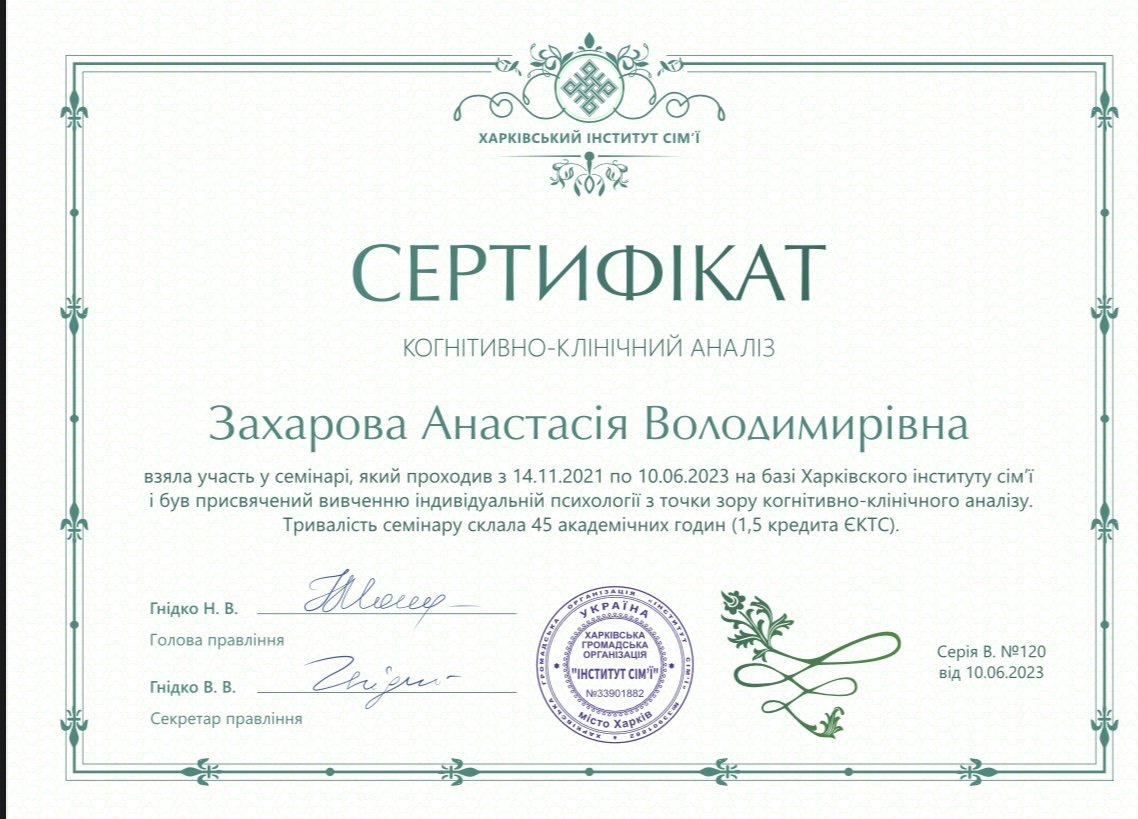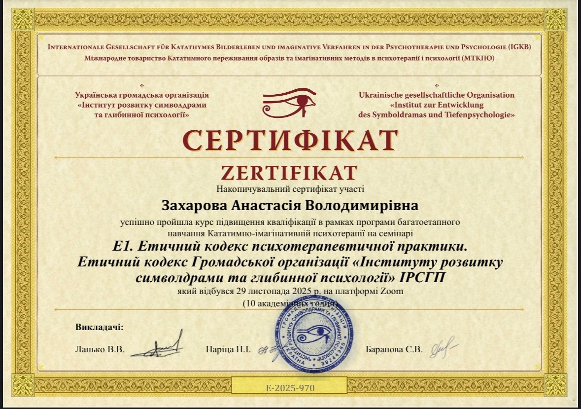Мене звуть Анастасія, і я працюю психологом уже понад 11 років. Працювала у приватній школі психологом та займалась приватною практикою консультування. Основну освіту я здобула у ХНУ імені В.М. Каразіна на факультеті психології. Додатково закінчила безліч курсів, семінарів які допомогли мені заглибитися у спеціальність та працювати ефективно.